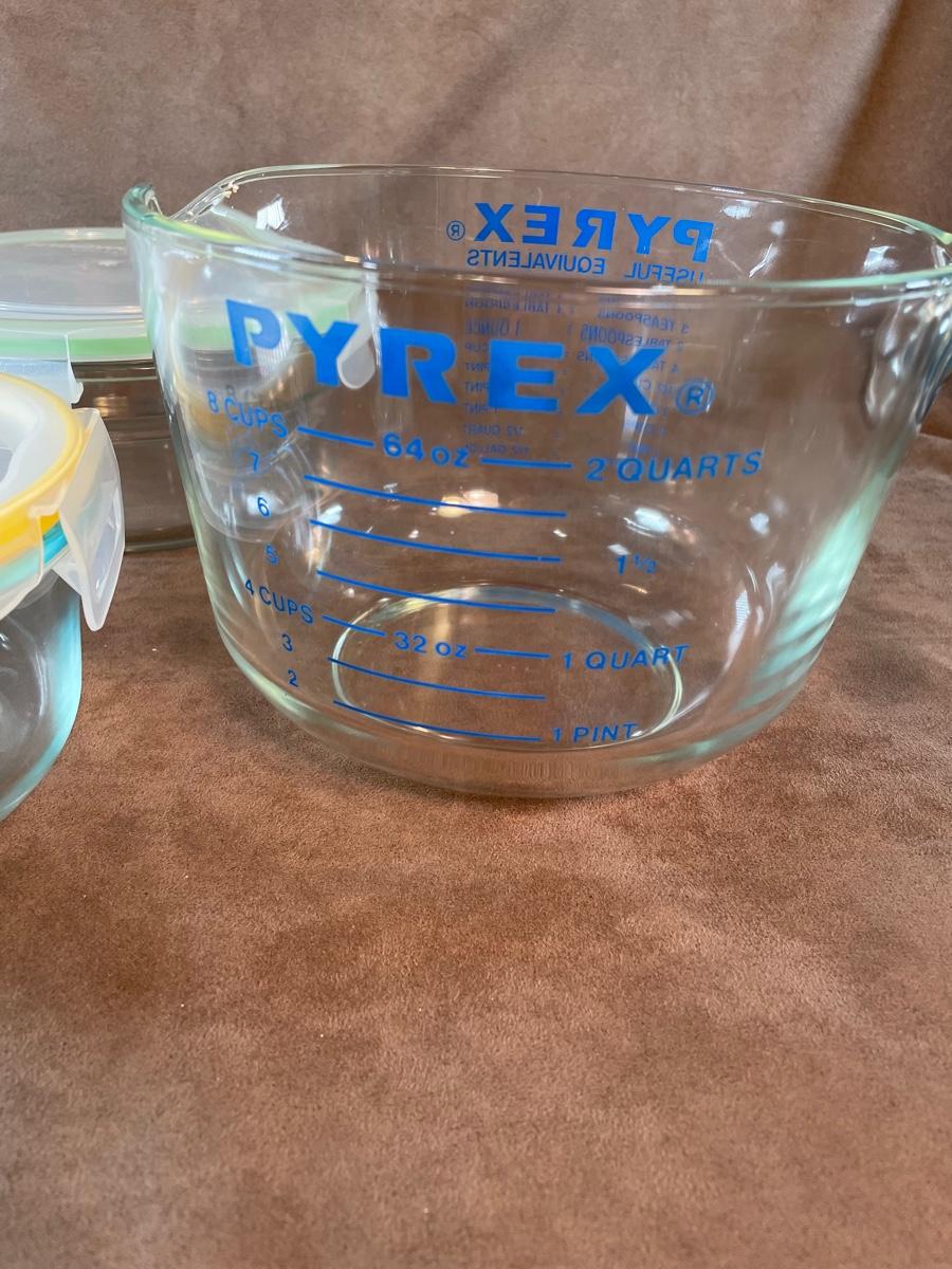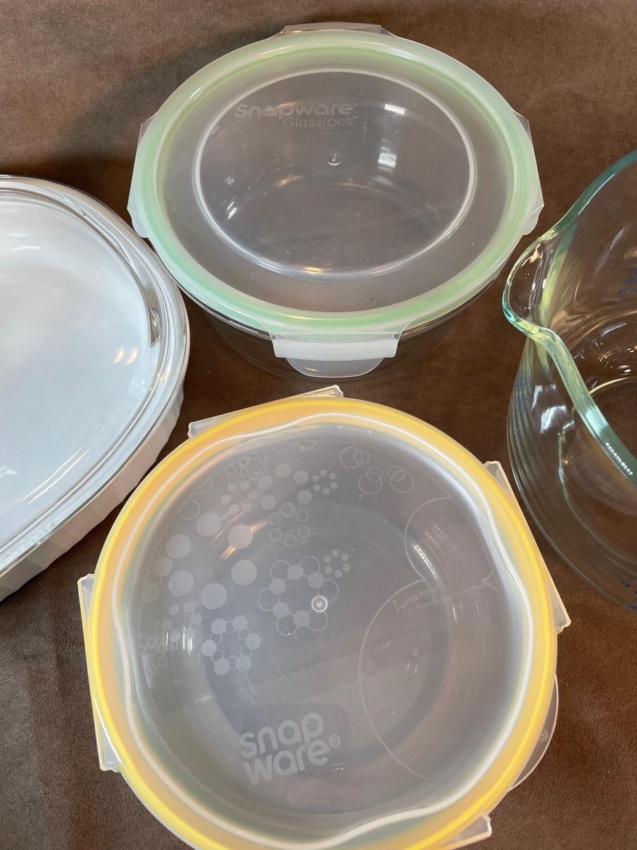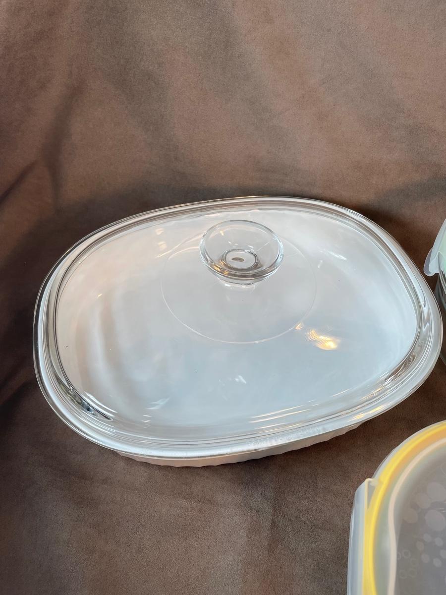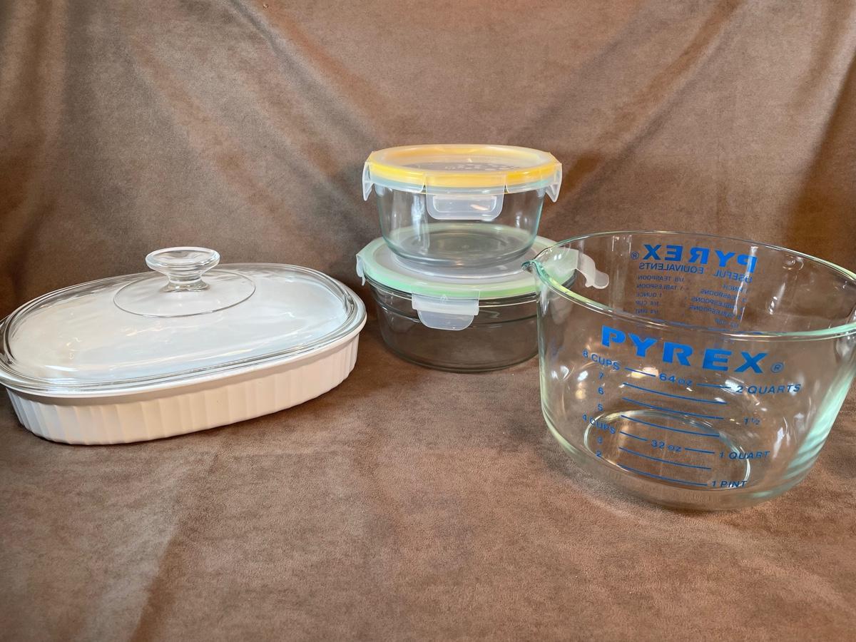 Corning French White covered casserole, 2 Snapware covered glass storage dishes and a Pyrex 8 cup glass measuring cup. Reserve $12
