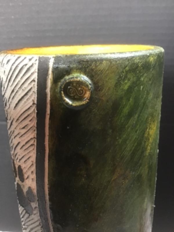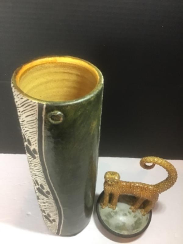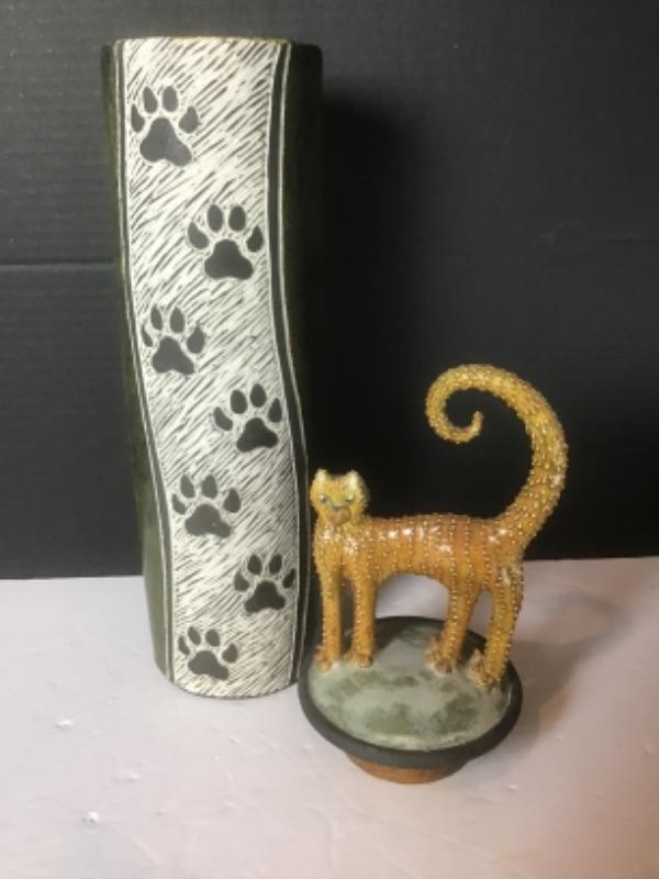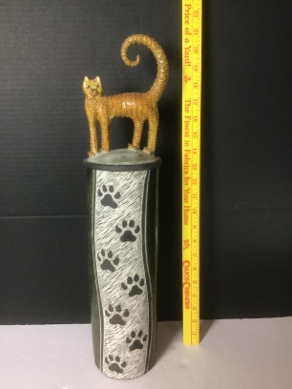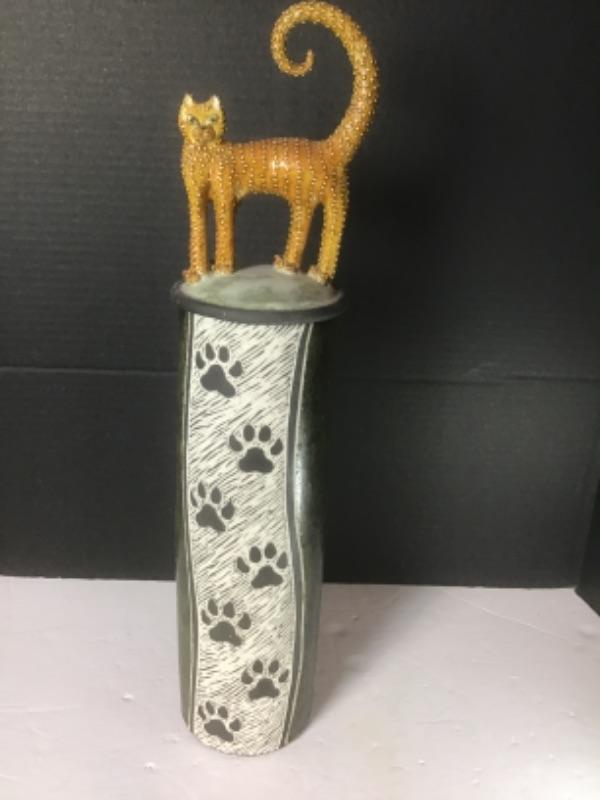 Pottery Jar with Cat Figure Lid - measures 21” Tall x 4” Wide