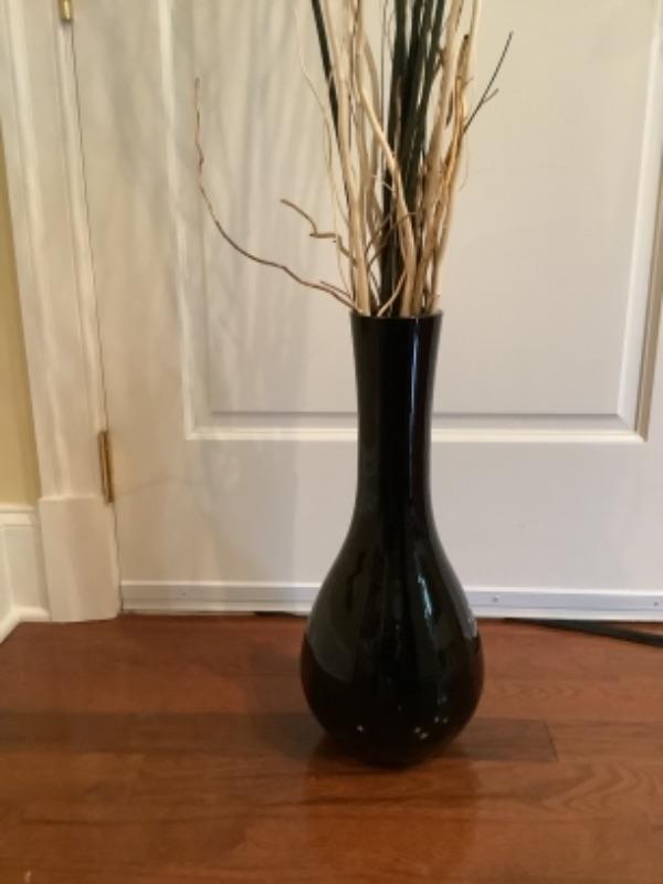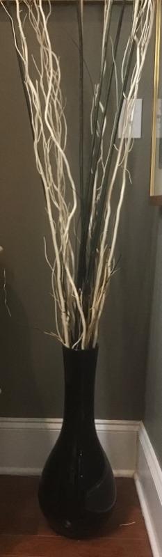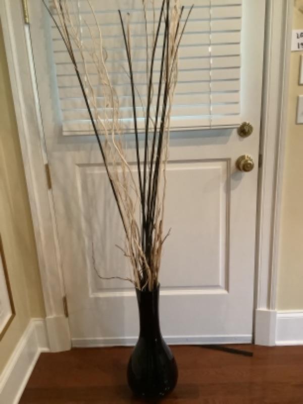 Q - 1279  Large Black Glass Vase with Willow Branches