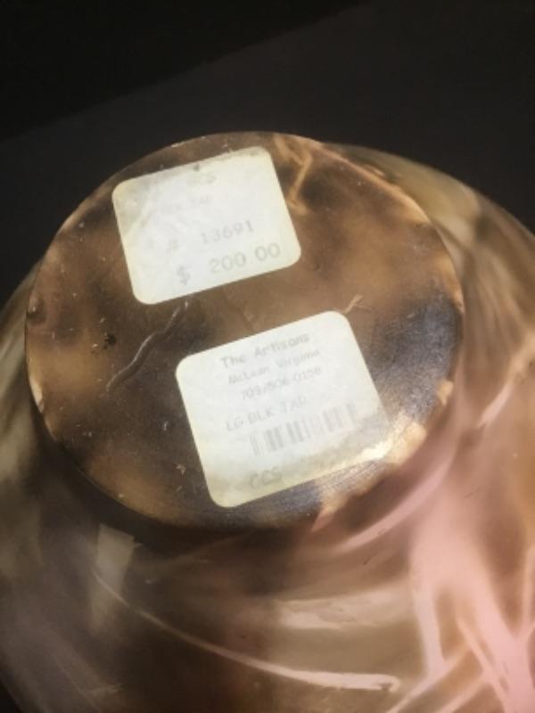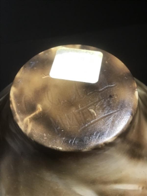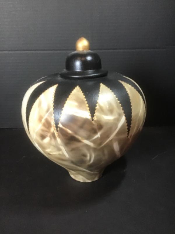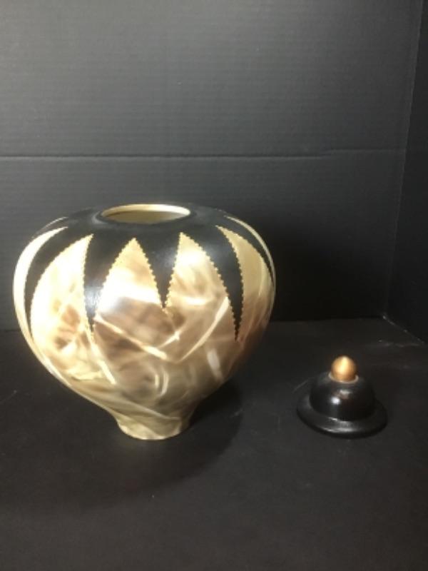 Q - 1282  Artisan Signed Large Tan / Black Pottery Jar with Lid