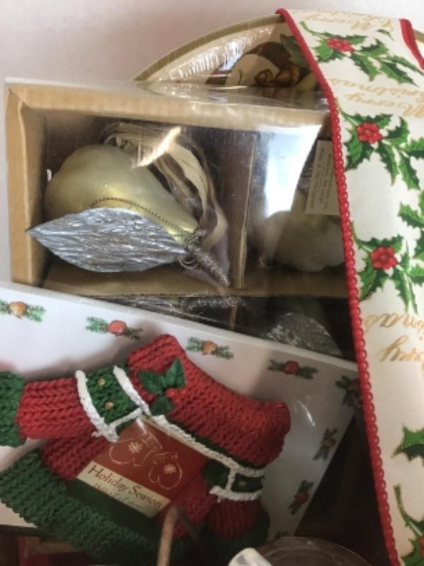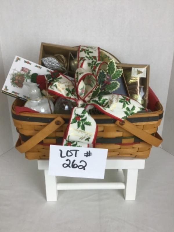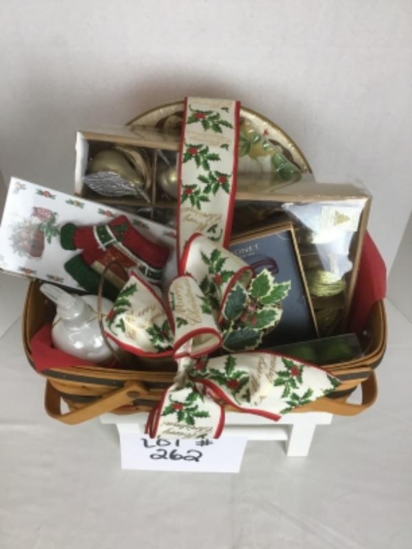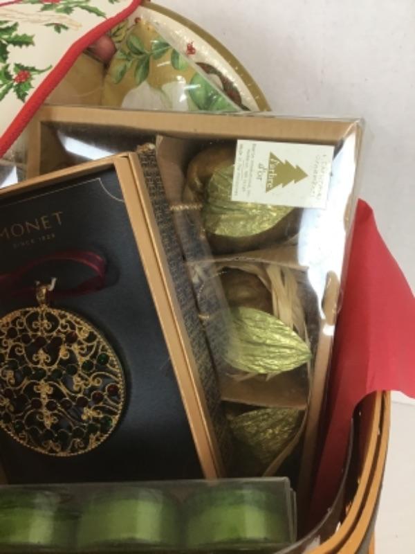 Fun Holiday Longaberger gift basket filled with candles, ornaments, soap/ lotion set , paper products