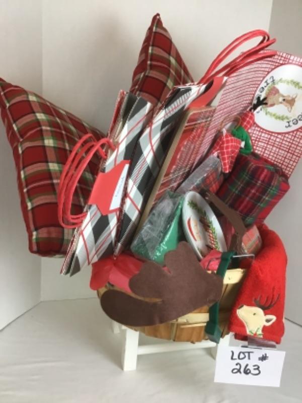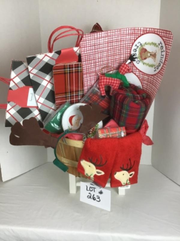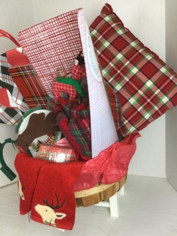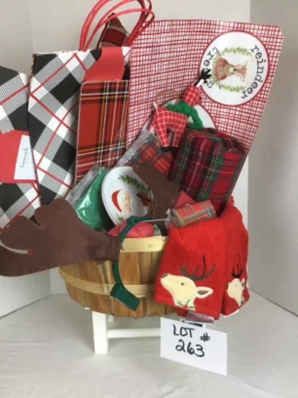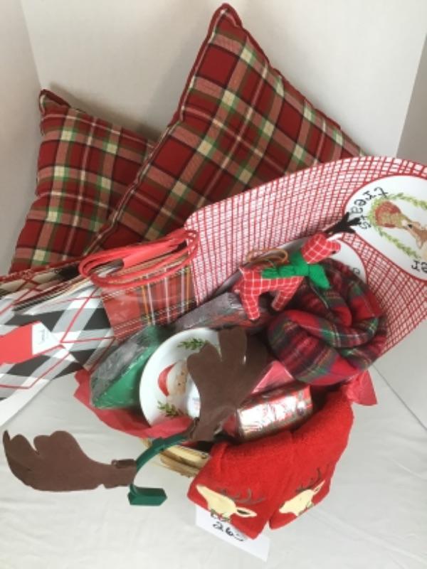 Holiday Reindeer Gift Baske twitch tea towels, pillows, placemats, plates, paper products, gift bags, throw blanket , cookie tins