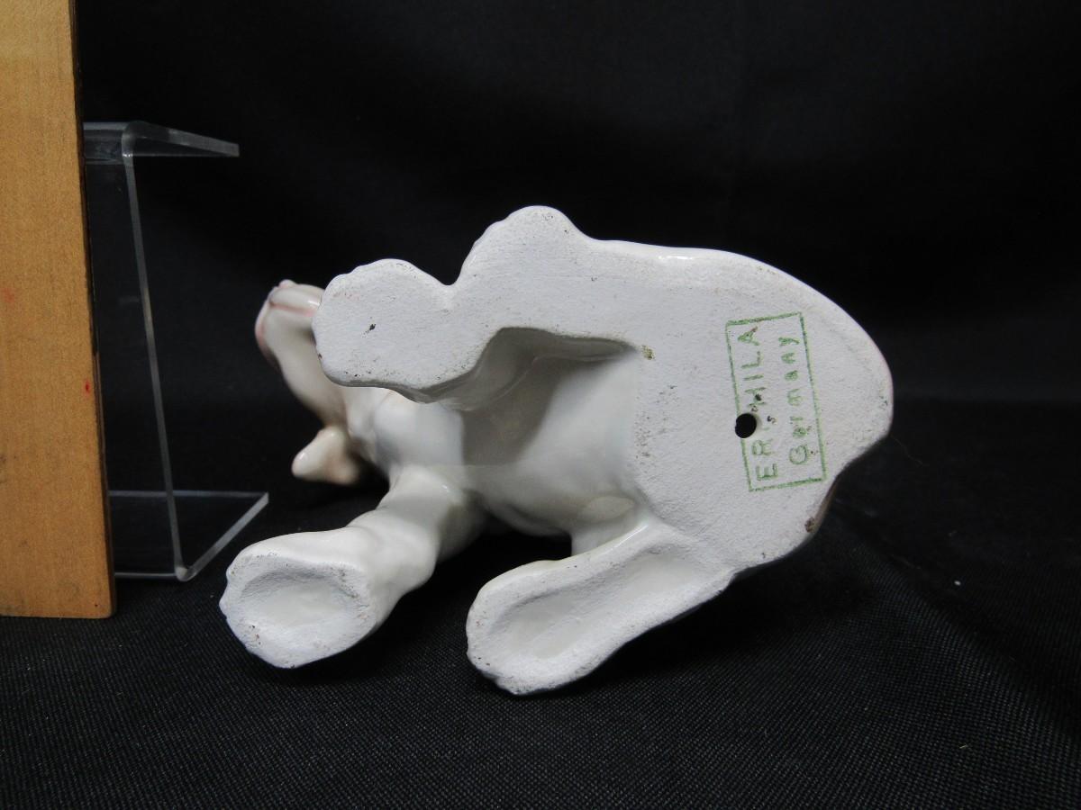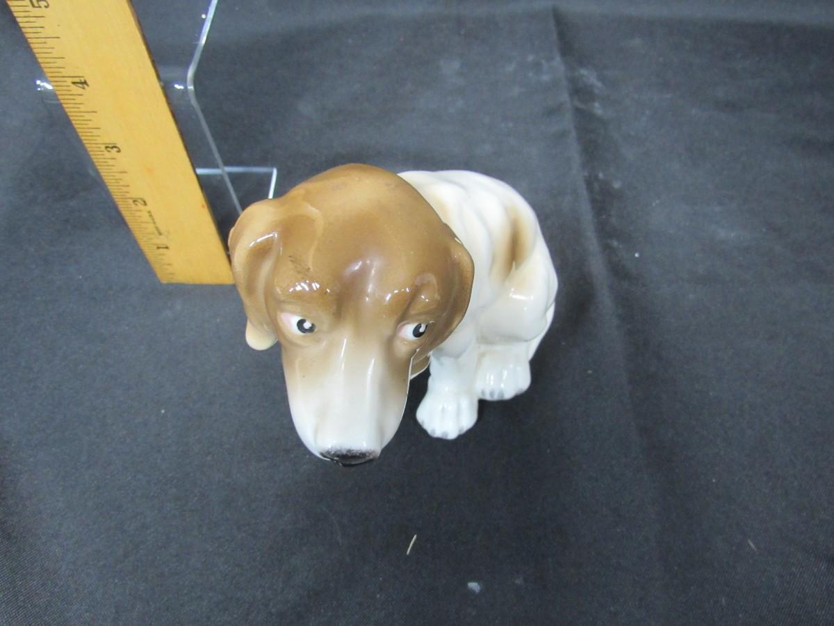 Vintage white & tan dog figurine. Dog is sitting, about 5" tall. Made in Germany. Marked on the bottom.
