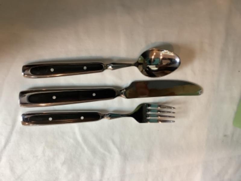 Lot of Oven Mits , 18pc set of Hampton Silversmith Stainless Flatware with yellow 4pc Napkin set with 70’ round flannel backed vinyl tablecloth with a set of 6 braided round summer placemats by DOZZ