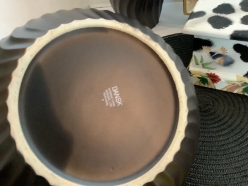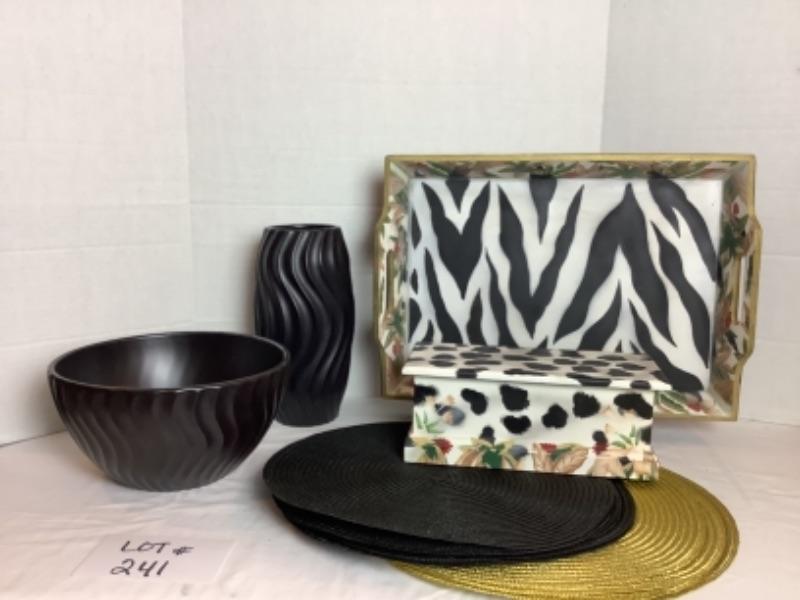 Dansk Black Wave Vase and Bowl with Crate and Barrel Gold and Black Placemats (4 each ) and Painted Animal Print tray measuring 19.25” wide x 13” tall , The bowl measures 10.5” round and vase is 11.25” tall and 5” wide