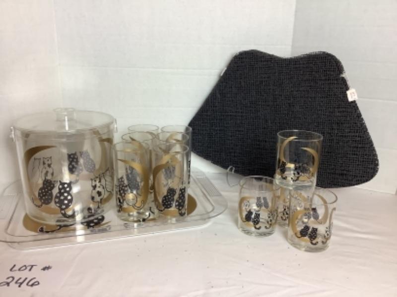 Plastic Black and Gold Serving set with matching tray and ice bucket with 6 high balls and 4 low balls and 8 outdoor placemats (new with tag)