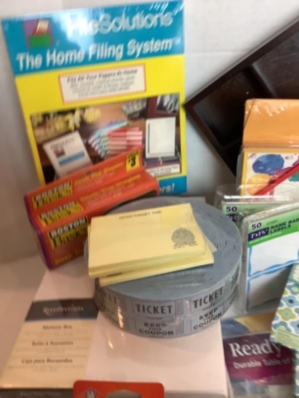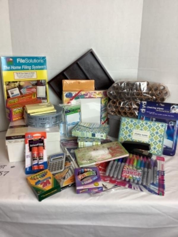 Storage box, quarter rolls, organizer, sticky notes, sharpie markers , staples, ink pens, glue sticks, crayons, chalk and much more