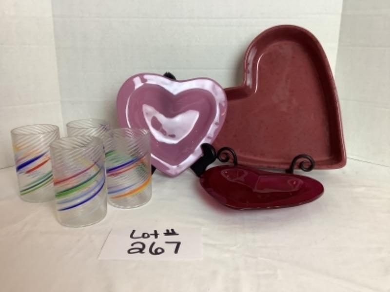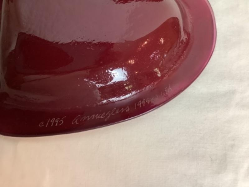 Two pink signed art glass Heart shaped plates by Annie Glass measure into approximately 7.5” with Large pottery heart shaped dish measuring 12”