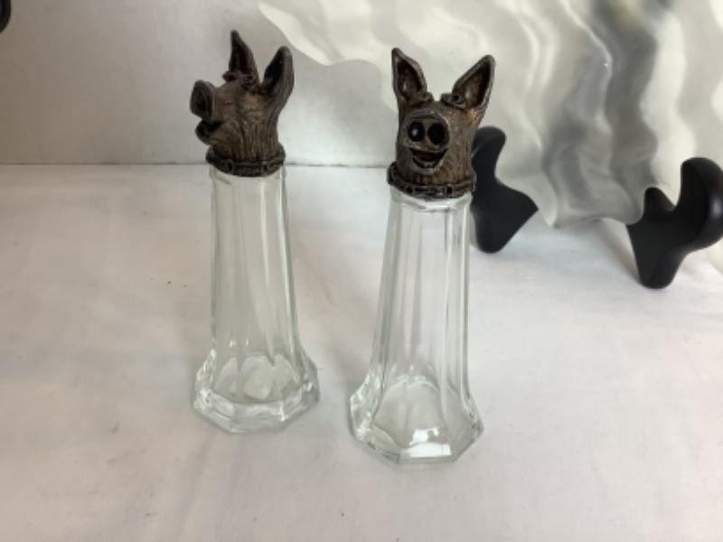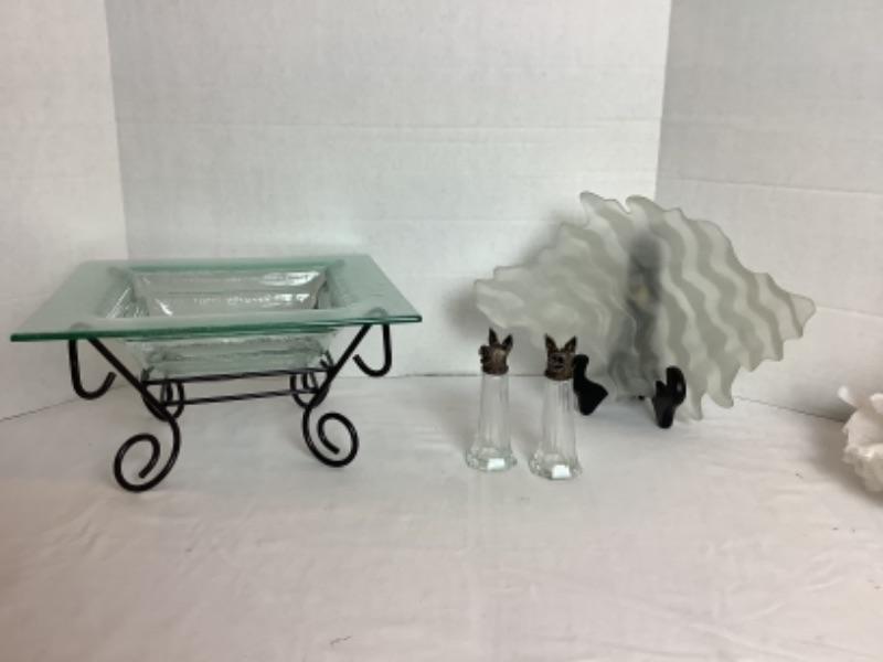 Glass bowl with stand measuring 12” square x 6.5” high with frosted glass wave plate measuring approximately 13” long and pair of Pig head glass salt and pepper shakers by Peoples Pottery