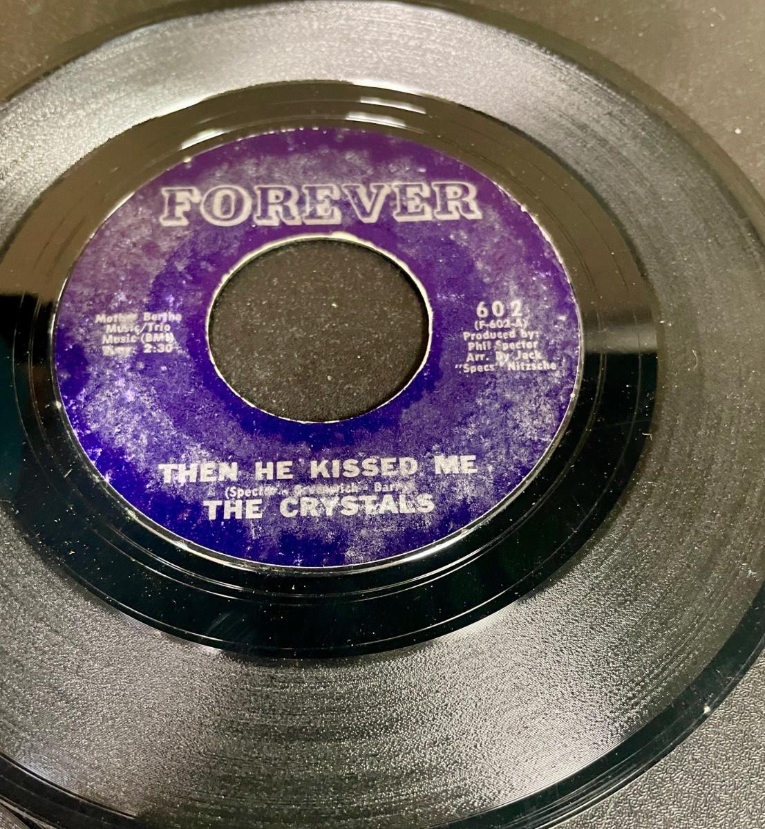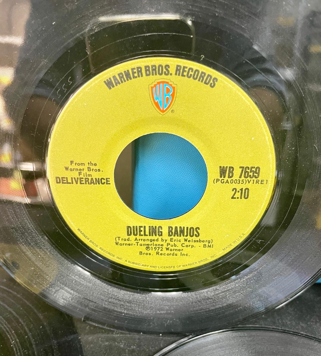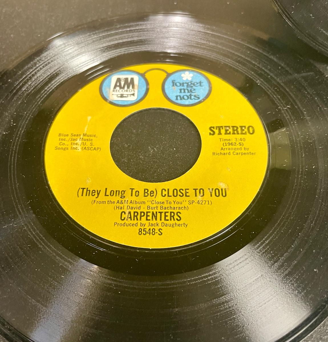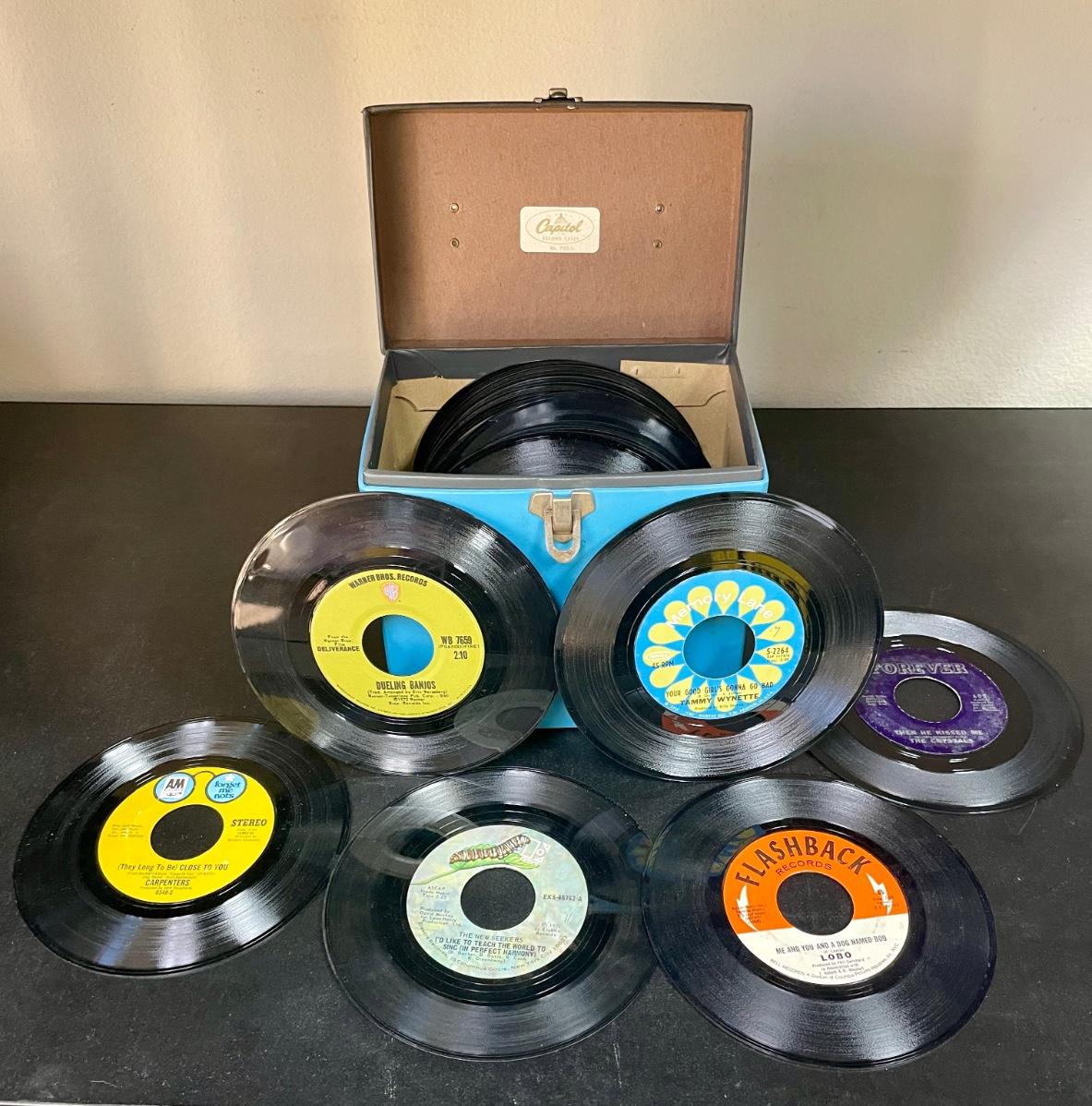 Case is in good condition. Includes 47 records, all in good to fair condition. Examples include: Carpenters "Close to You" on A&M Records, "Dueling Banjos" from Deliverance on Warner Bros. Records, "I'd Like to teach the World to Sing" by the Seekers on Elecktra Records, "Me and You and a Dog Named Boo" by Lobo on Flashback Records, "Your Good Girl's Gonna Go Bad" by Tammy Wynette on Memory Lane Records, and "Then He Kissed Me" by the Crystals on Forever Records.