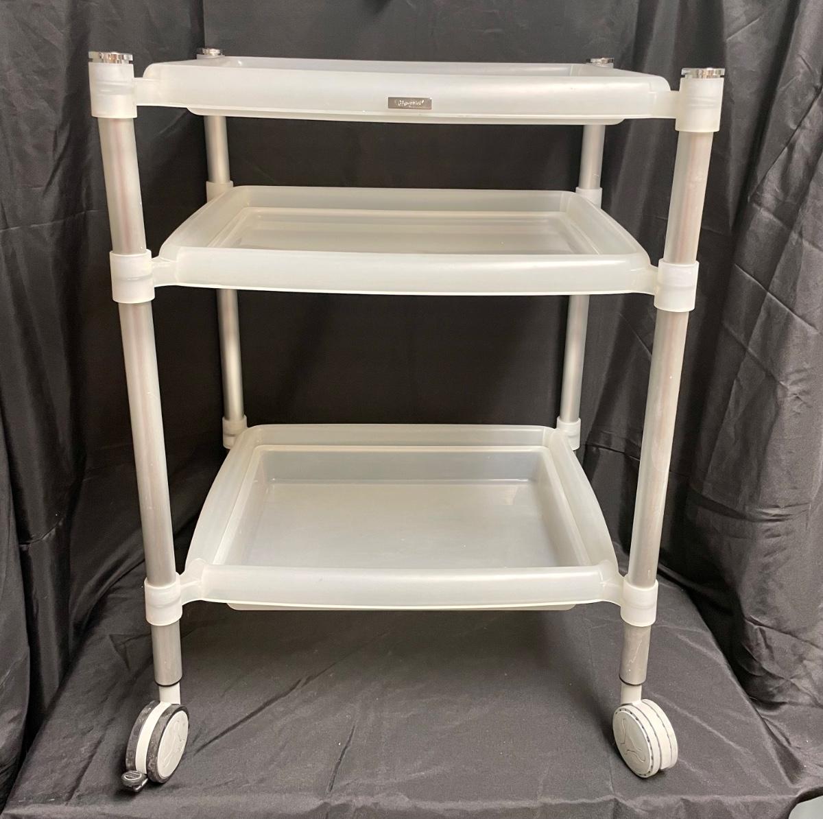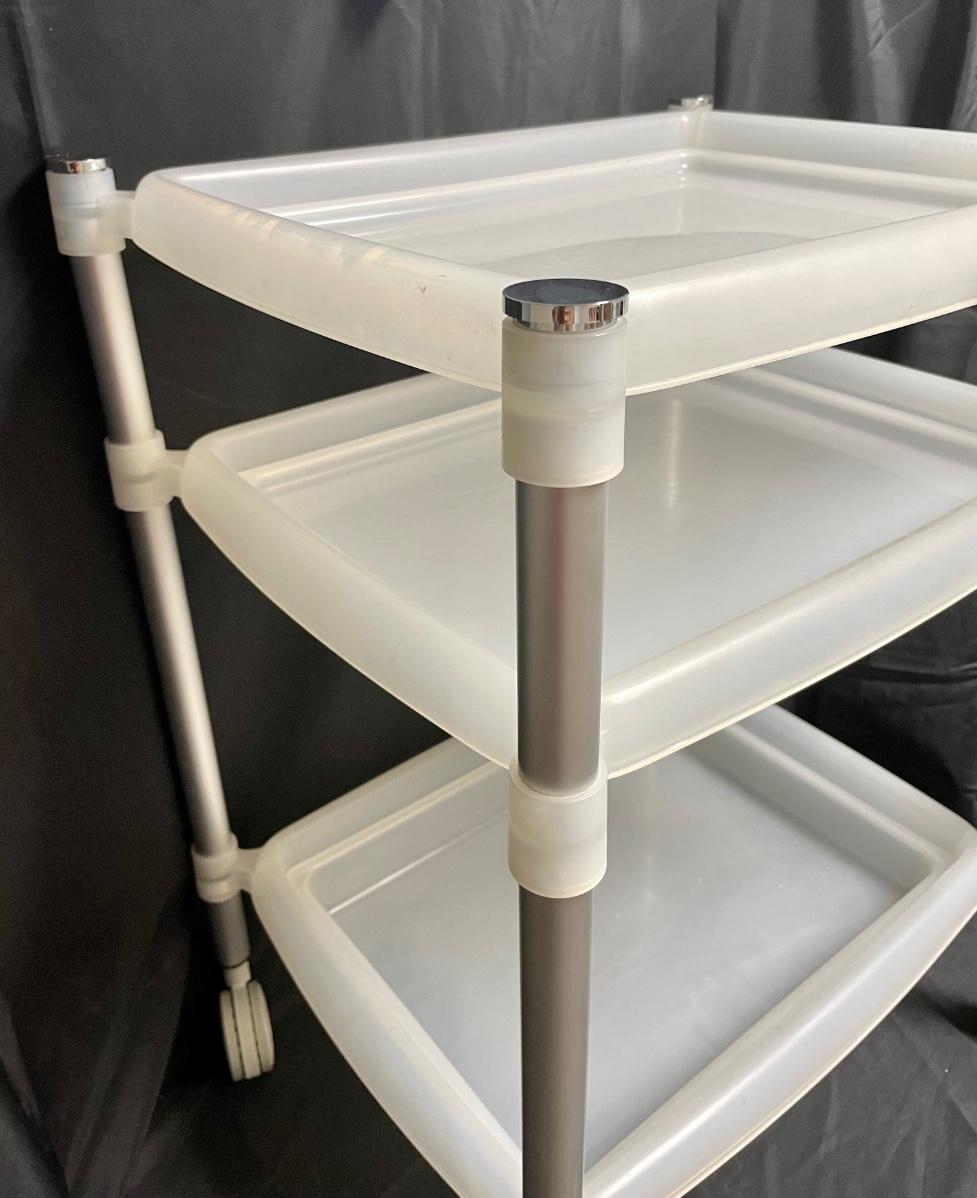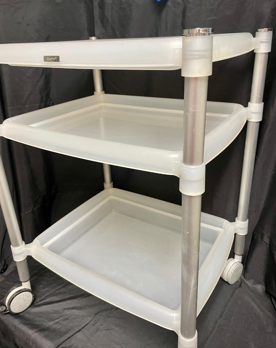 Plasic 3-tier cart made by Guzzini of Italy. Sturdy, with removable shelf bottoms to allow for carrying taller items on the botton shelf. Approx 30" tall, 18" deep and 22" wide.