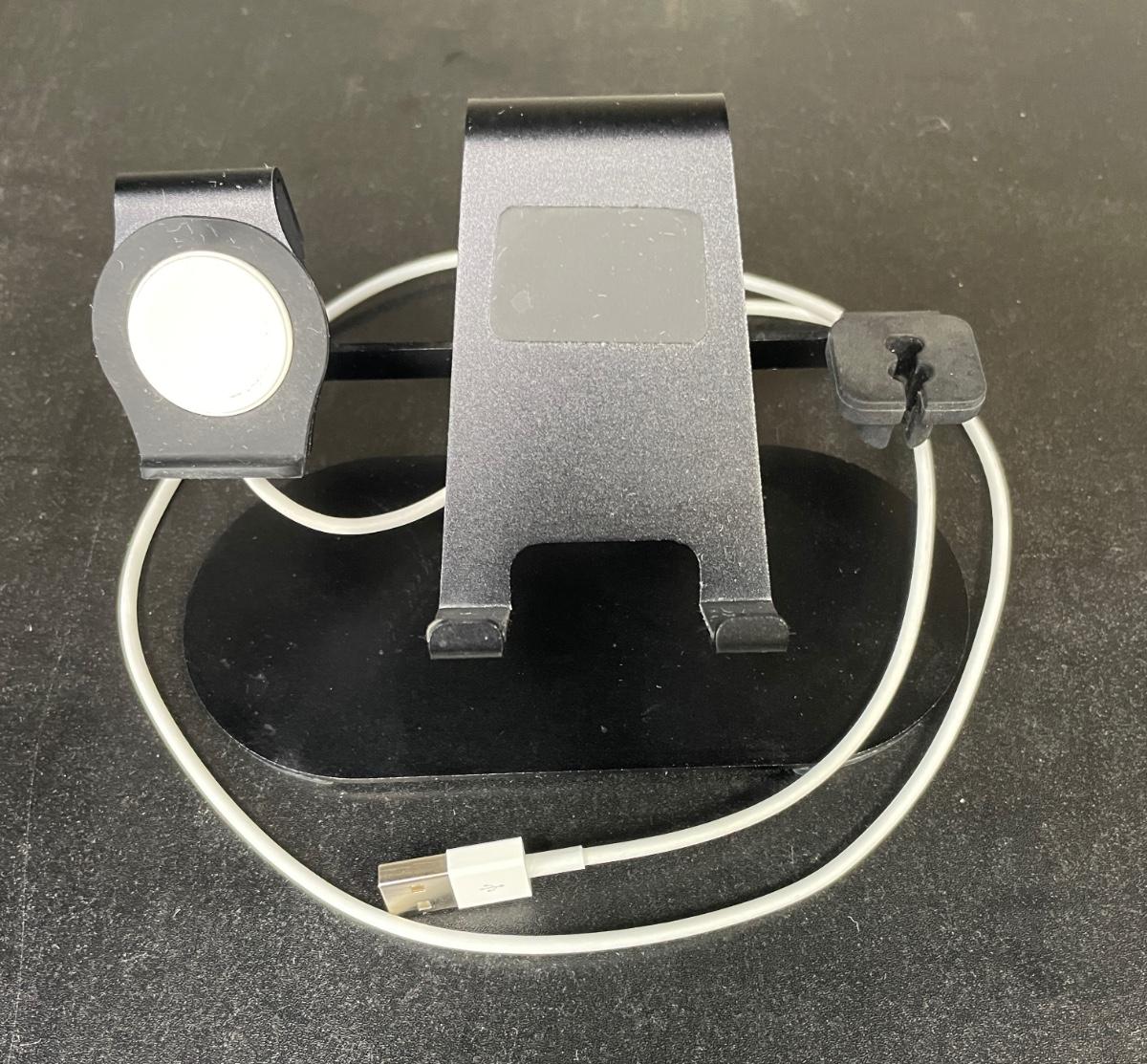 3-in-1 Electronics Station Compatible w/ iPhone 16, 15, 14, 13 & 12, iWatch Series, AirPods - Black Aluminum Stand Dock for bedside table or desk. Includes magnetic iWatch charger with USB connector, one photo shows what the stand looks like with a phone, watch and earbuds case set up for charging.