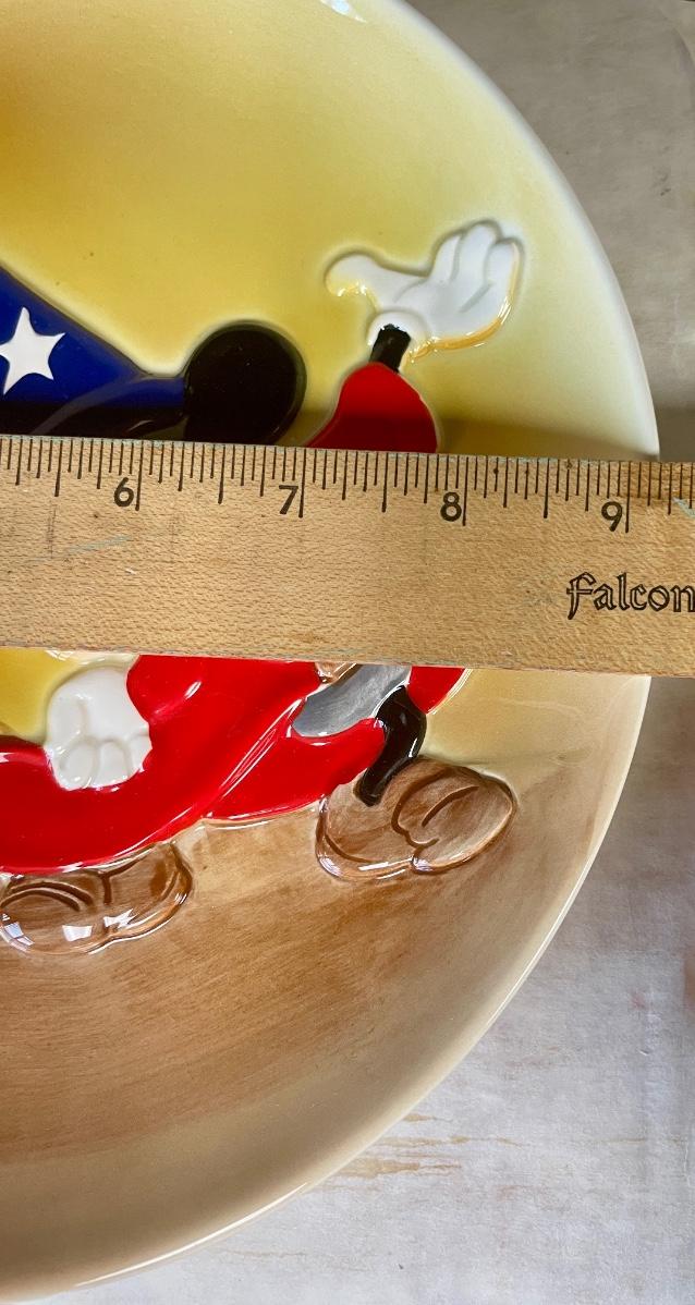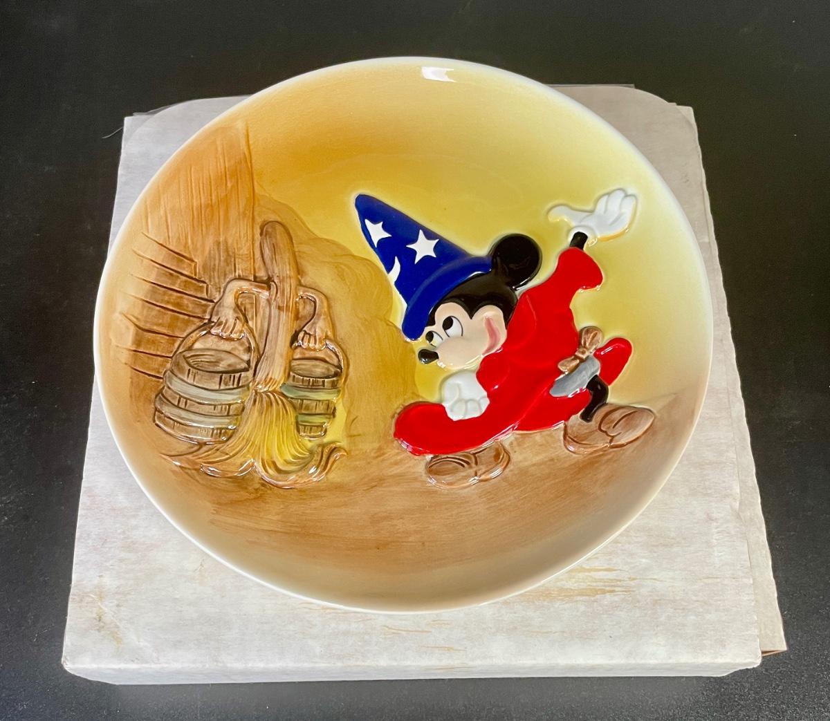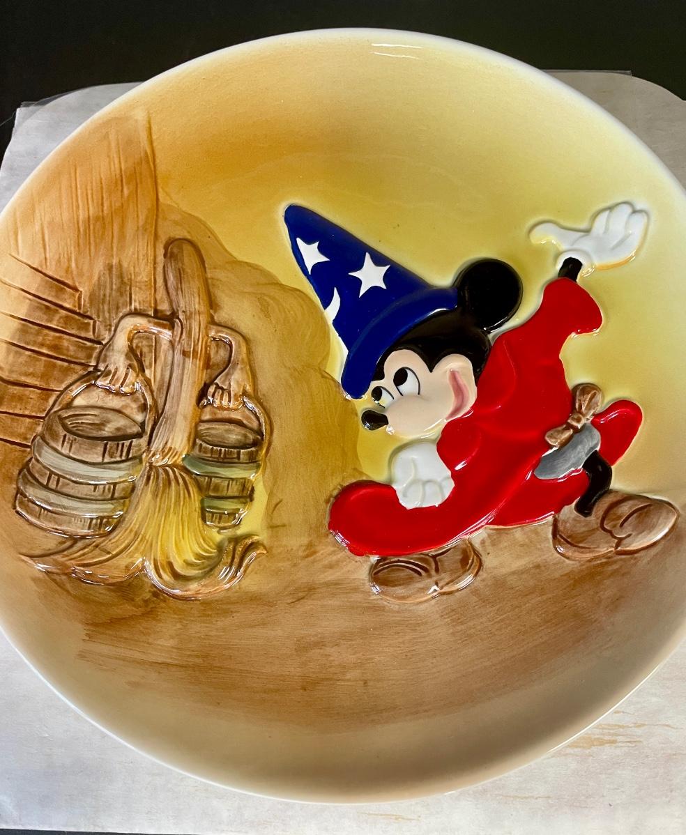 Mikey Mouse as the Sorcerer's Apprentice from Fantasia, with one of the walking brooms. Approx. 9.25" across, good condition. Includes original box.