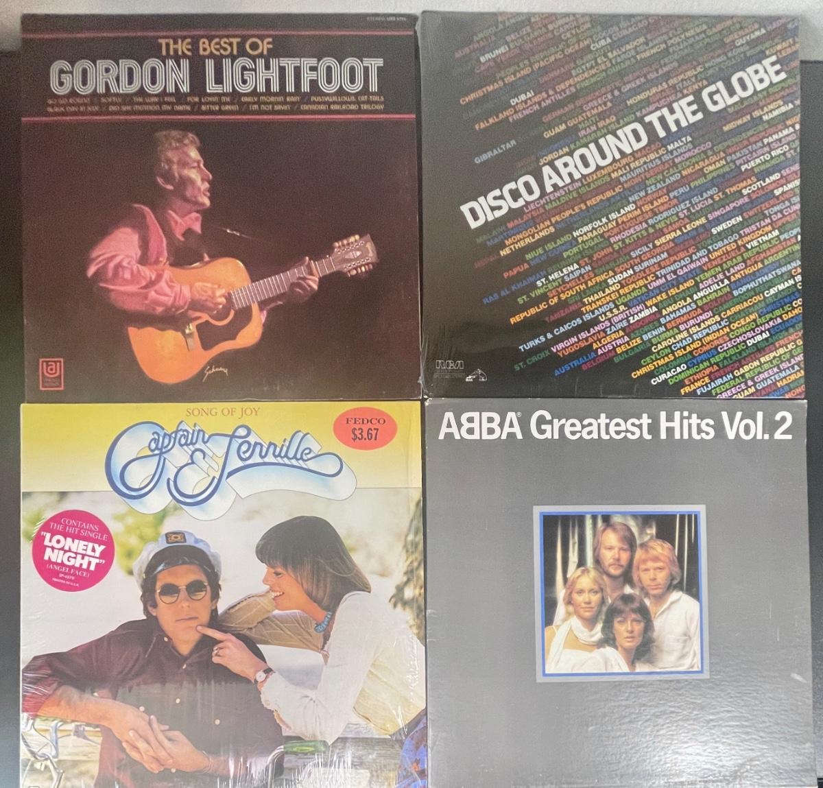 Captain & Tennille "Song of Joy" 1976, "Best of Gordon Lightfoot" 1970, ABBA "Greatest Hits Vol. 2" 1979, and Disco Around the Globe 1979 (mint, still sealed in plastic). Other 3 albums are in good condition.