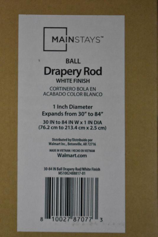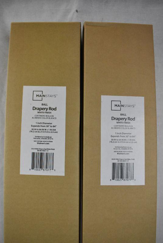 Qty 2 Curtain Rods: Mainstays 1" White Ball Finial Set, 30-84" each - New