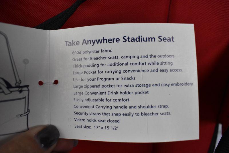 Qty 3 Stadium Seats. 2 Red 1 Black w/ Handles, Shoulder Straps & Backpack Straps