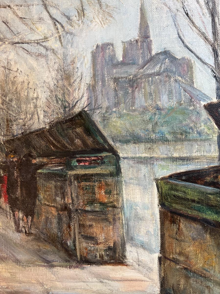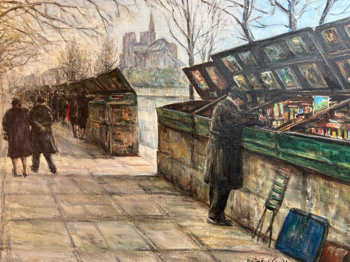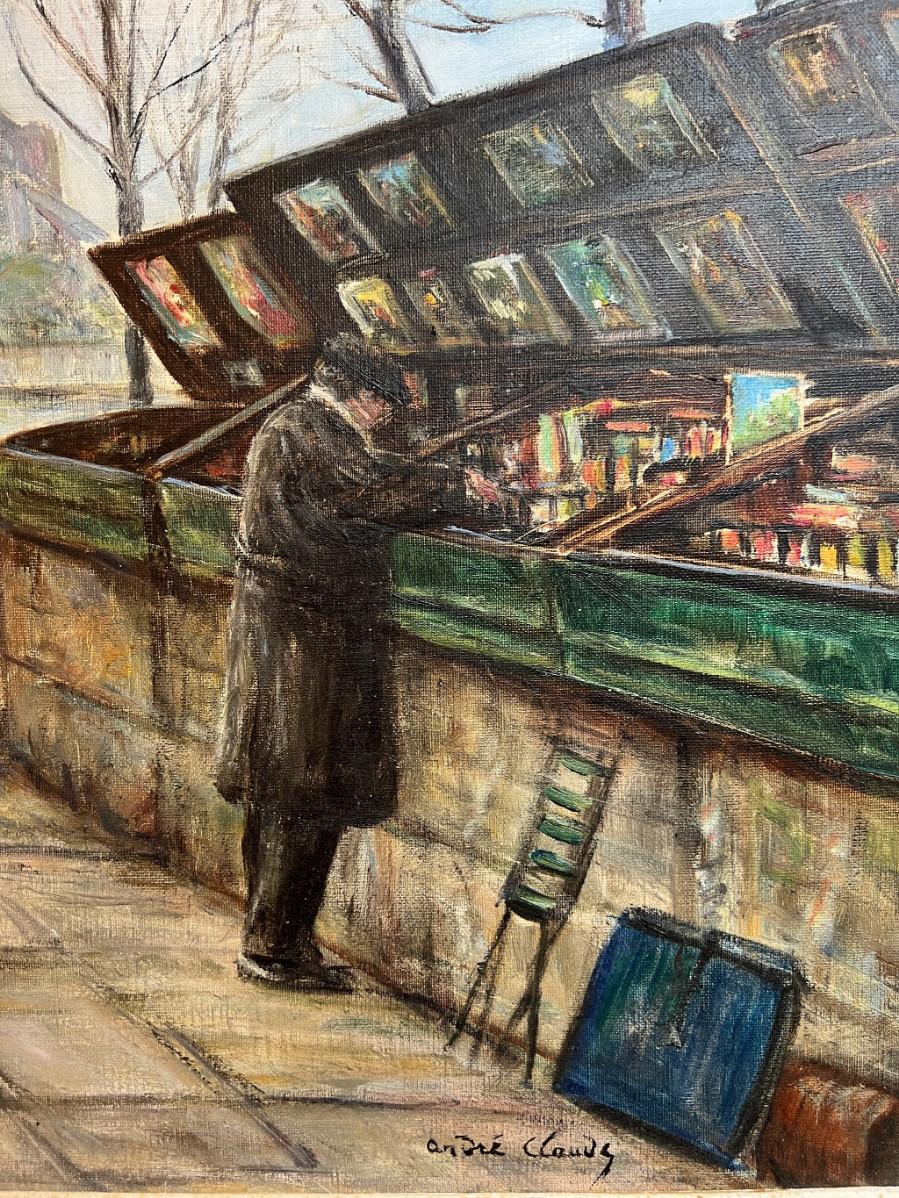 DESCRIPTION: The subject item is an original Parisian oil painting by Andre’ Claude. The wrist has posed a book dealer who has set up shop along the street above the bank of the Seine River. Notre Dame Cathedral looms on the far bank in the distance.