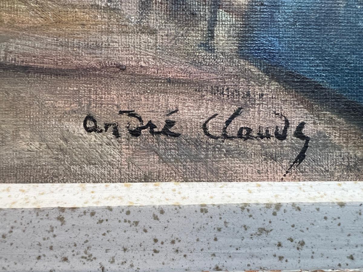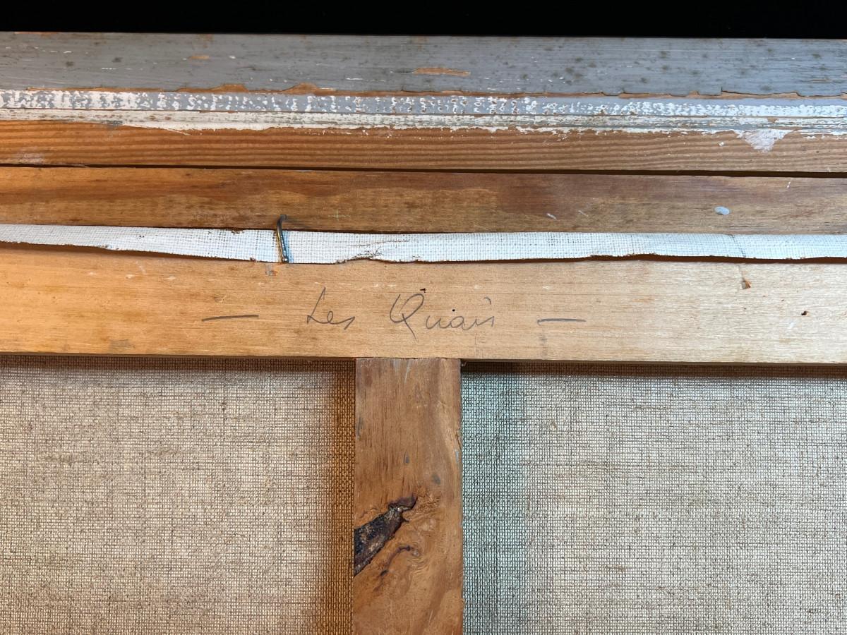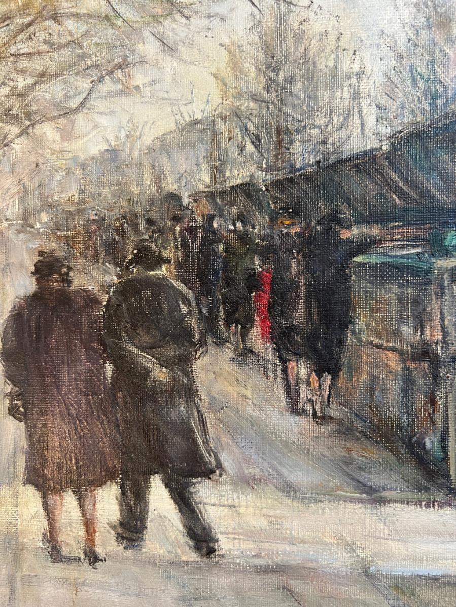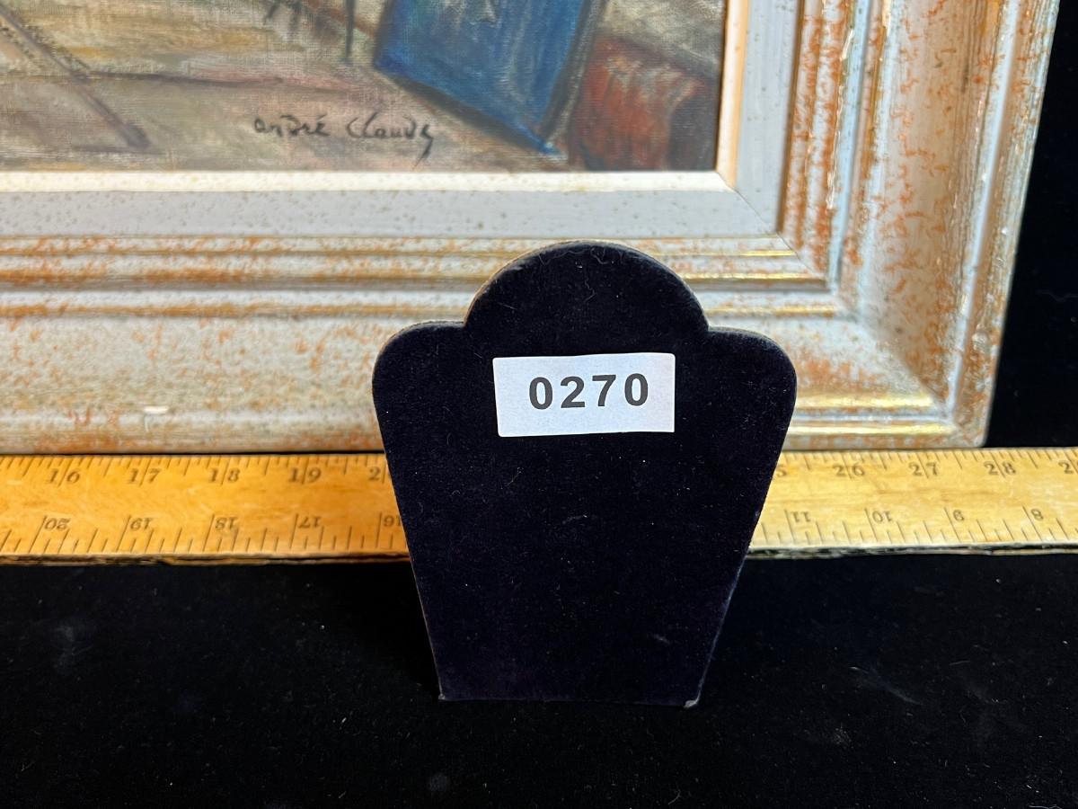 DESCRIPTION: The subject item is an original Parisian oil painting by Andre’ Claude. The wrist has posed a book dealer who has set up shop along the street above the bank of the Seine River. Notre Dame Cathedral looms on the far bank in the distance.