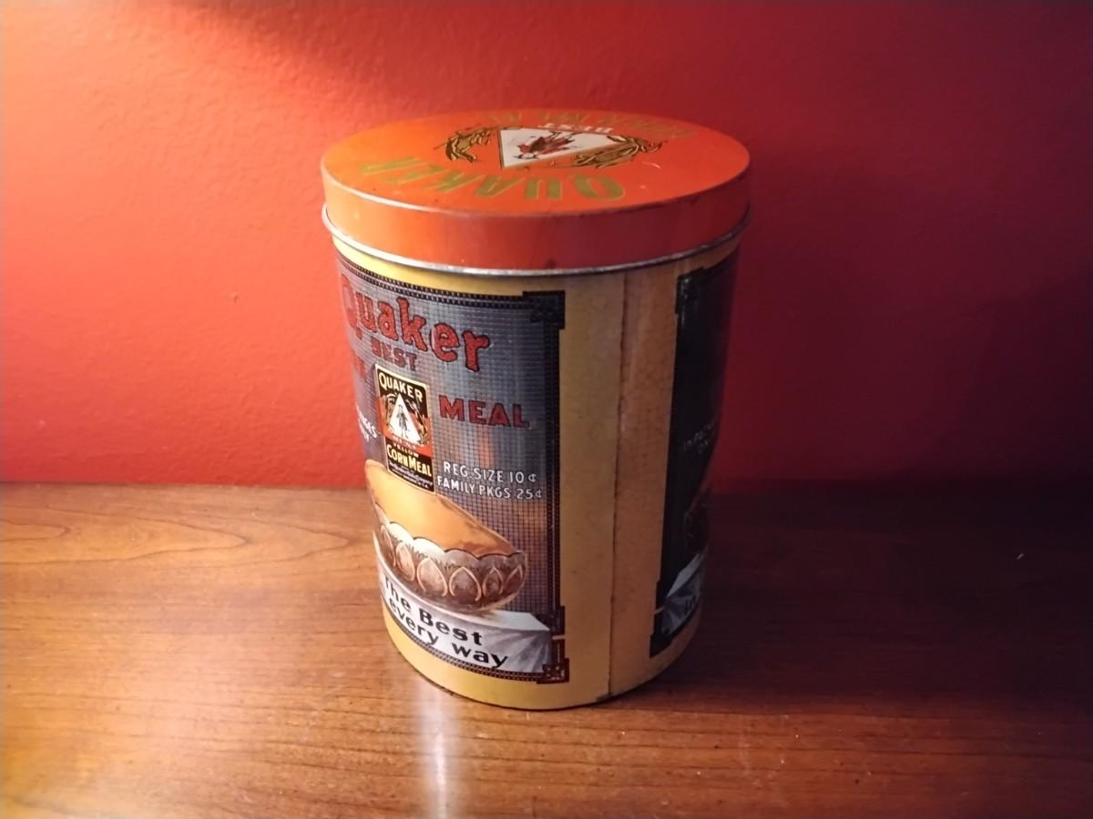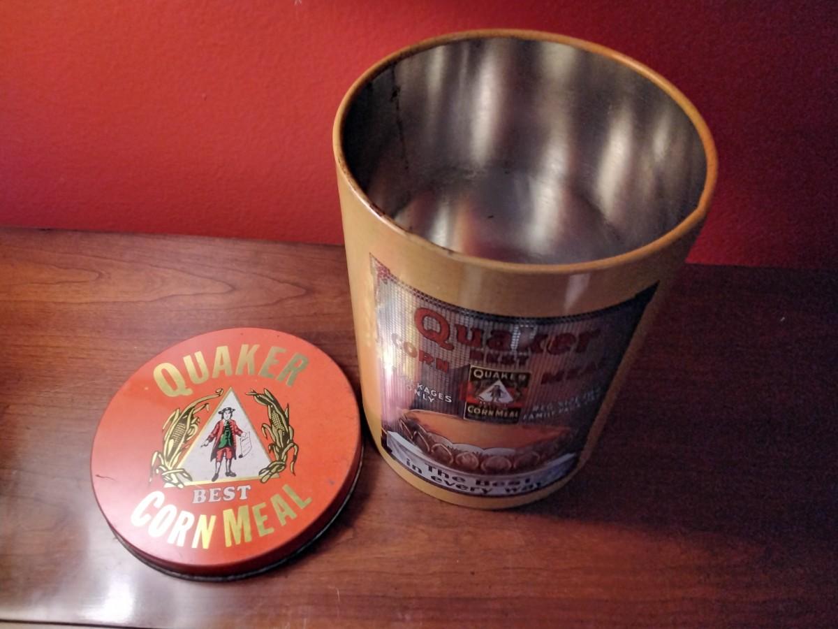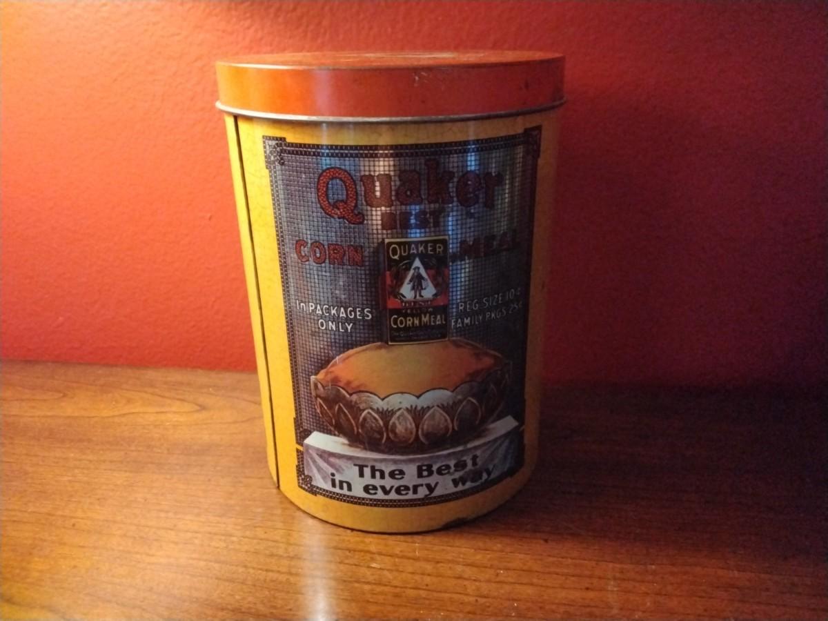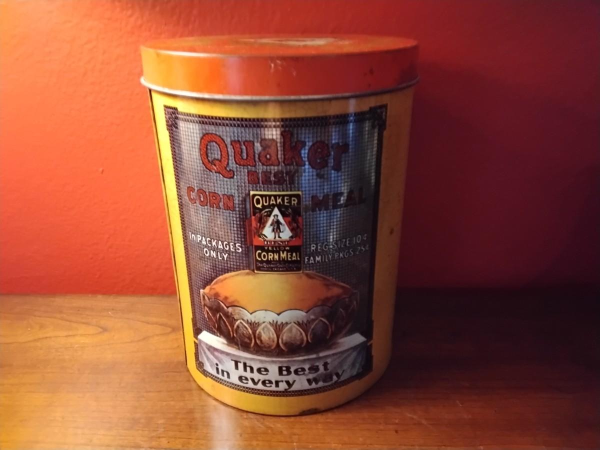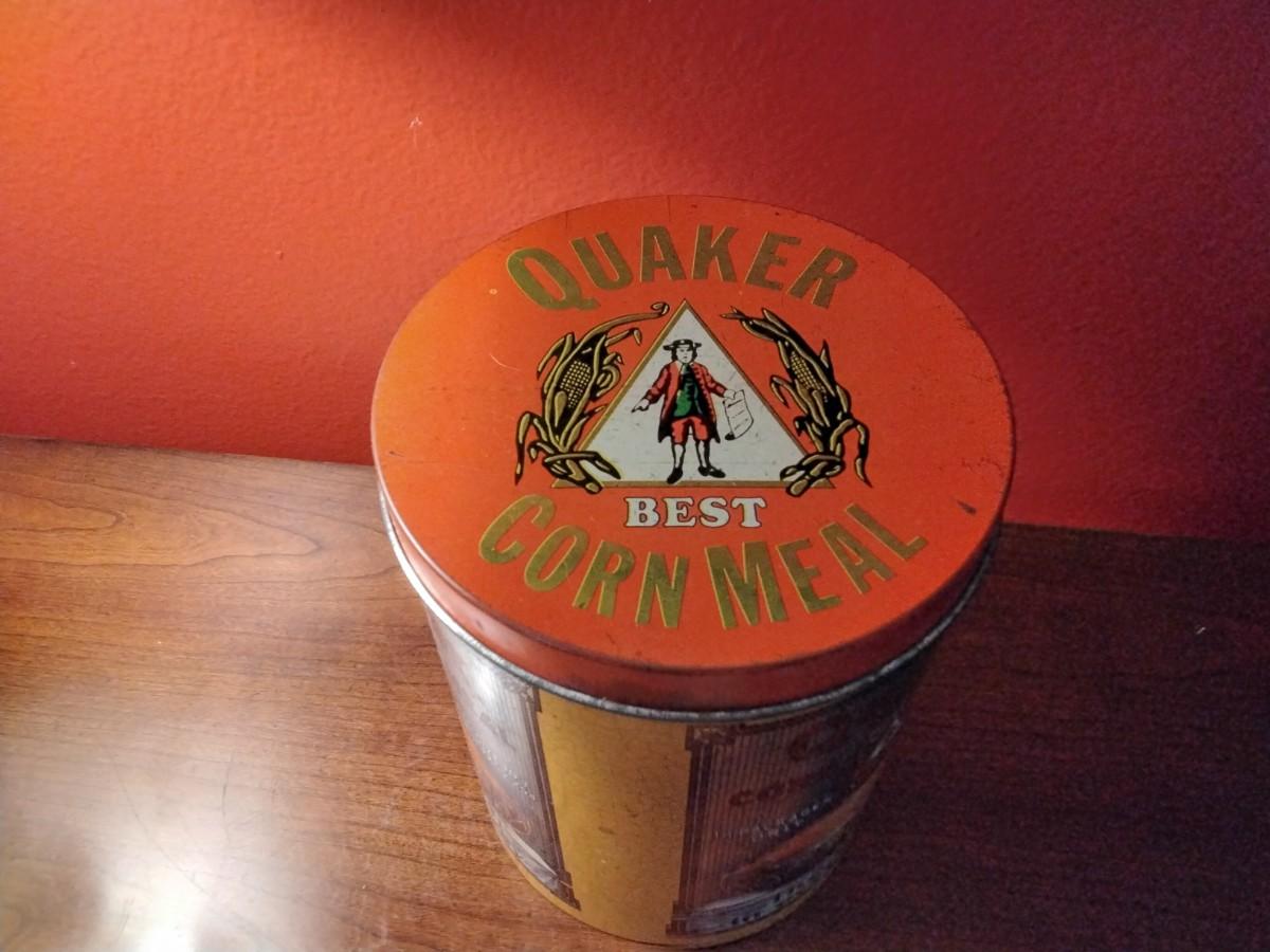 A Vintage piece of Colorful Advertising history, this Quaker Corn Meal tin will make a fine addition to your collection, and Brighten up wherever it is set with its' vibrant orange, yellow, and silver colorations. No Chips, Cracks, or Repairs of any sort. Tier 1.