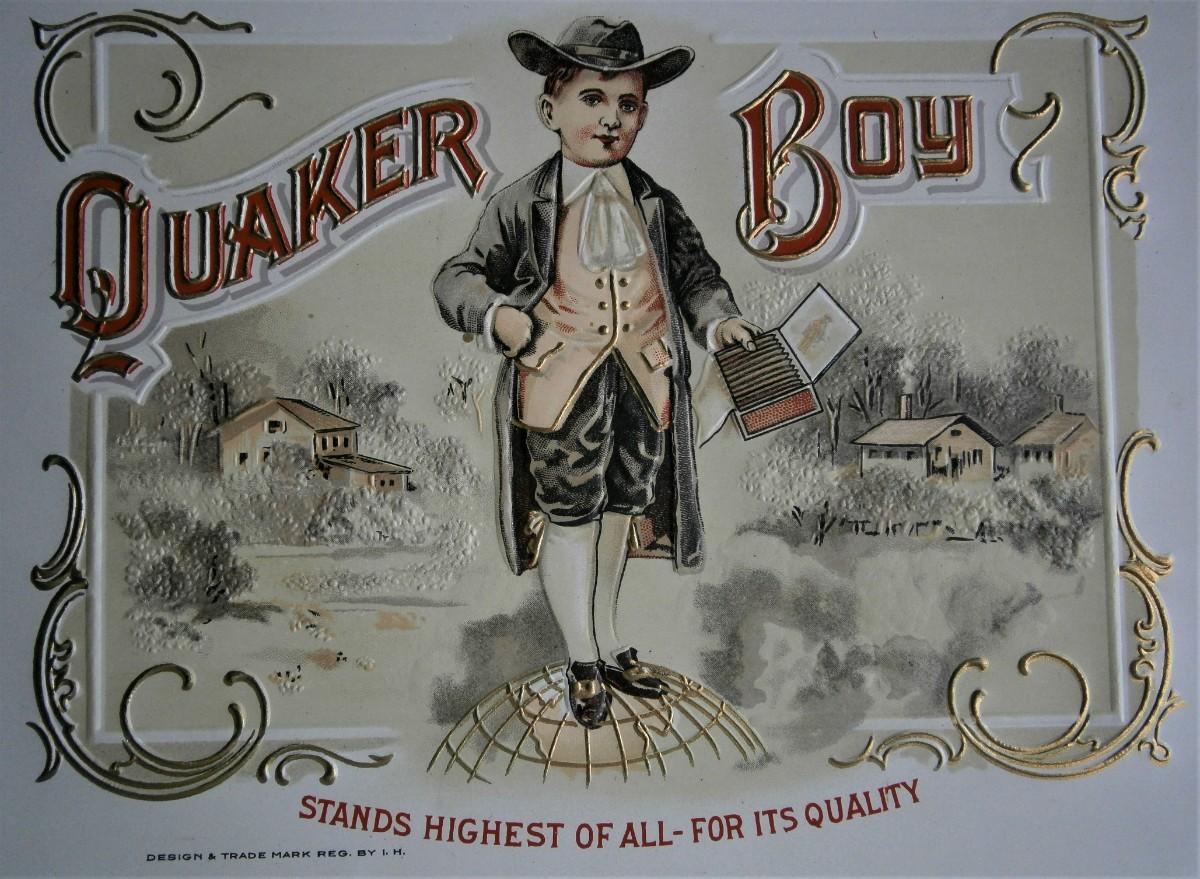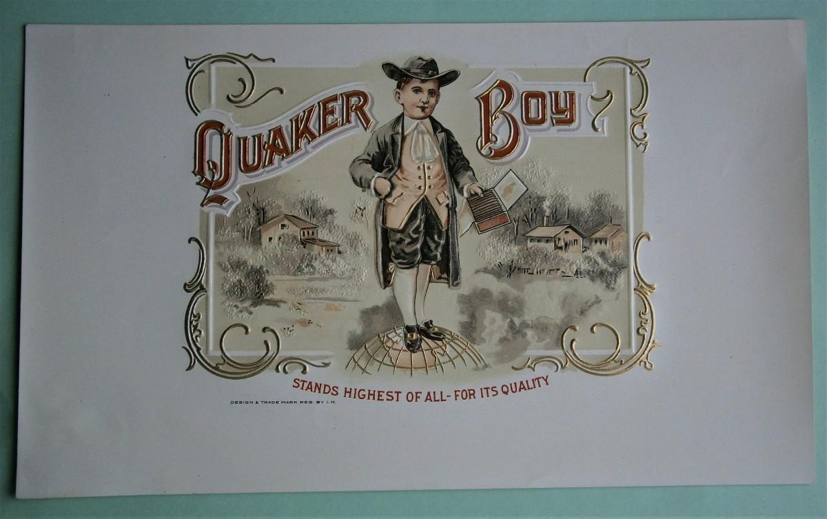"QUAKER BOY" Inner Lid Cigar Box Label, form early 1900's or earlier, Design & Trade Mark Reg. by I. H., 10 x 6 in., embossed & lithographed on paper.