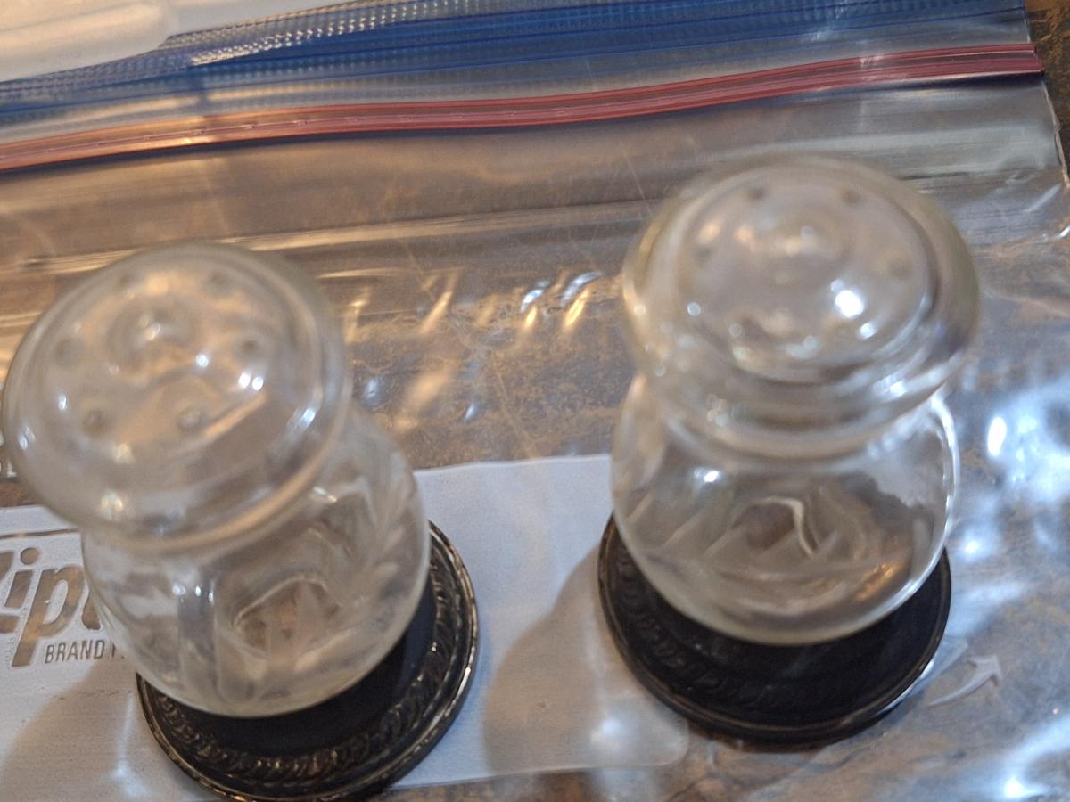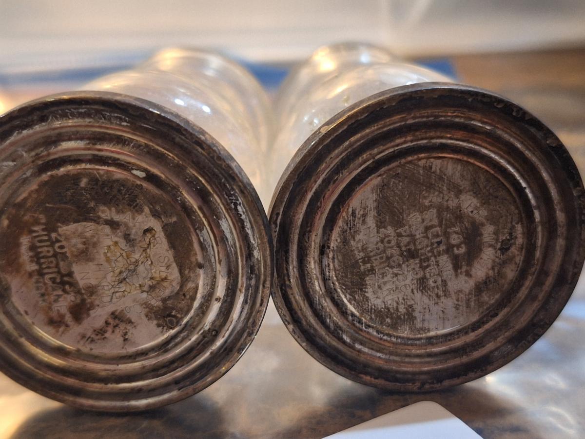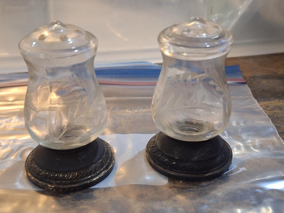 Quaker Silver Co. "Hurricane" weighted sterling silver and etched glass salt and pepper shakers.