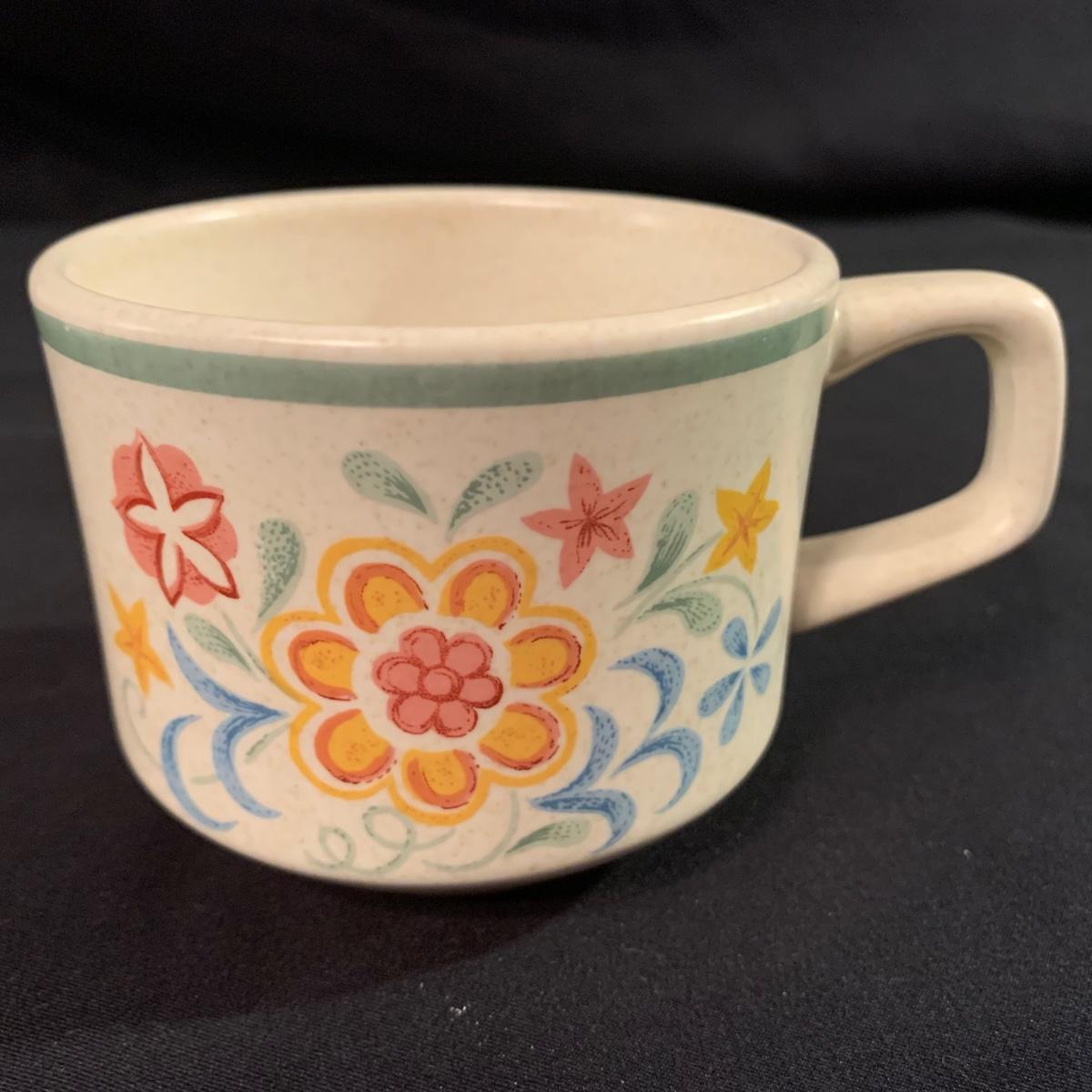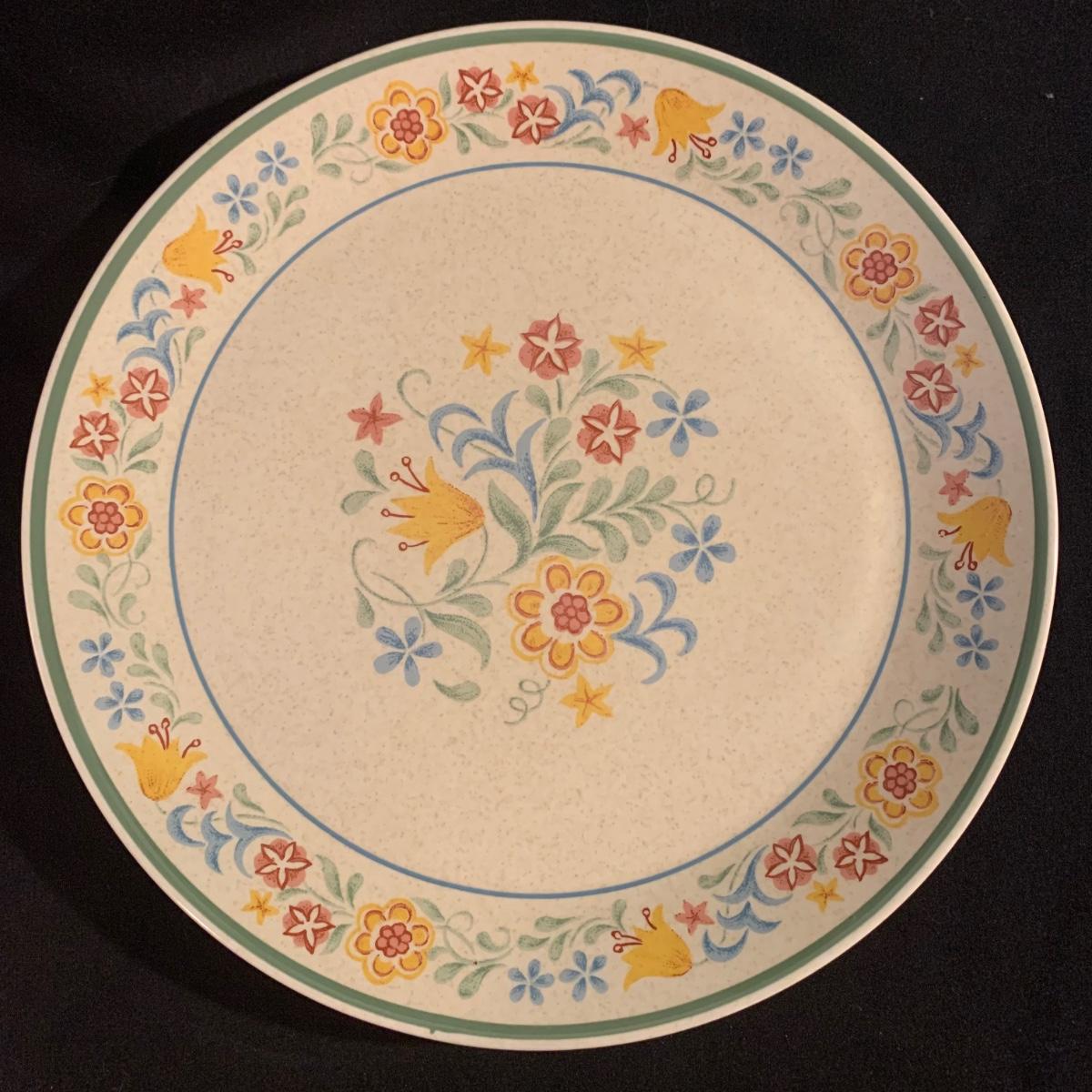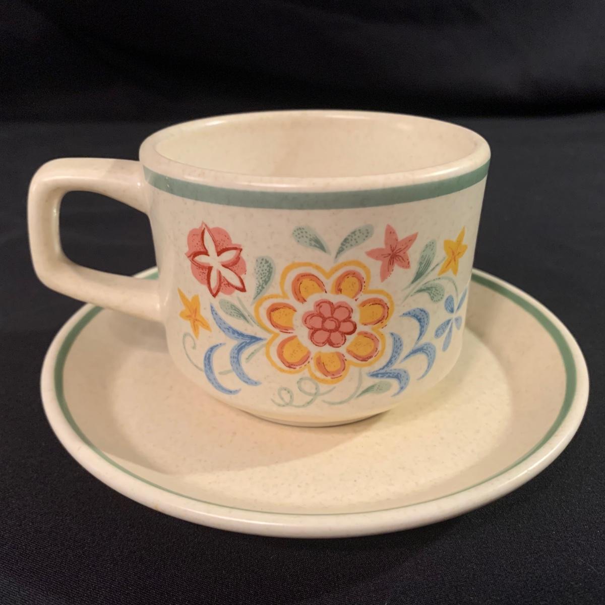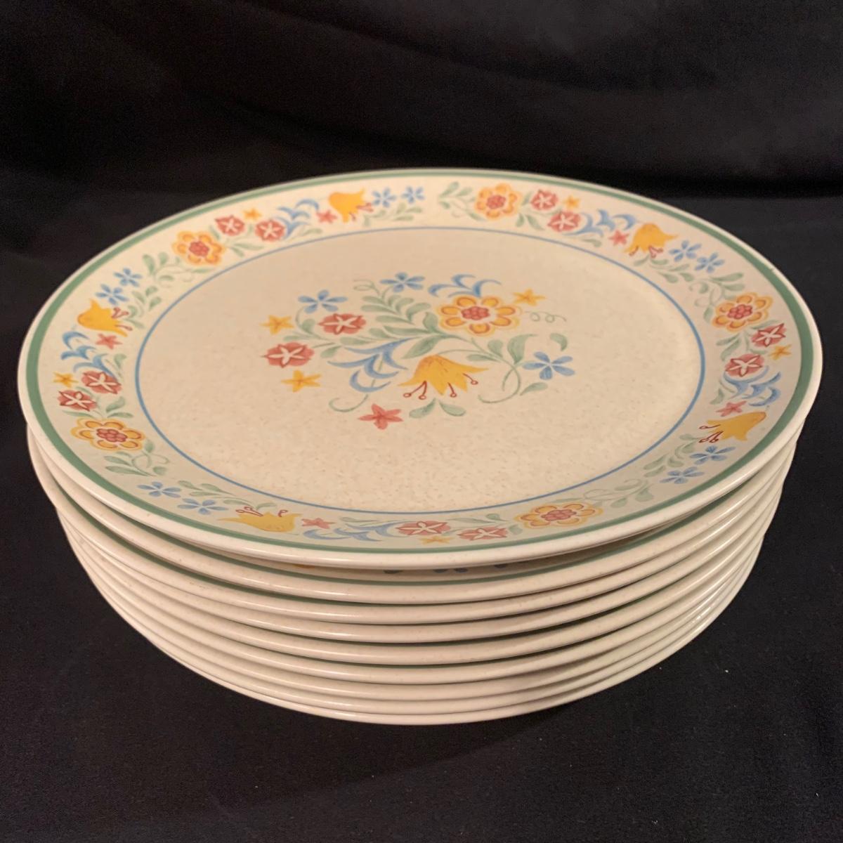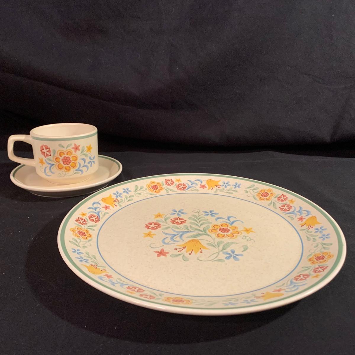 Temper-Ware plates, cups, and saucers by Lenox. Plates and cups feature adorable floral pattern. Set includes nine dinner plates, eight cups, and eight saucers. Dinner plates measure, 10.5”D x 1”H and saucers measure 6”D x 1”H. Set appears to be in good condition.