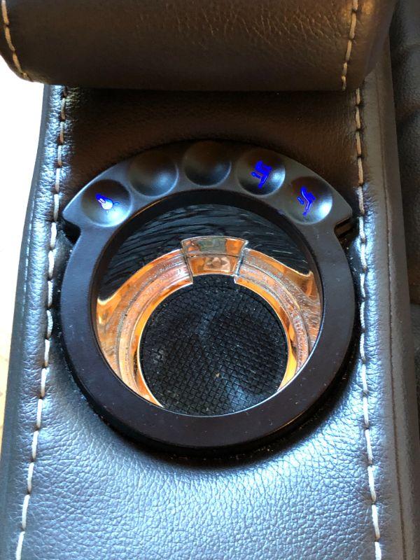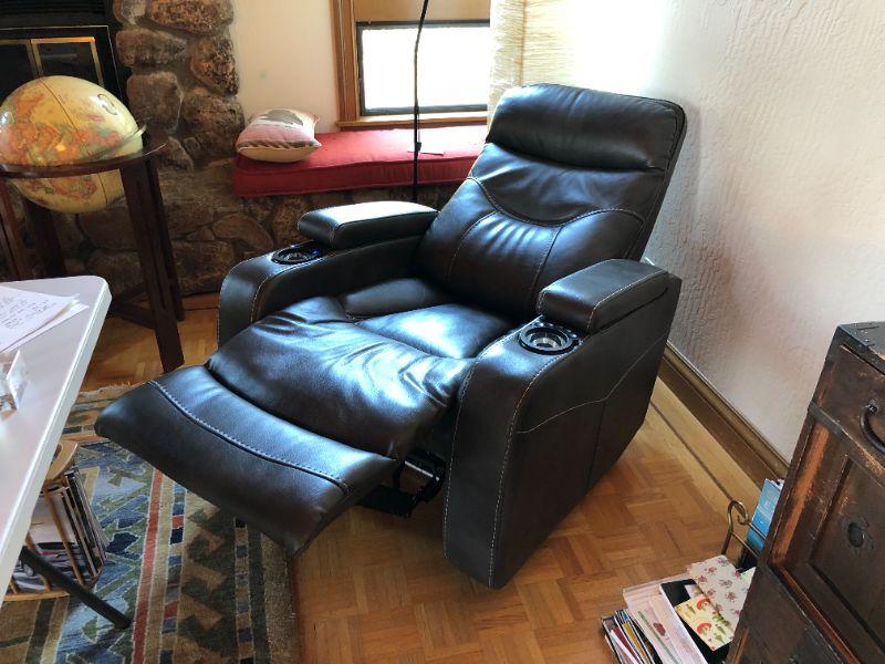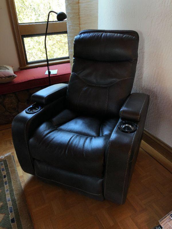 Enjoy the movie theater experience from your home! In very good condition - like new really! Black leather (or quality faux leather) chair with armrest storage, two cupholders, electric reclining function, and a very comfortable spot to enjoy your entertainment. No visible brand name.