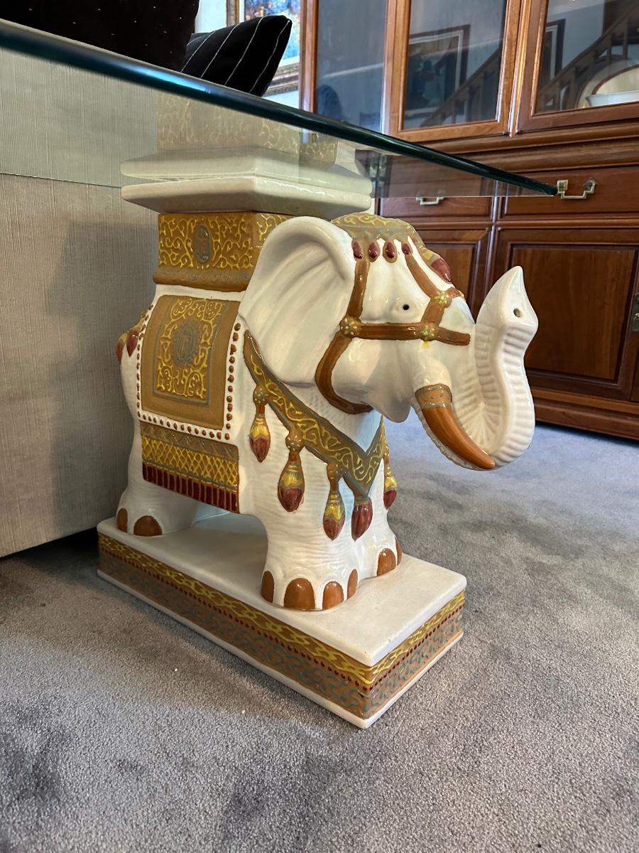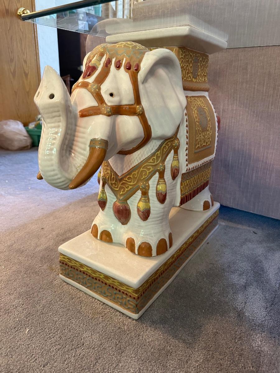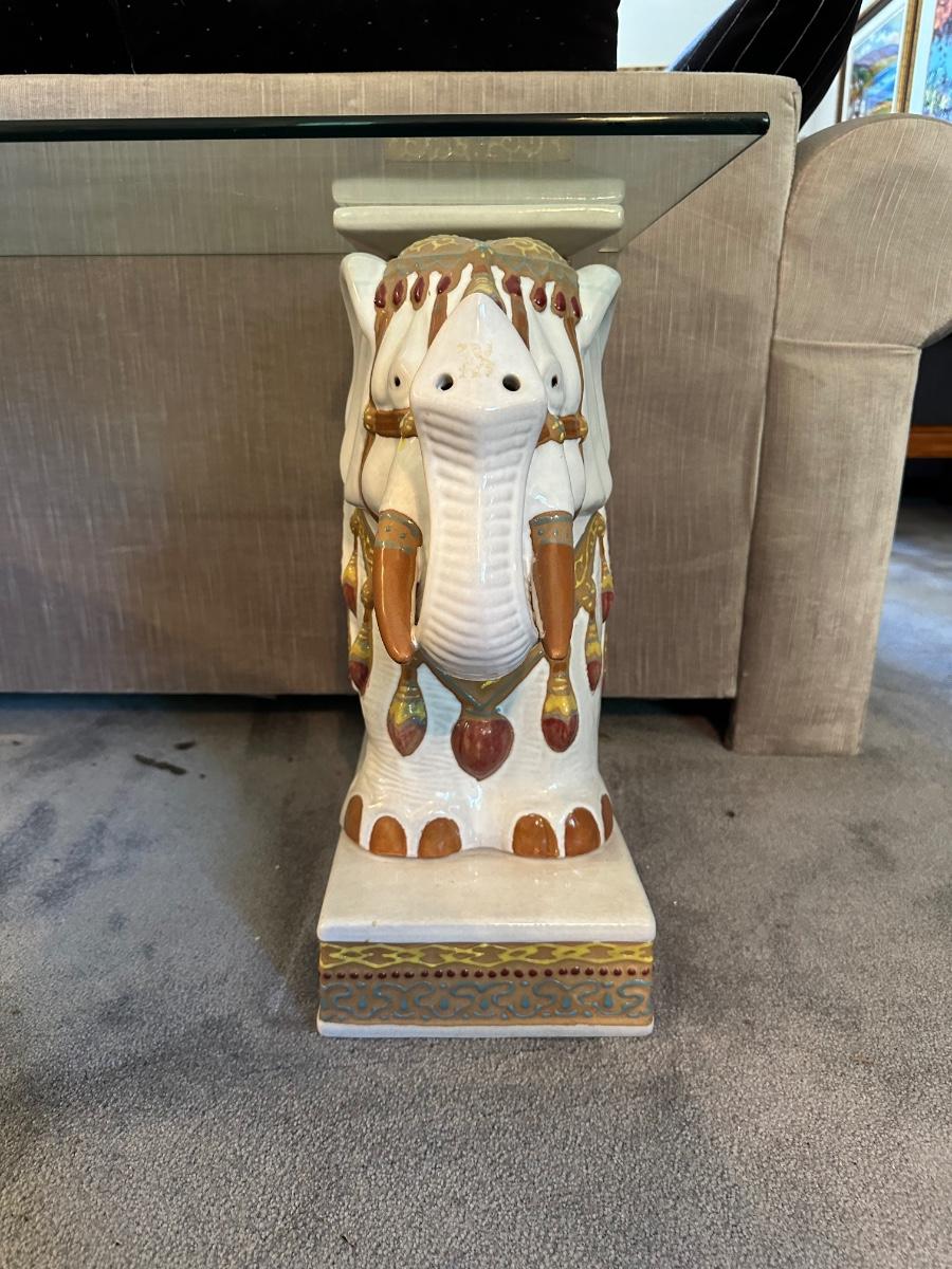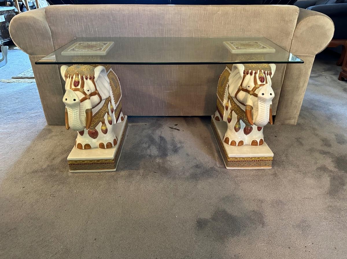 HAND PAINTED, GLAZED ELEPHANTS W/GLASS TOP