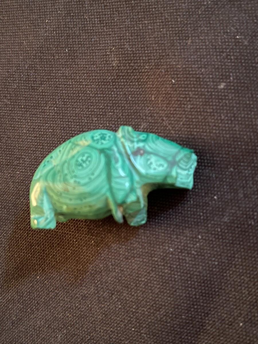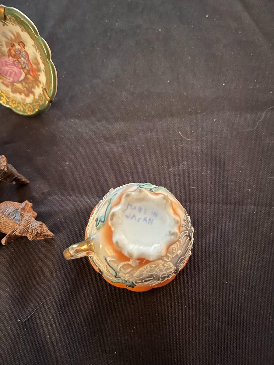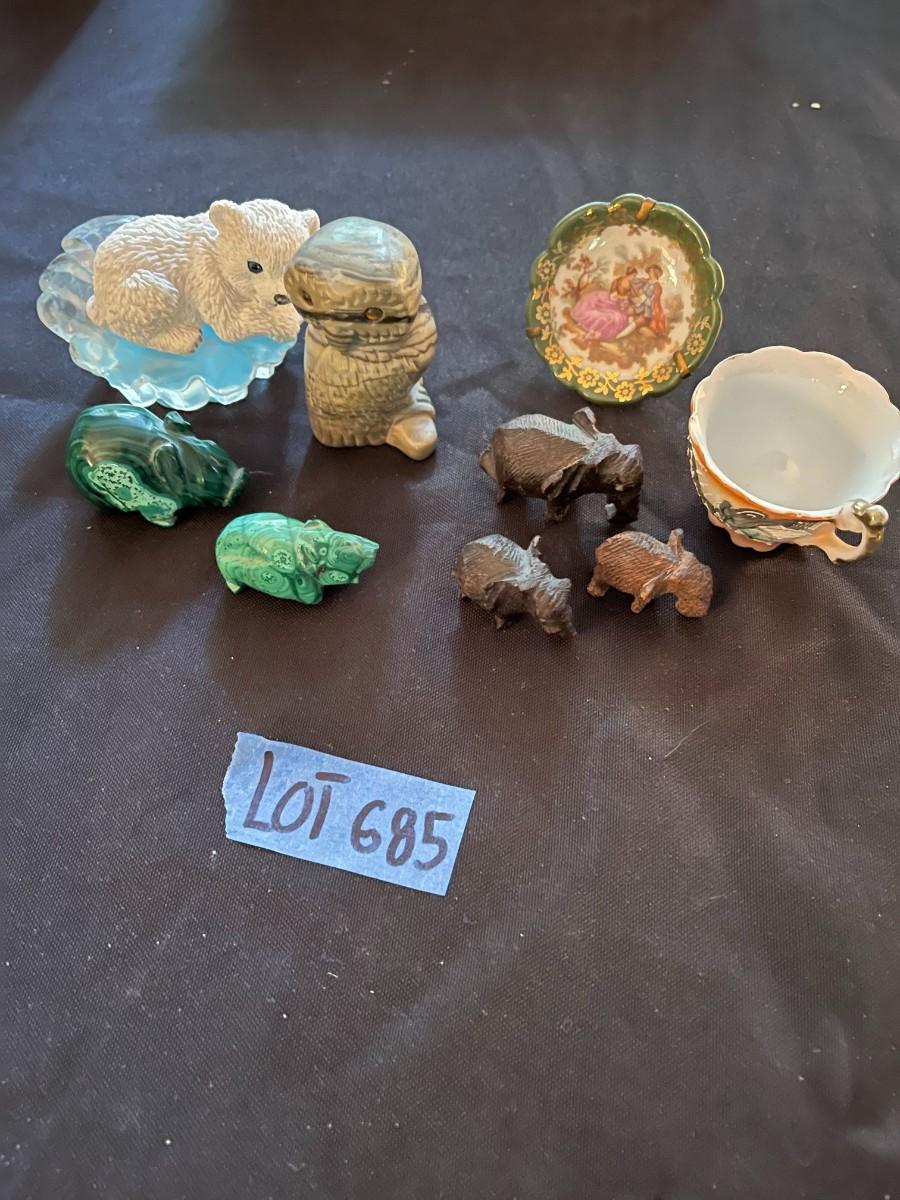 Large quality trinket lot - made in Japan teacup mini, Limoges mini plate with stand, (2) malachite animal carvings, (3) wooden animal carvings, stone carved owl, polar playmates sculpture collection by Michael Adams.