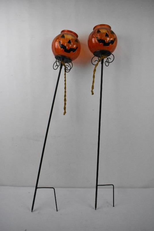 Quantity 2 Glass & Metal Pumpkin Lawn Decor