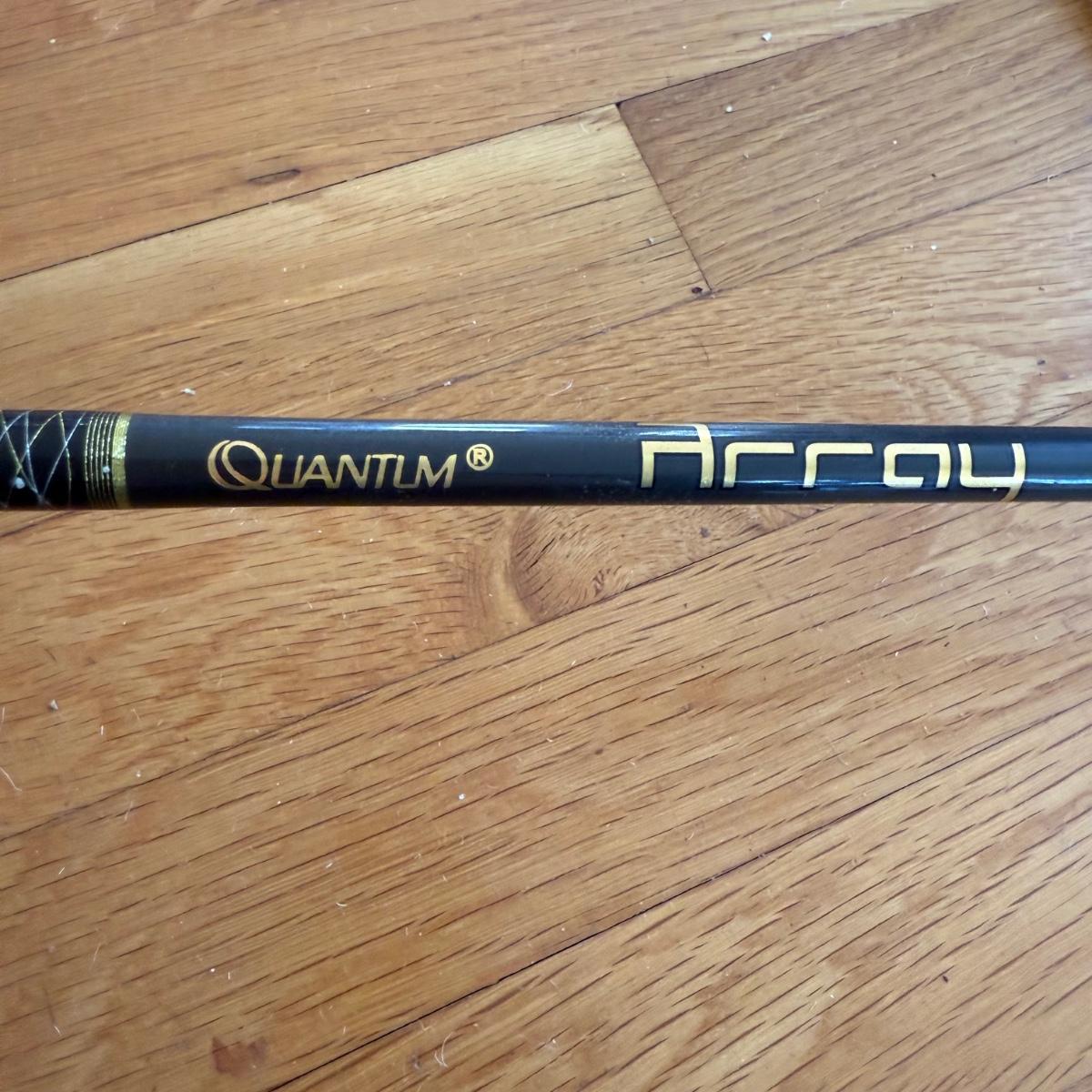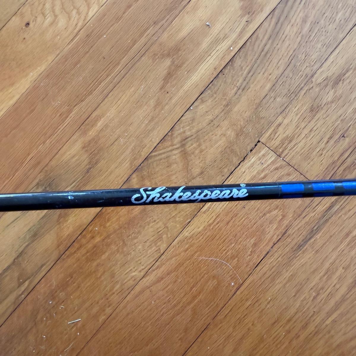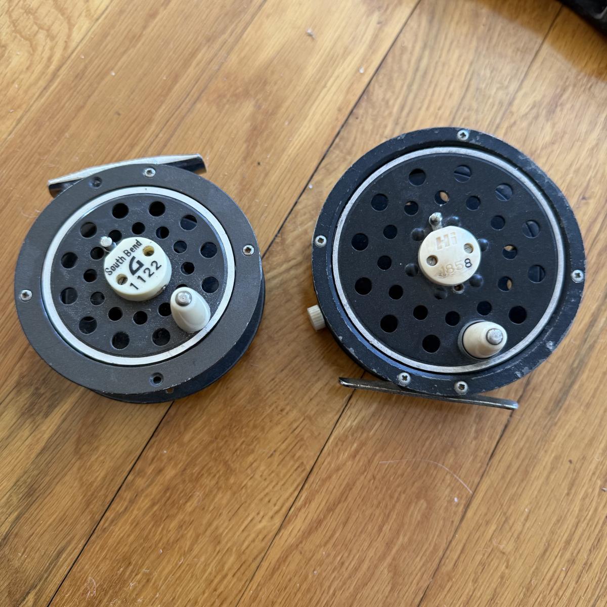 This lot contains two rods and three reels. The first is a Quantum Array fishing rod and attached is a Quantum Array 30 reel. Next is a Shakespeare fishing rod as well as a South Bend 1122 fly fishing reel, which measures 3.5”D x 1.25”. We also have another fly fishing rod with Hi and 1858 on it. The Shakespeare rod measures 63” x 1.5” at the widest part of the handle.