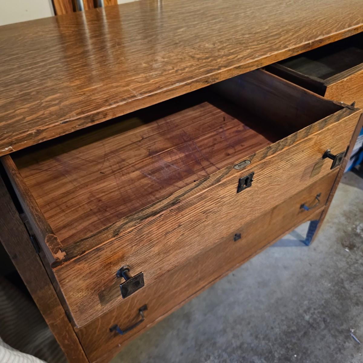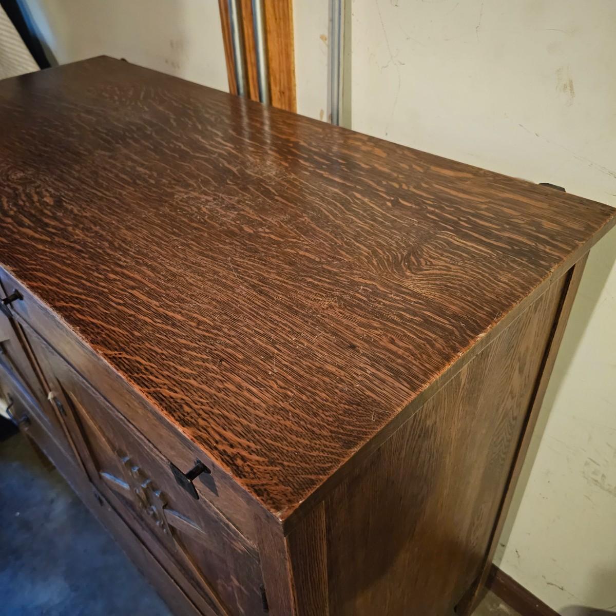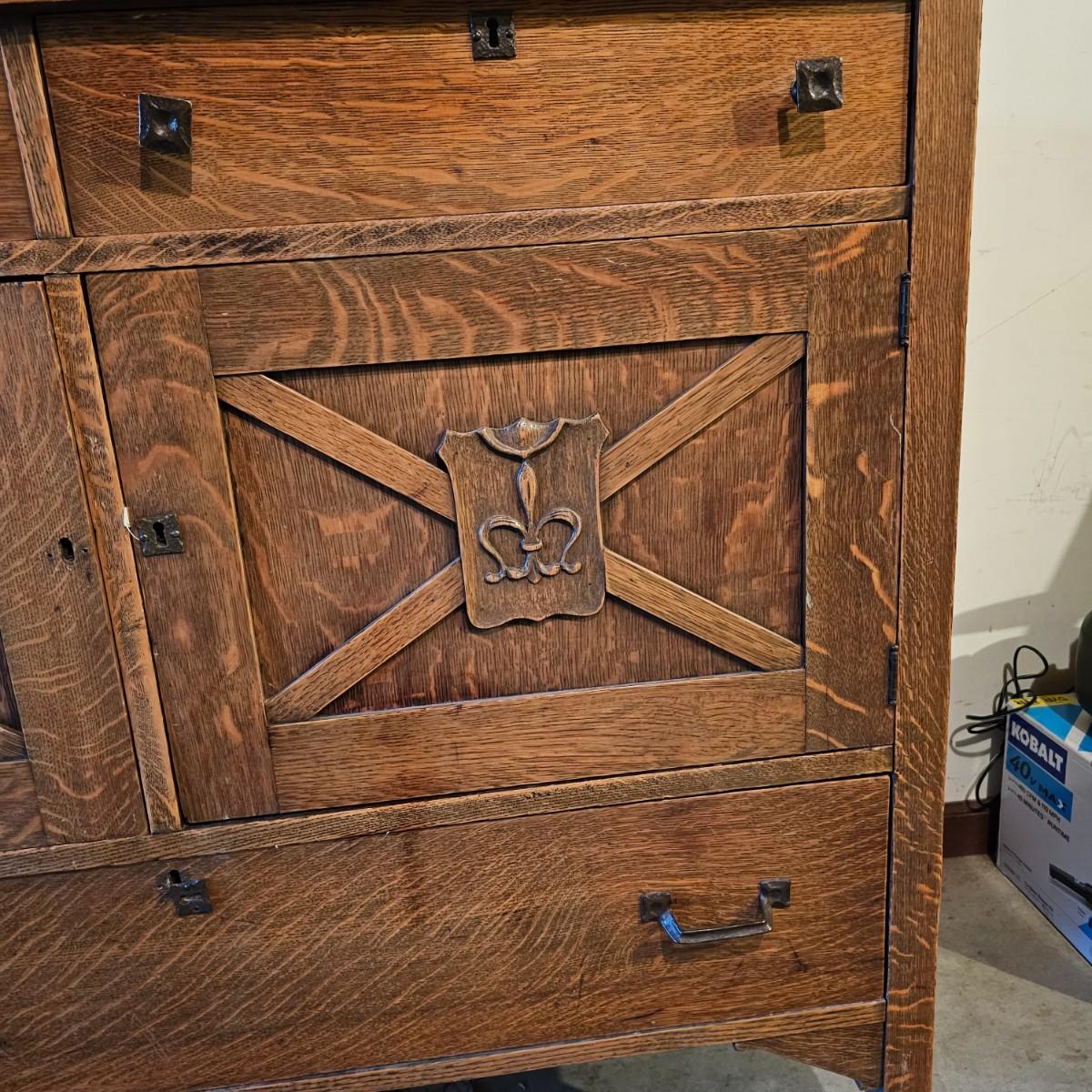 Beautiful solid wood side buffet with quarter-sawn oak components. Two top drawers, middle swing doors and a lower full length drawer. Piece has all metal hardware, it is missing one keyhole plate and no key is included. Unusual locking corner construction on drawer corners. Unit measures 44" x 20" x 39"H. Some warping on back panels. Brackets attached on the back, but no mirror included. See photos for details. Local pickup only. Winning bidder must bring assistance to help move and load this item due to its weight and/or size.