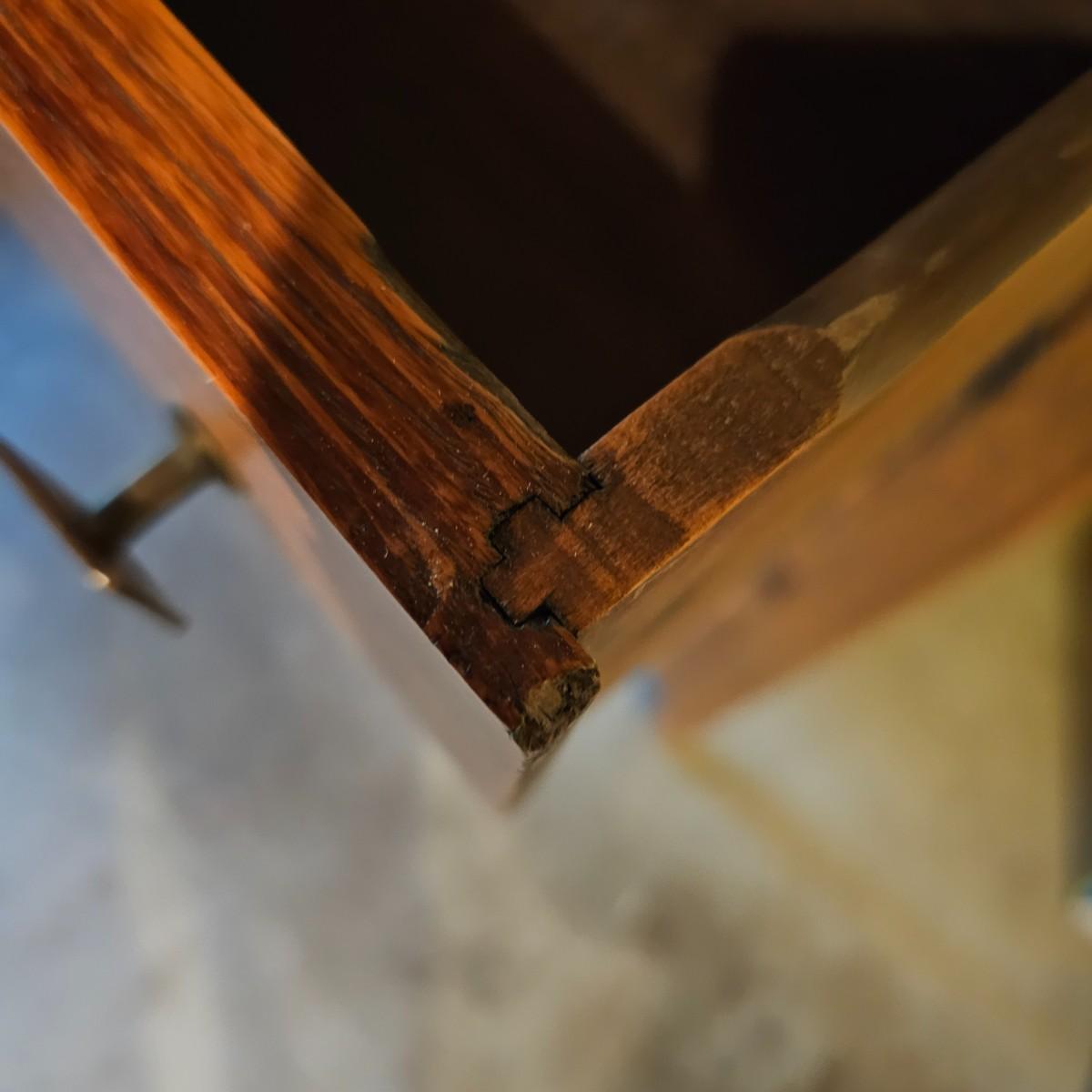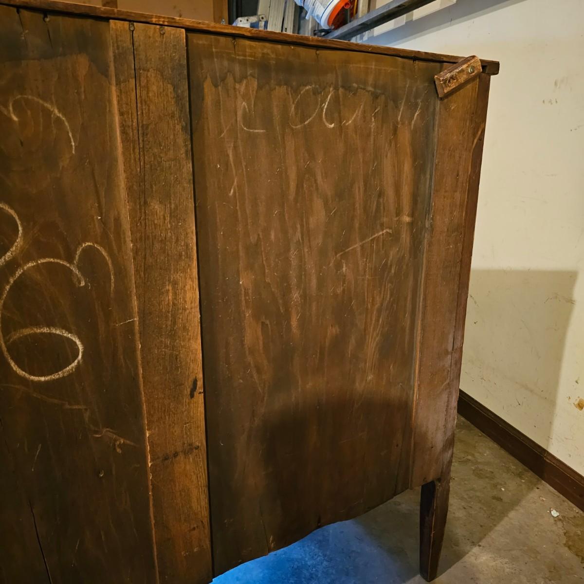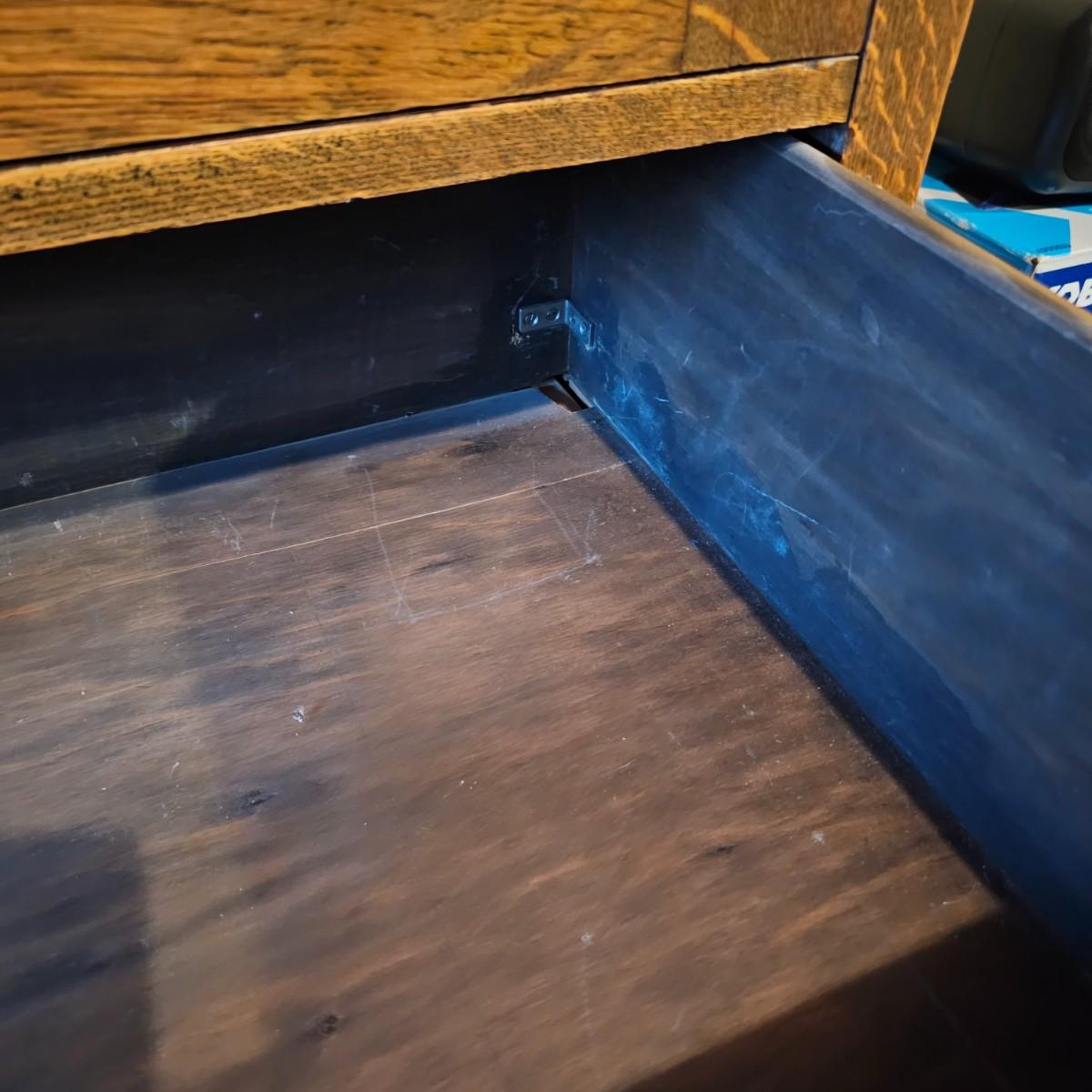 Beautiful solid wood side buffet with quarter-sawn oak components. Two top drawers, middle swing doors and a lower full length drawer. Piece has all metal hardware, it is missing one keyhole plate and no key is included. Unusual locking corner construction on drawer corners. Unit measures 44" x 20" x 39"H. Some warping on back panels. Brackets attached on the back, but no mirror included. See photos for details. Local pickup only. Winning bidder must bring assistance to help move and load this item due to its weight and/or size.