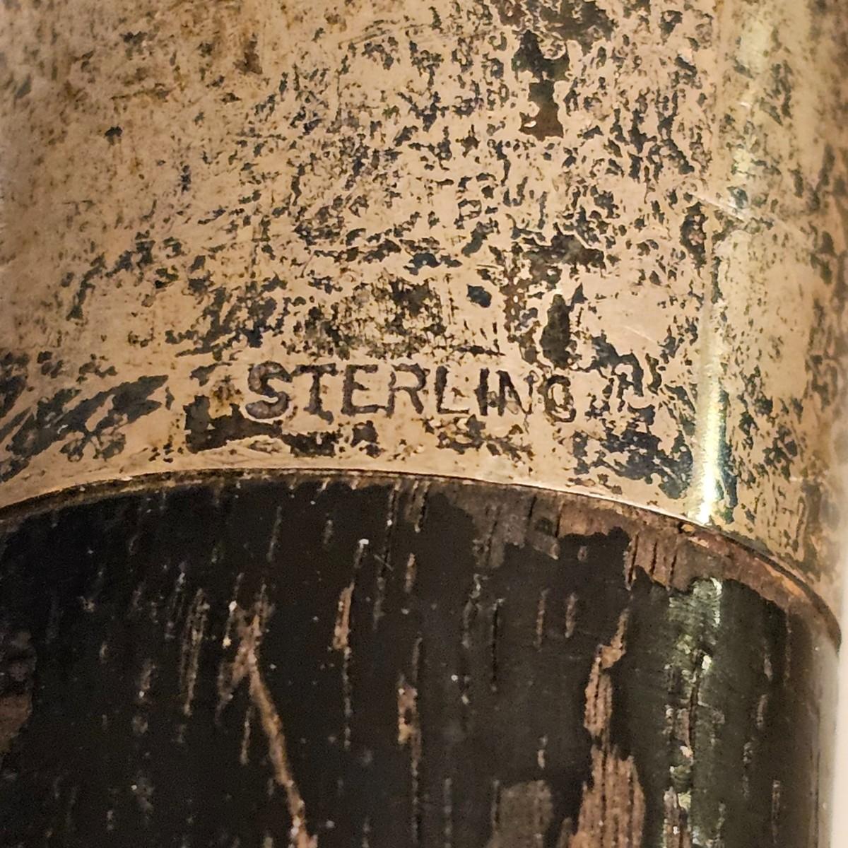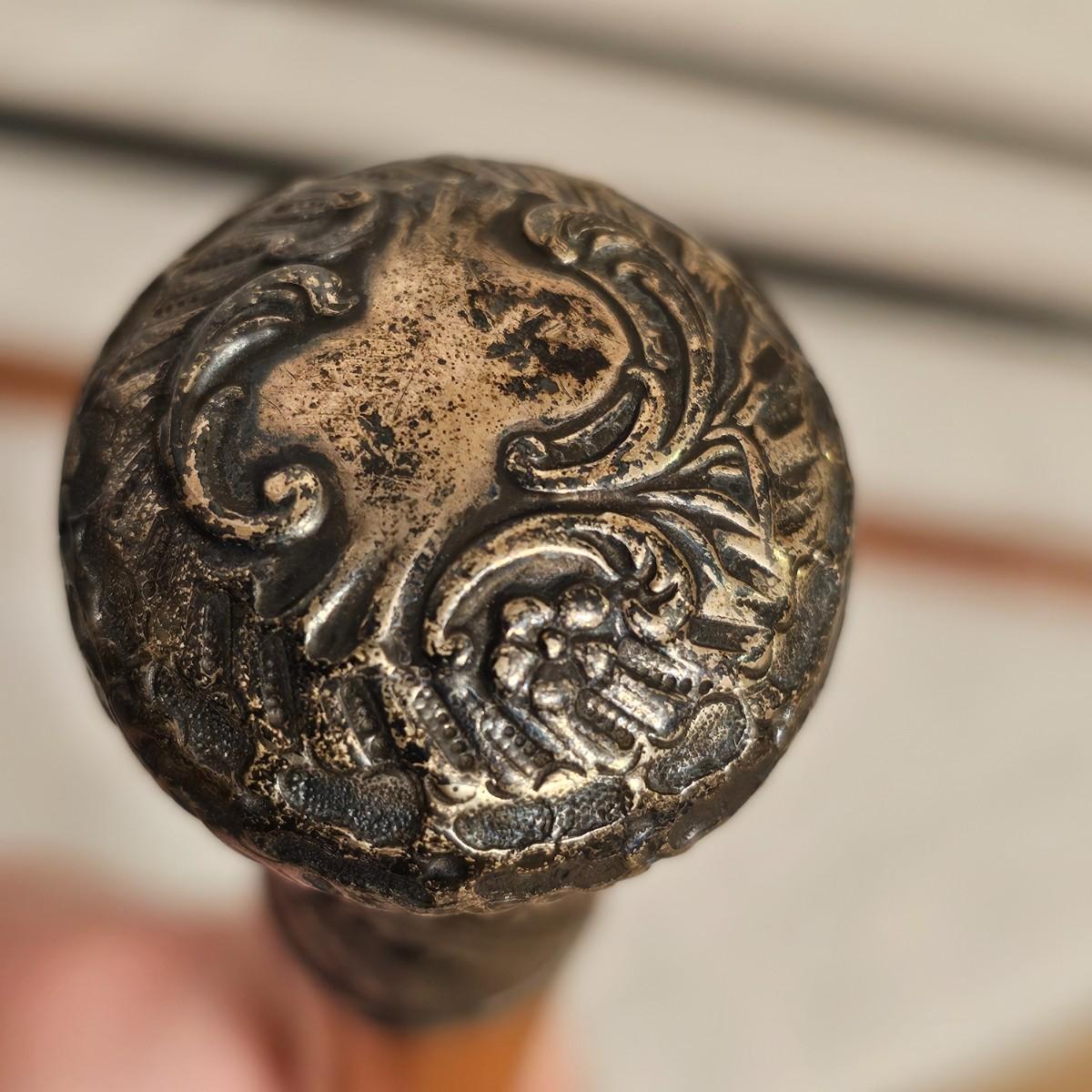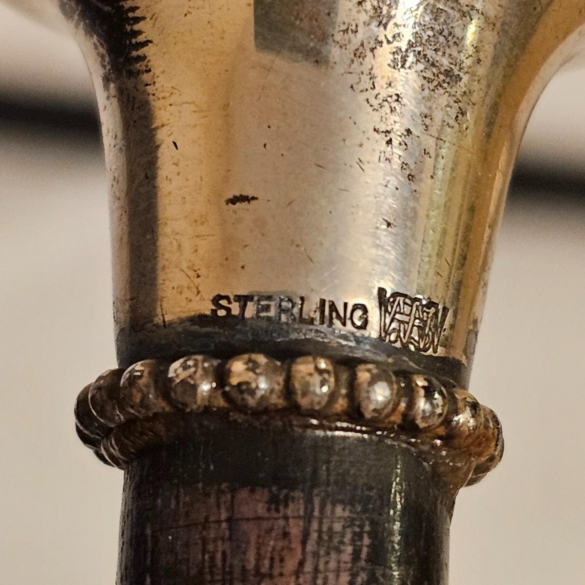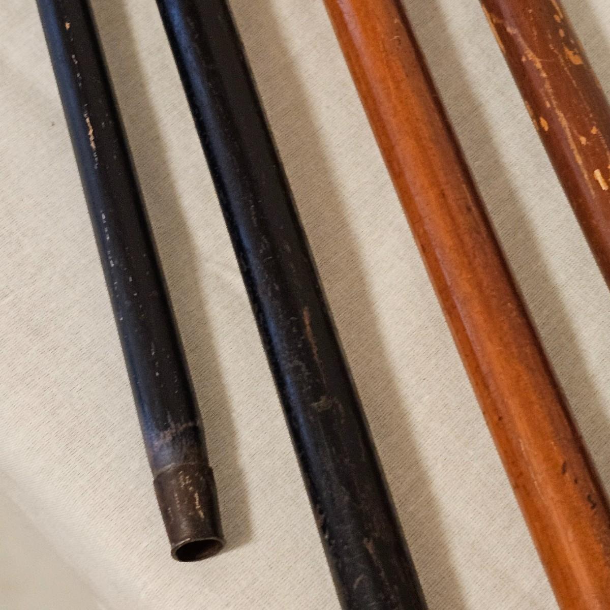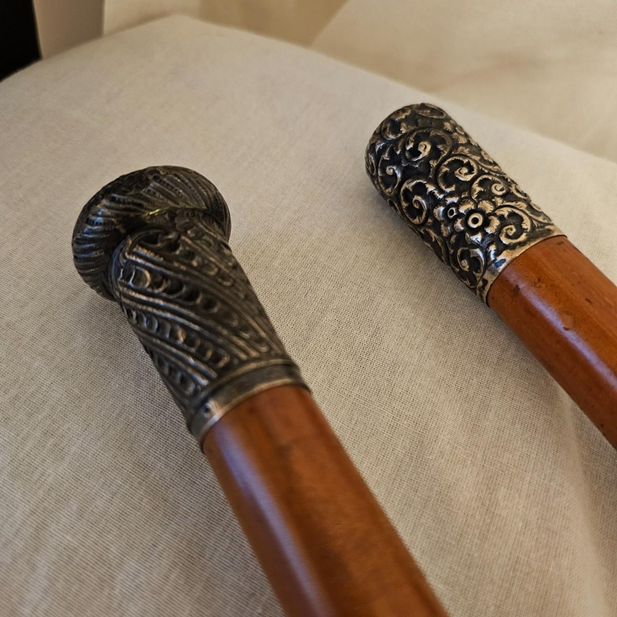 Four wooden shaft walking canes from days gone by. Used to 'stroll along the avenue' in high society. These canes all have metal heads with designs and more. Two have initials engraved into them. The two light wood items have floral and patterned tops. The two black canes tops are marked sterling and stamped on the side of the top piece. All items are well used and two of the canes do not have walking tips. Canes average 34" to 36" in length. See photos for details. Local pickup only.