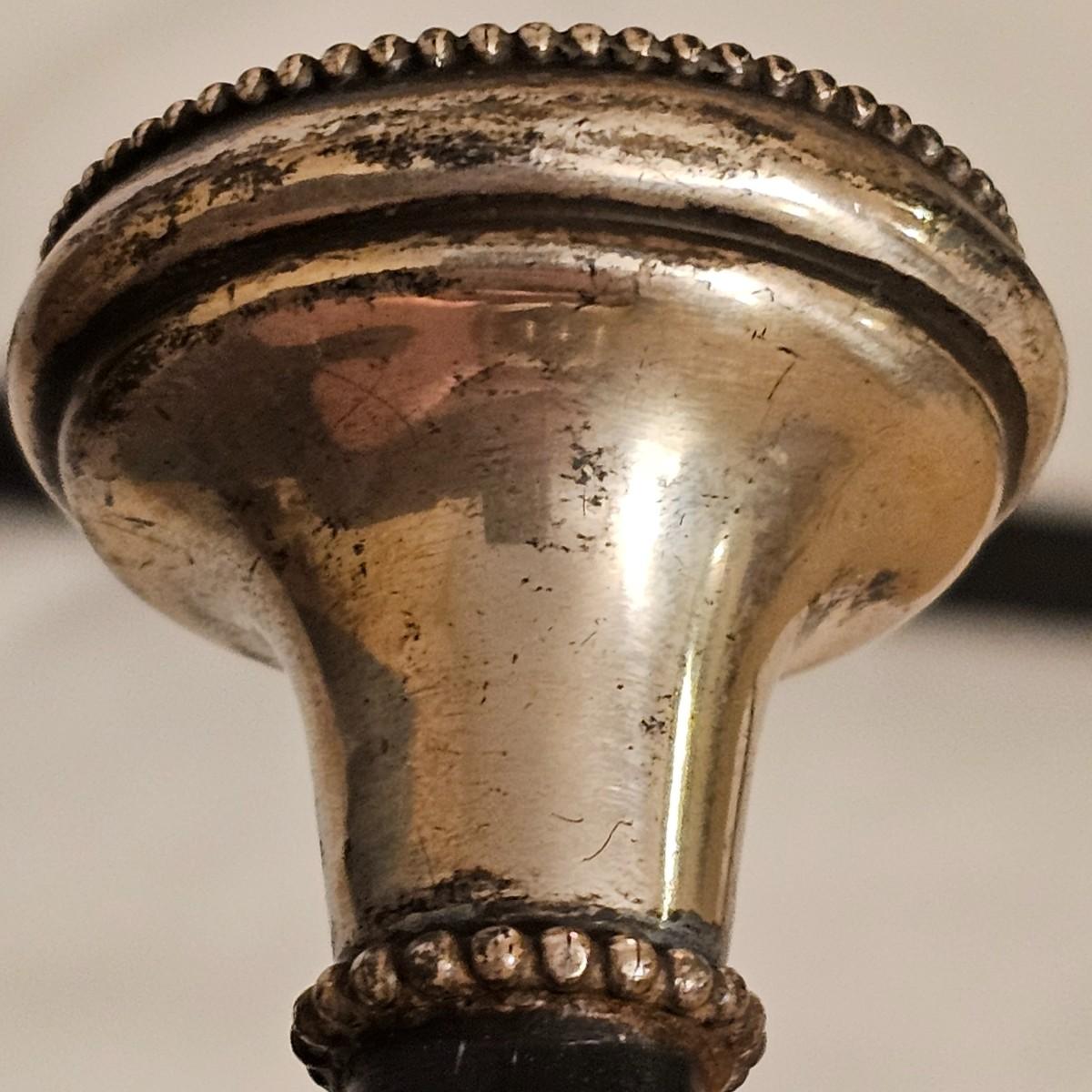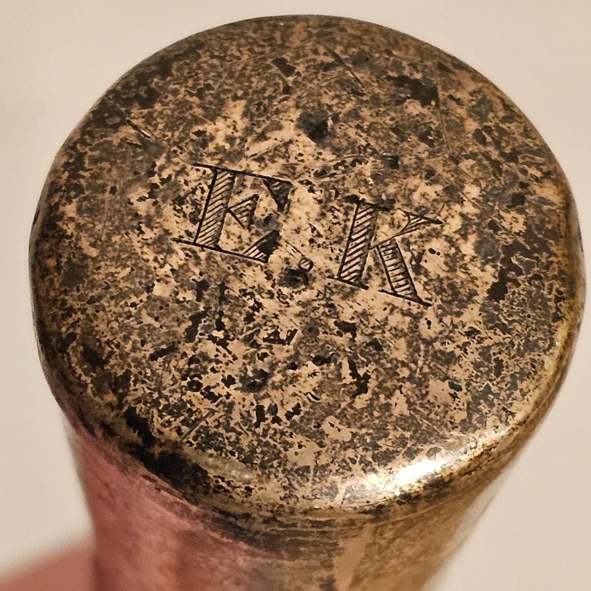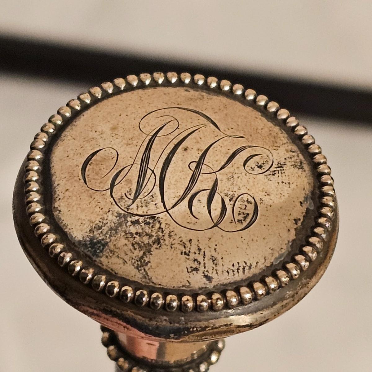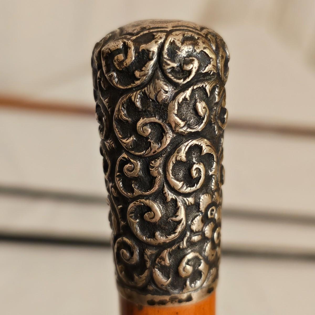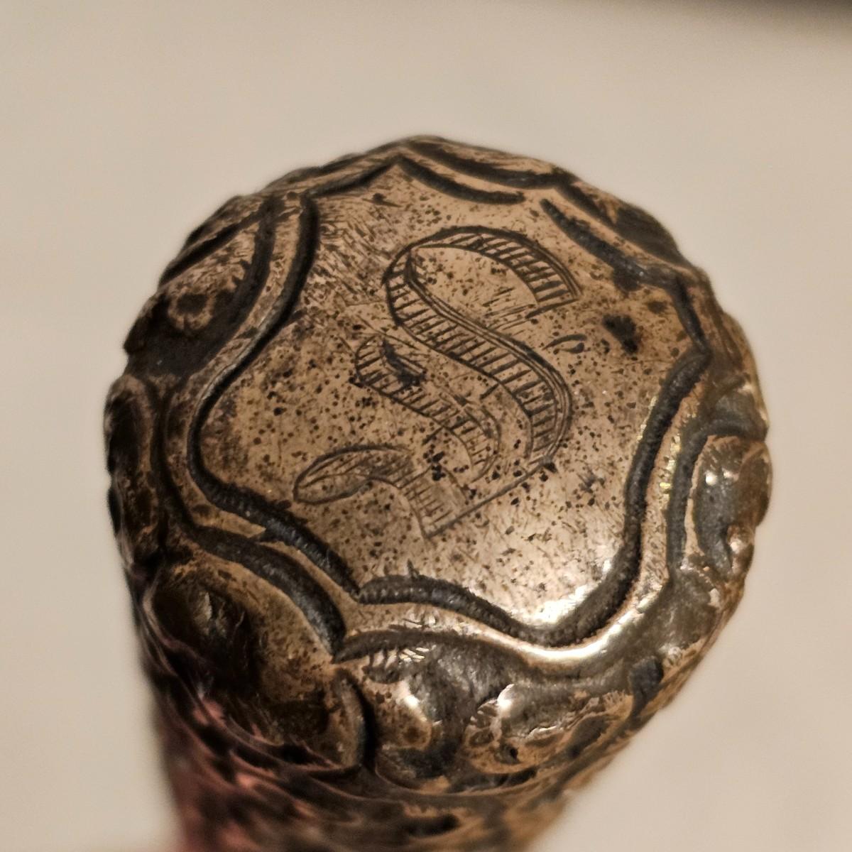 Four wooden shaft walking canes from days gone by. Used to 'stroll along the avenue' in high society. These canes all have metal heads with designs and more. Two have initials engraved into them. The two light wood items have floral and patterned tops. The two black canes tops are marked sterling and stamped on the side of the top piece. All items are well used and two of the canes do not have walking tips. Canes average 34" to 36" in length. See photos for details. Local pickup only.