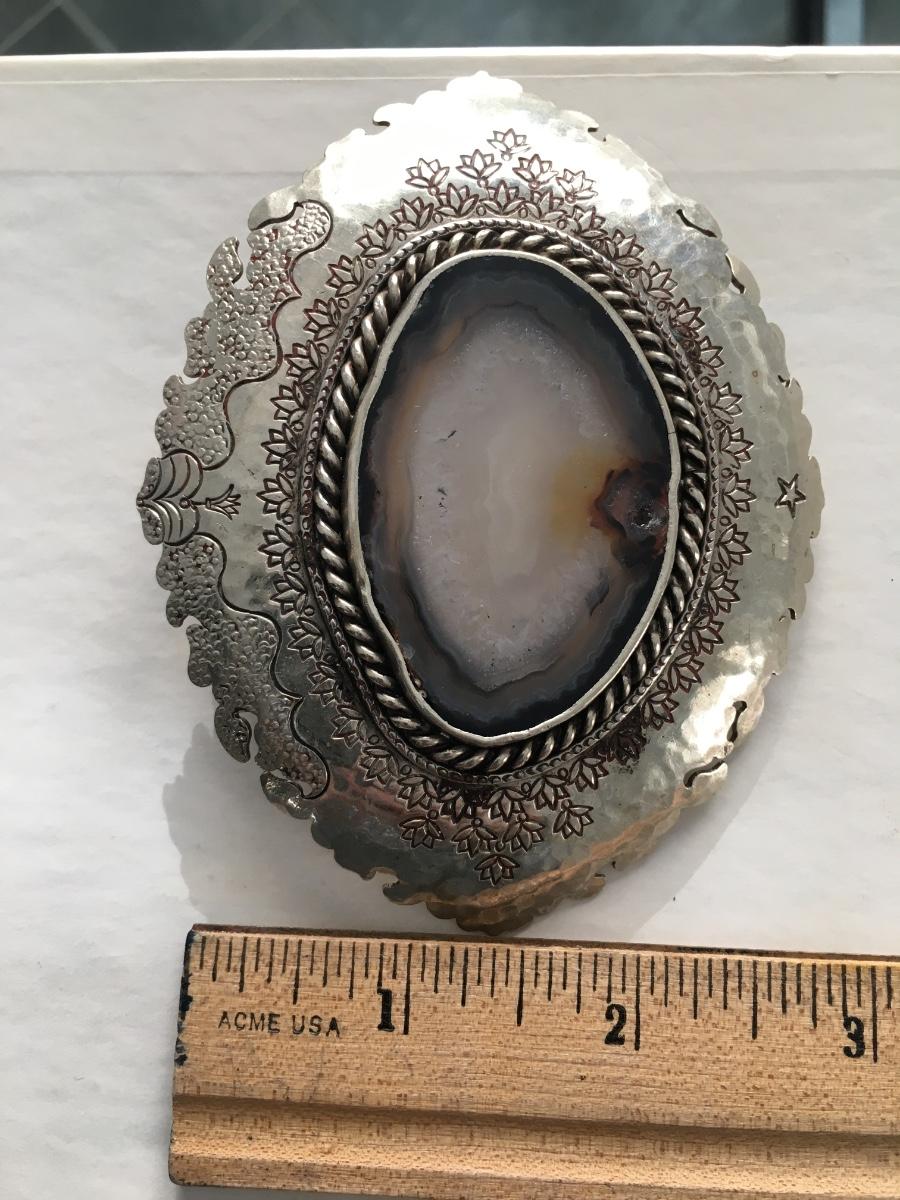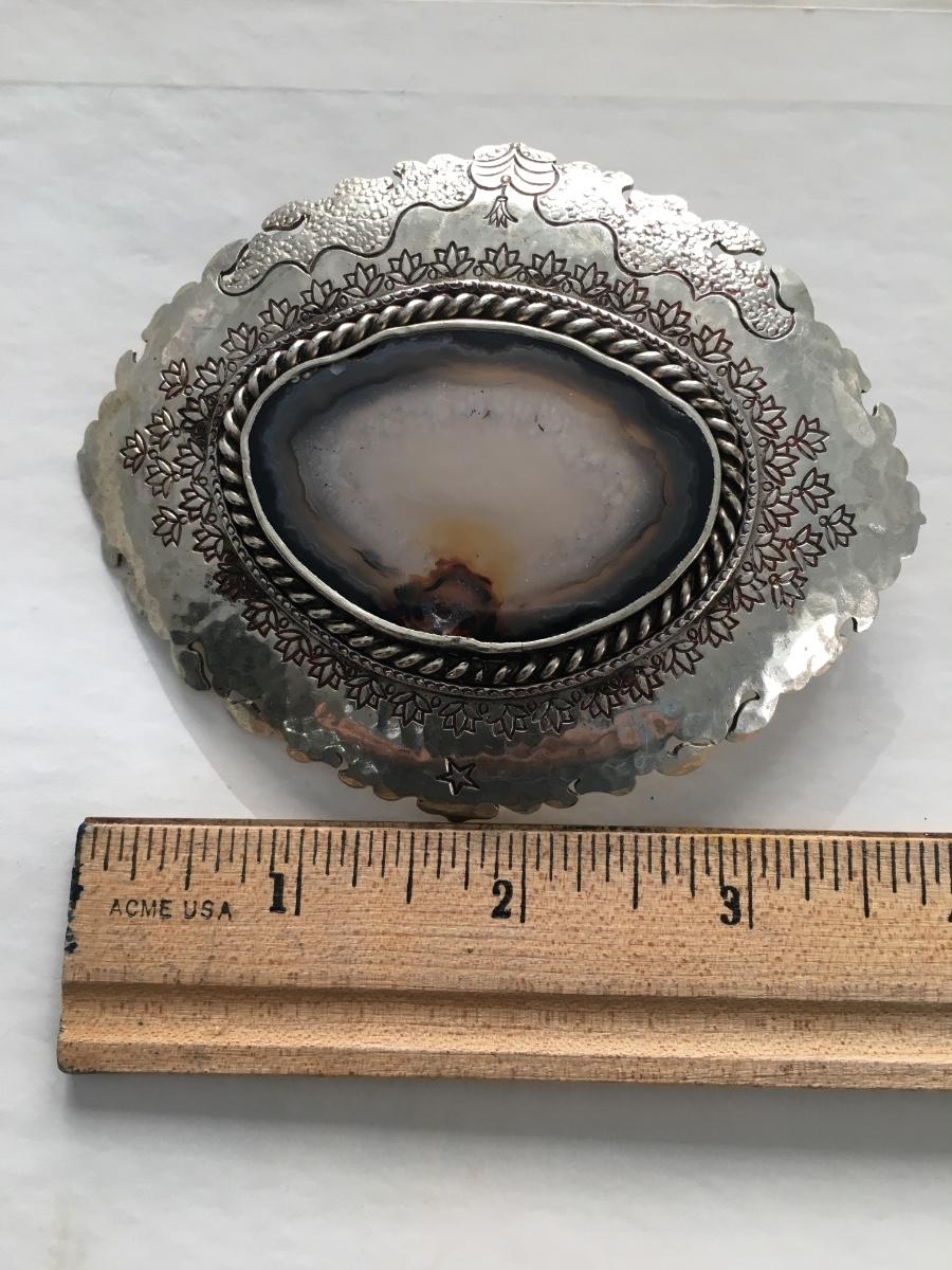 Decorative edged quartz center stone stilver tone belt buckle, unbranded.