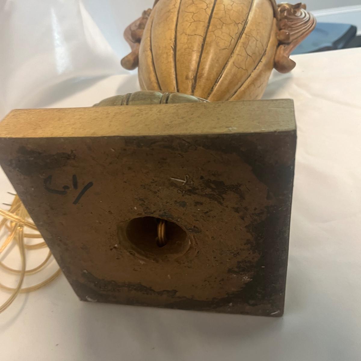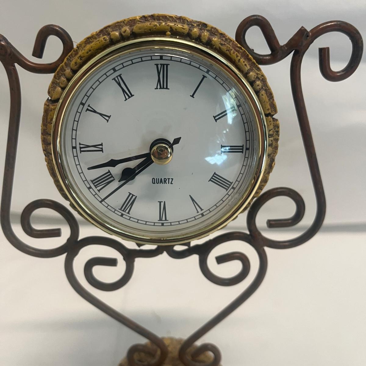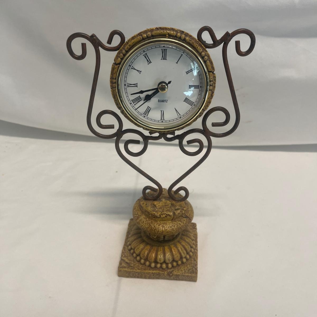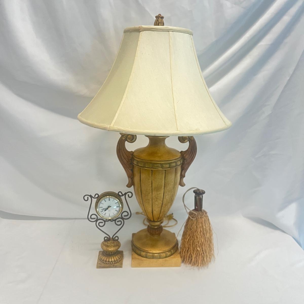 This quartz clock has a resin base with metal body. The miniature broom has a wooden top. Also includes a heavy resin table lamp with on off switch. Lamp powered on when plugged in and measures 11” x 7” x 32”H not including shade. Clock was not tested as it has no battery.