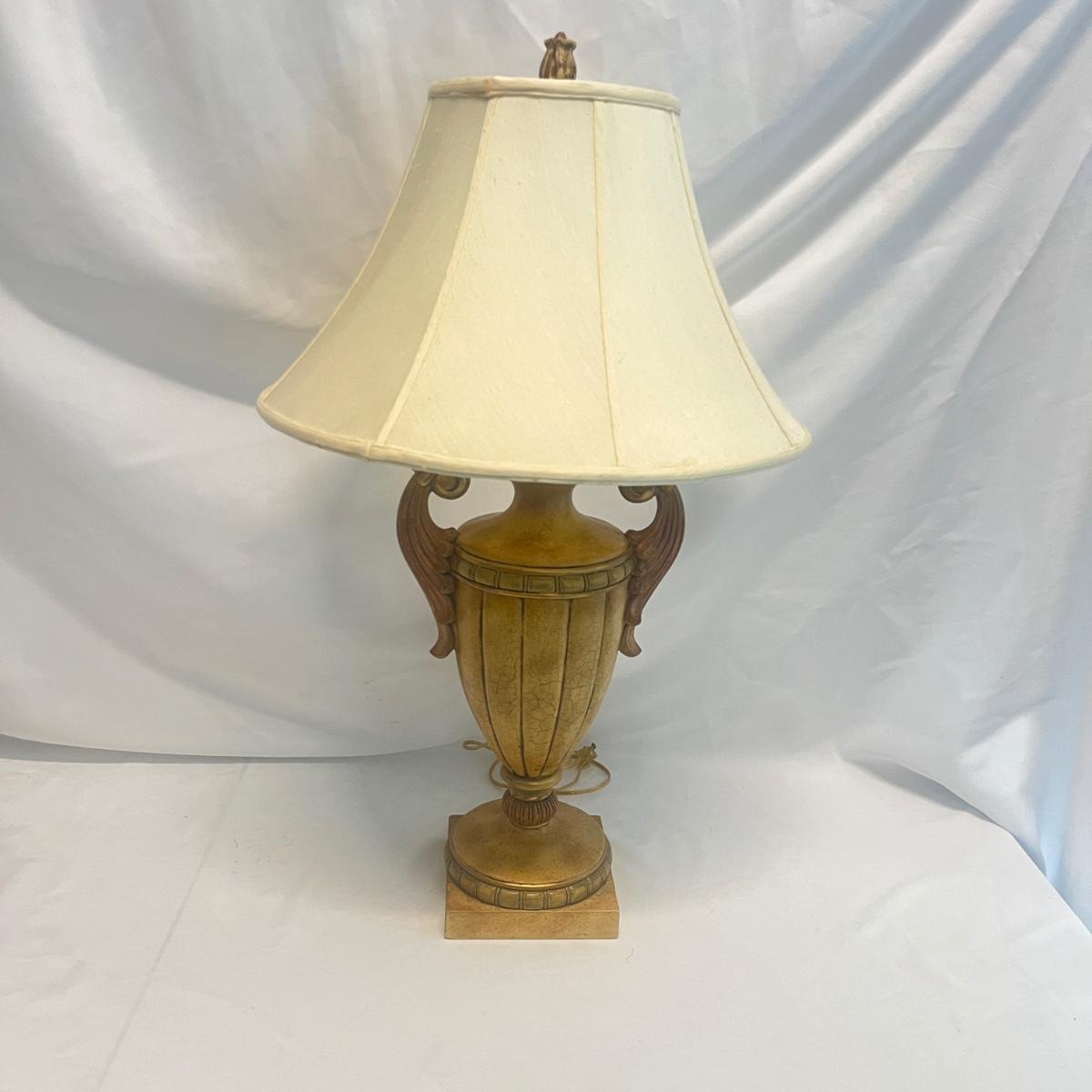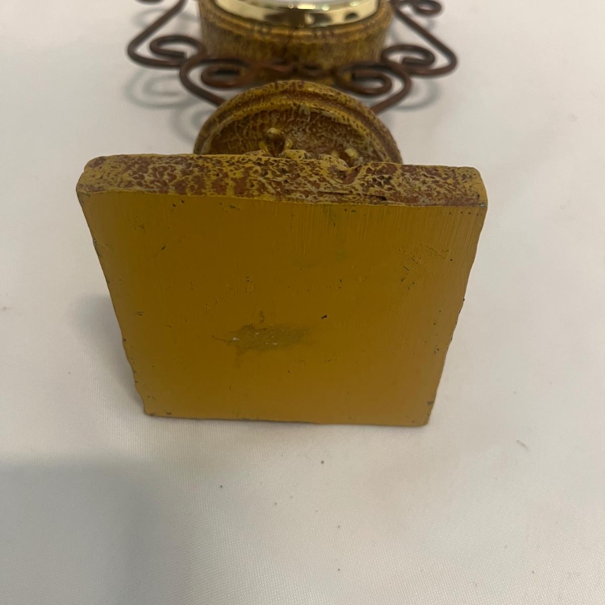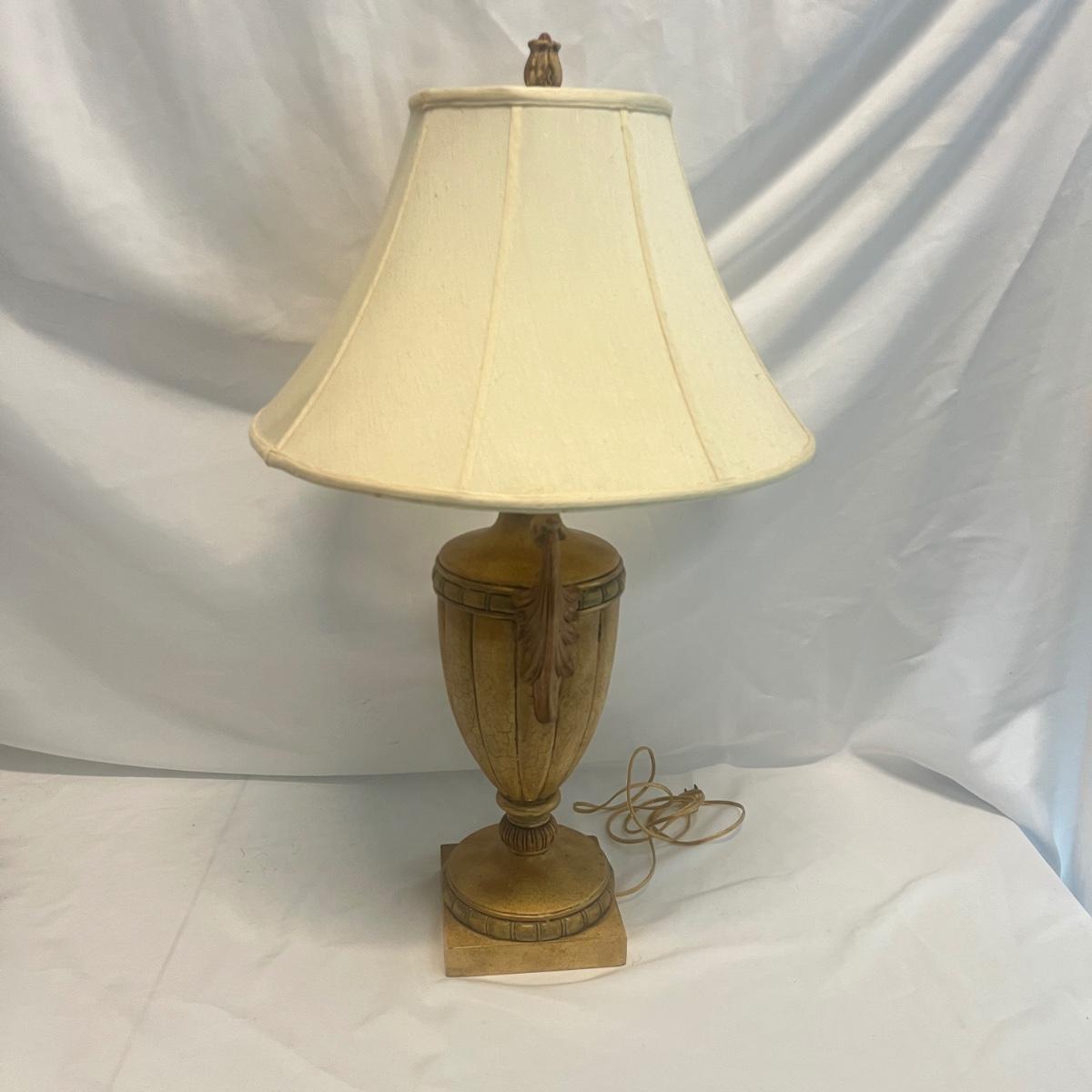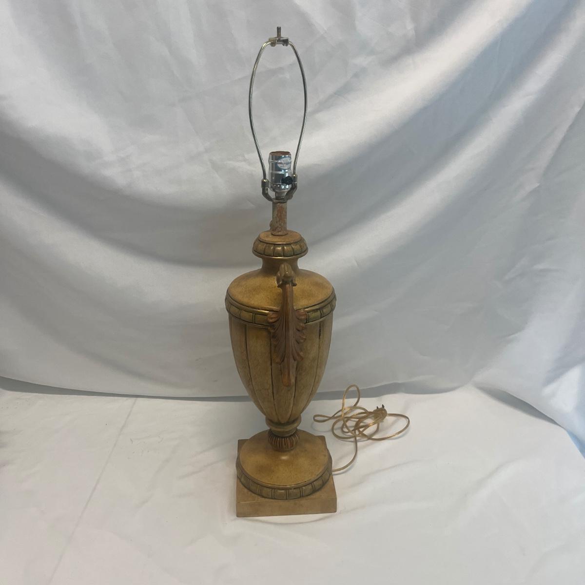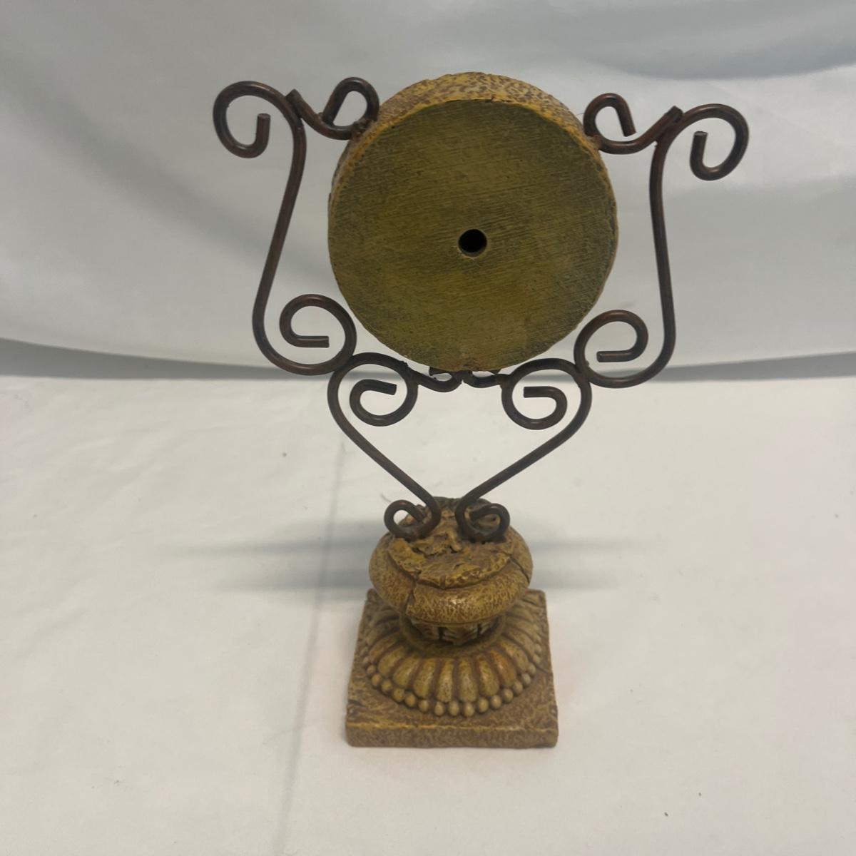 This quartz clock has a resin base with metal body. The miniature broom has a wooden top. Also includes a heavy resin table lamp with on off switch. Lamp powered on when plugged in and measures 11” x 7” x 32”H not including shade. Clock was not tested as it has no battery.