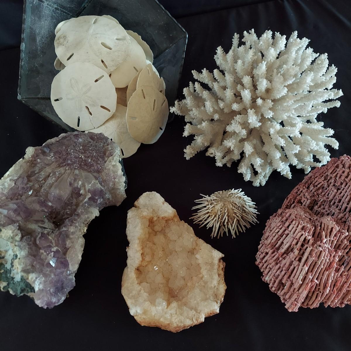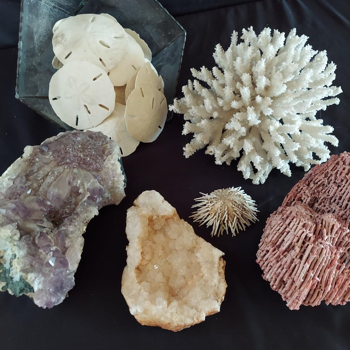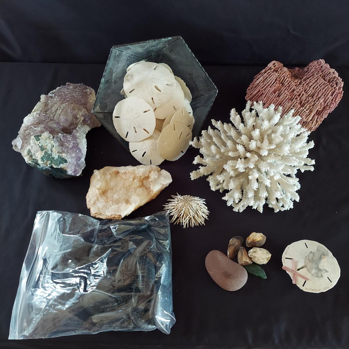 This lot features two skeletons of coral. One appears to be red pipe organ coral and the other spiny coral. The white coral is approximately 4" tall and 7" wide. Two large quartz druzys. One appears to be clear quartz at approximately 5" long and the other a purple amethyst at approximately 7" long. One glass bowl full of sand dollars. One quart bag of 2-3" black polished river rock and assorted small loose stones. Shipping available.