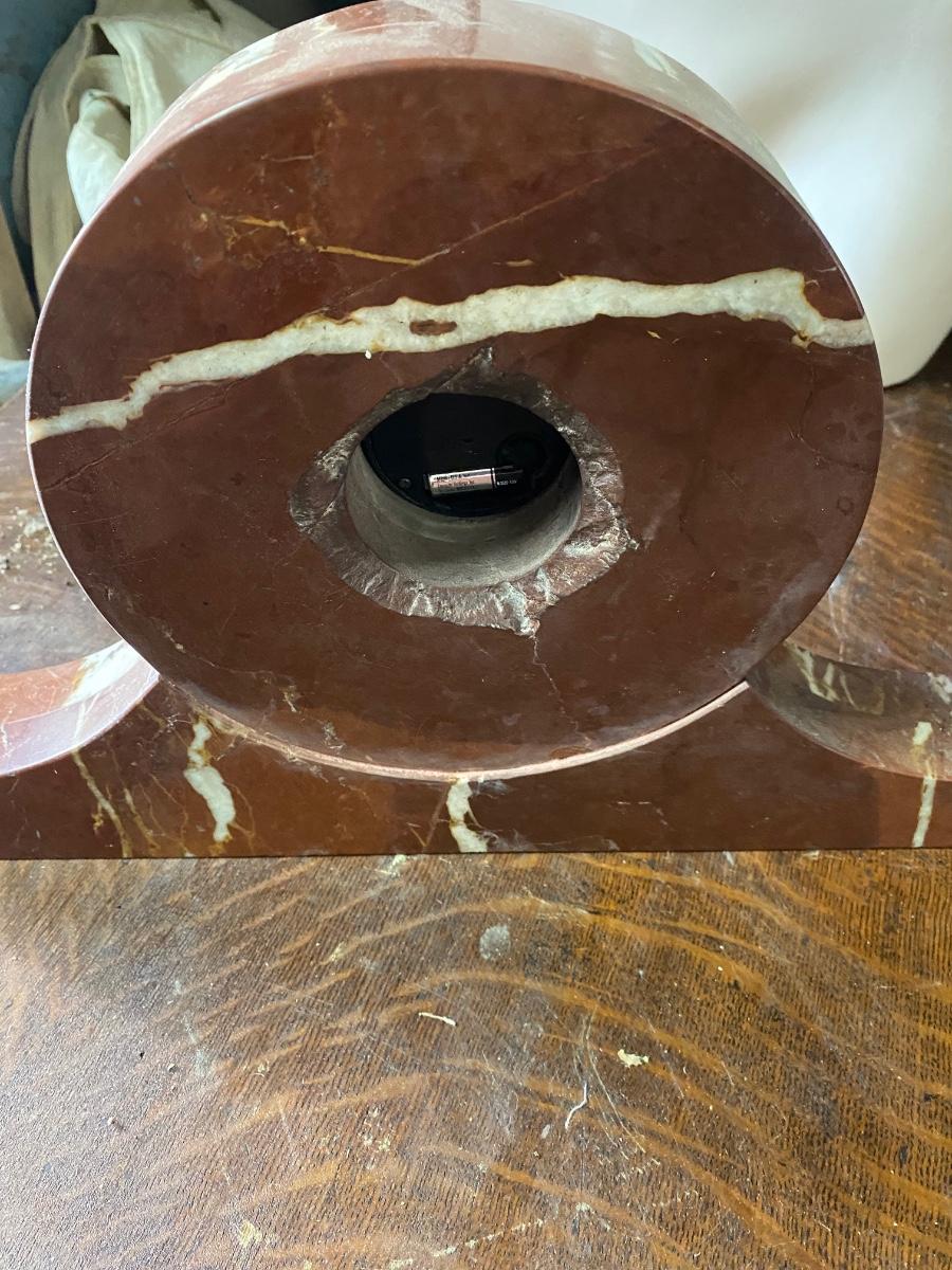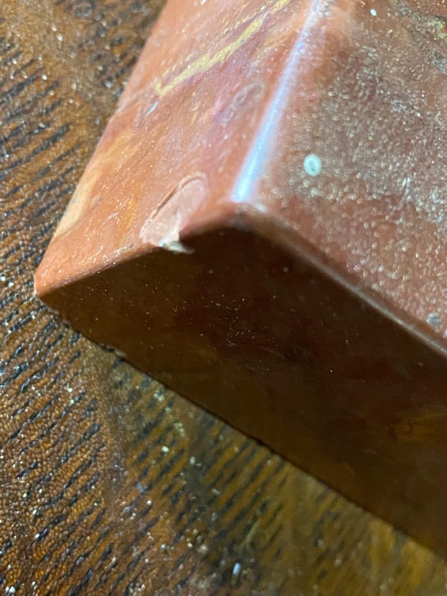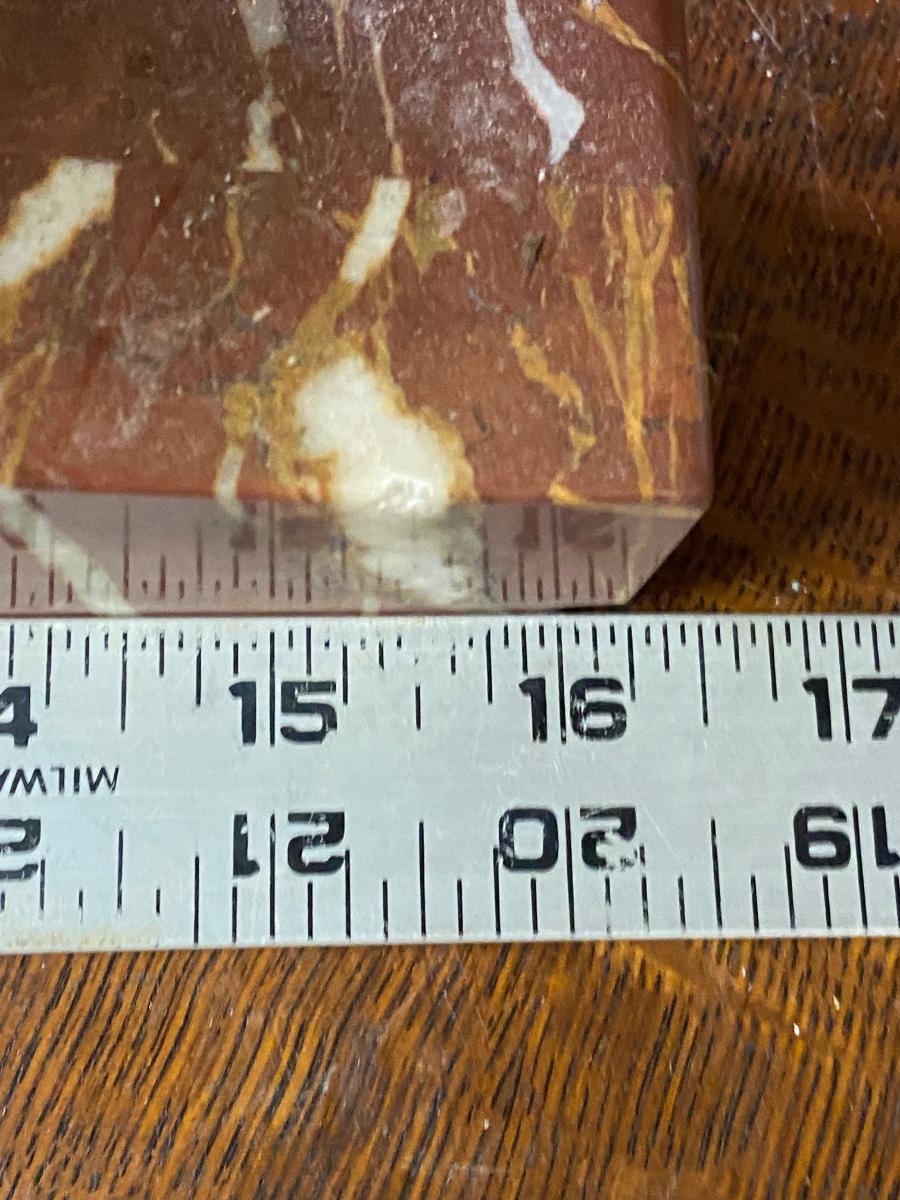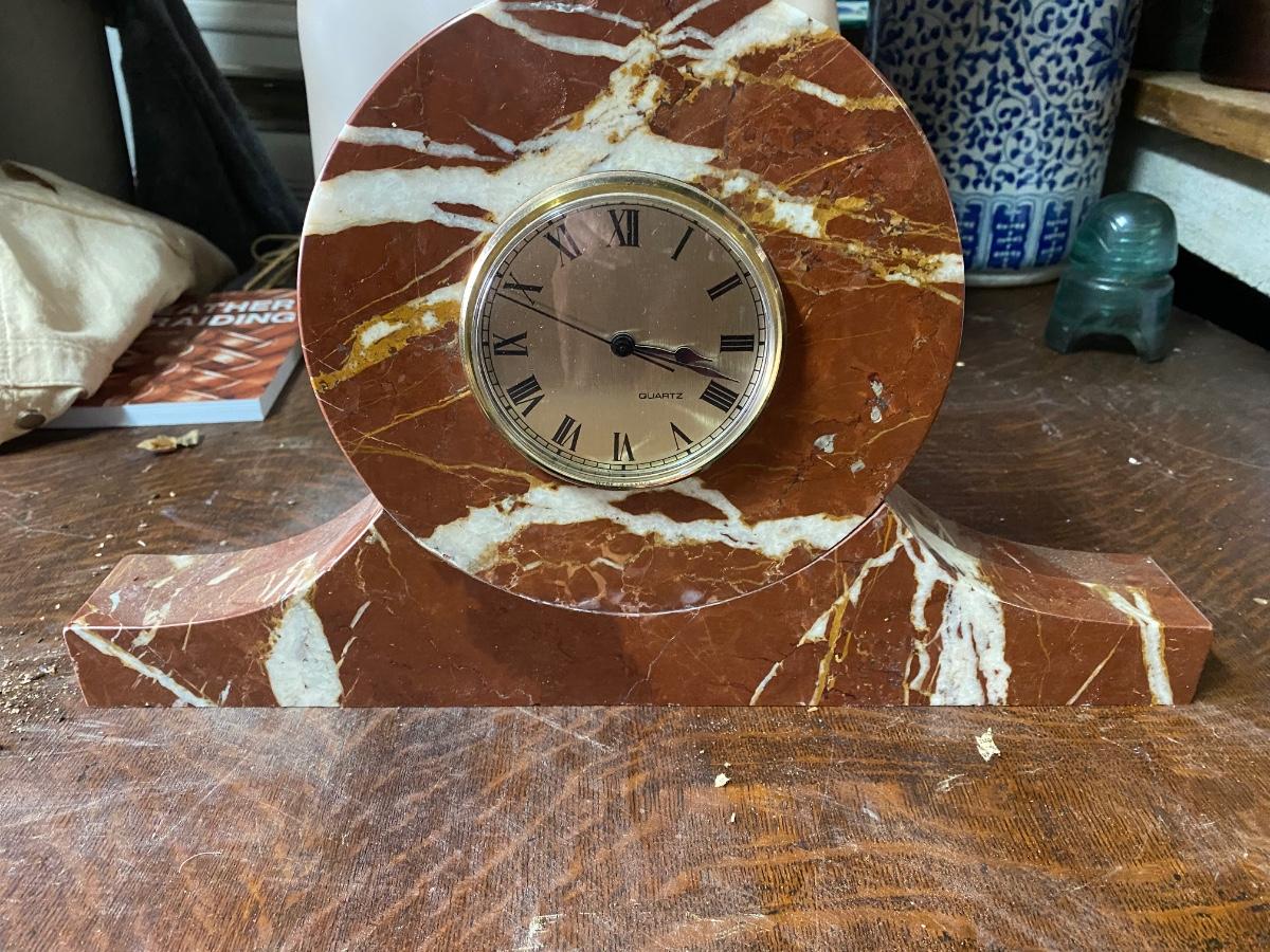 Heavy quartz Mantle clock. Battery operated. Tiny chip as shown in picture. 16.5” long. No backing for battery area