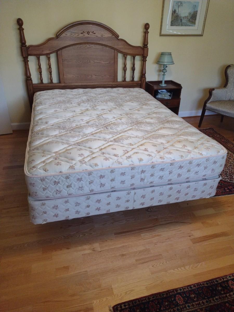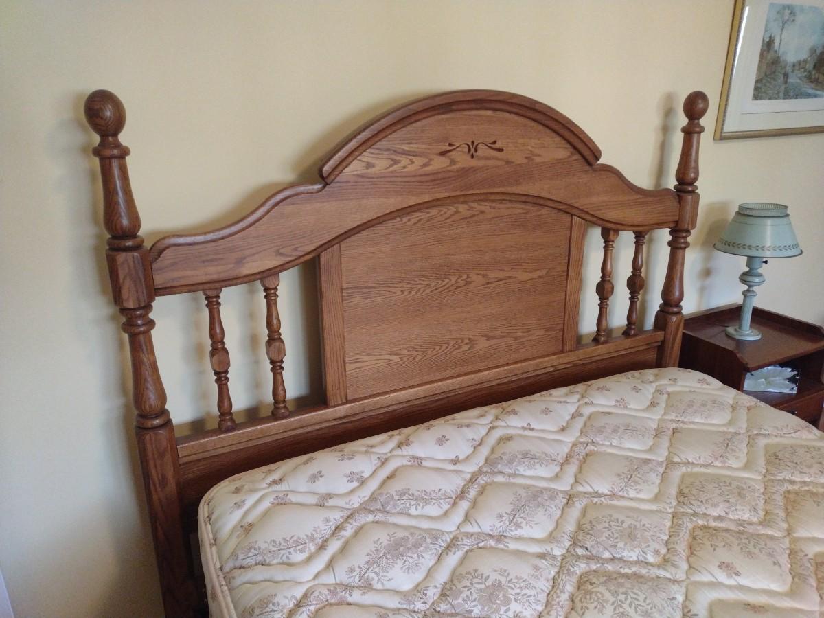 Wood Framed Queen Bed with Mattress Set upstairs item. Bring tools to break down and assistance to remove from home