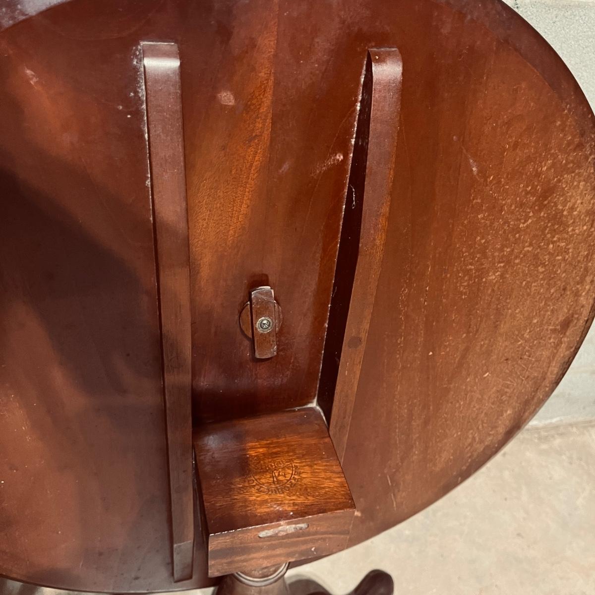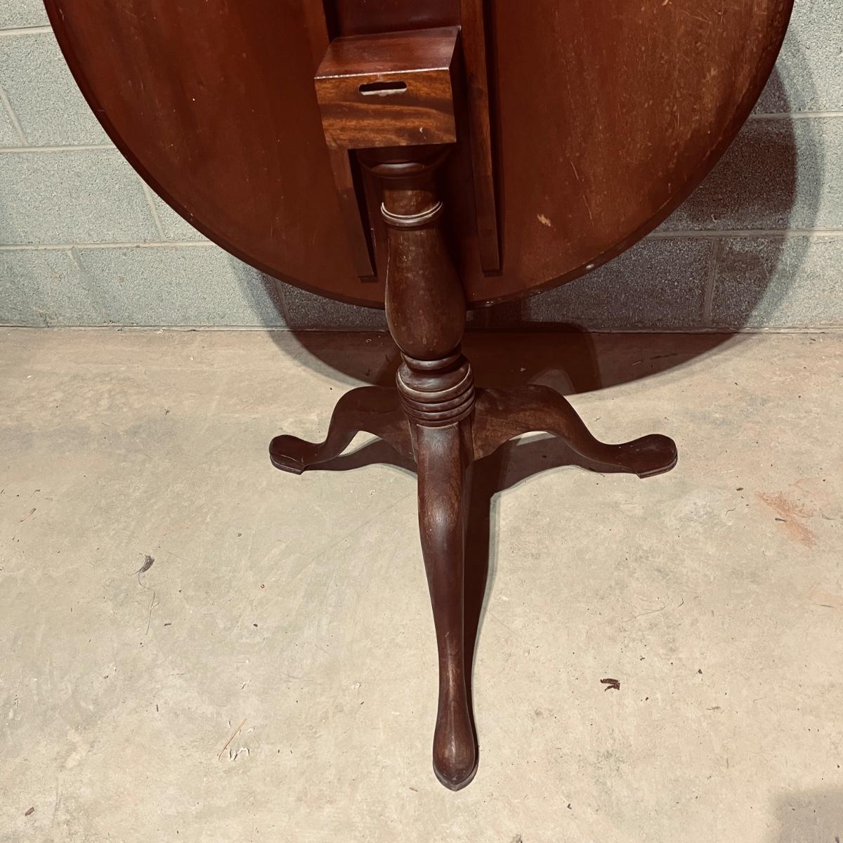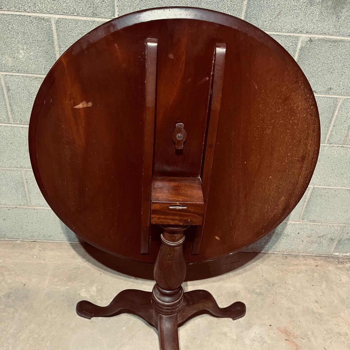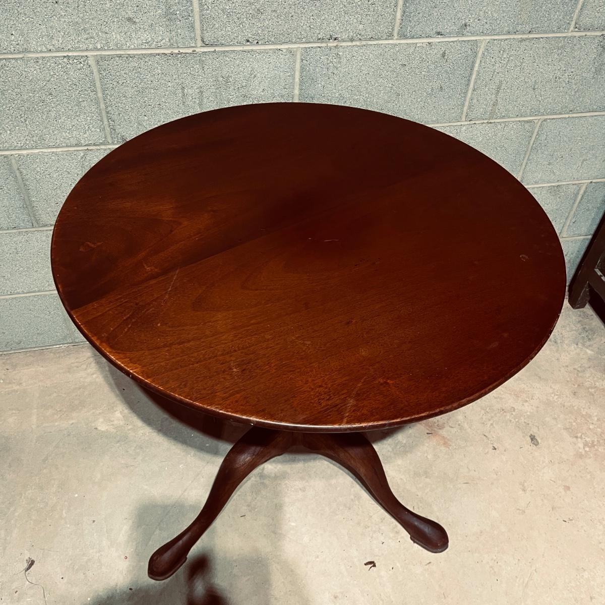 Lot includes a Queen Anne style wooden tilt top table that is made by Norris. Table measures 30”D x 29.5”H. Table has scratches, nicks and imperfections in the finish and the latch is loose, see pictures.