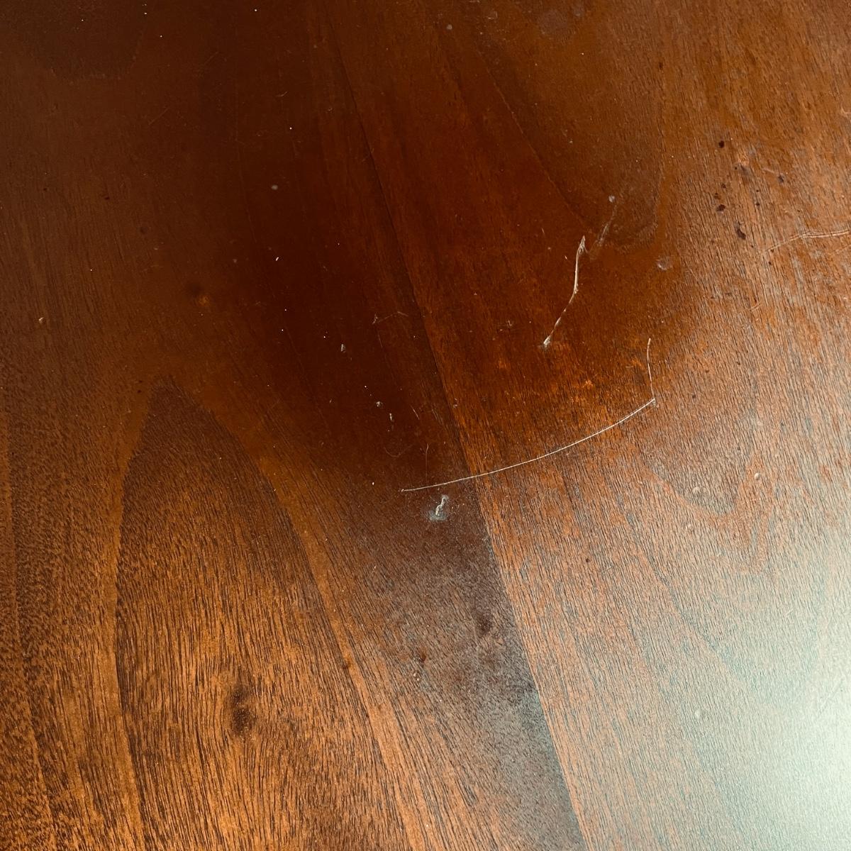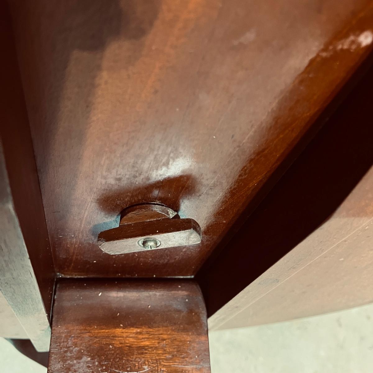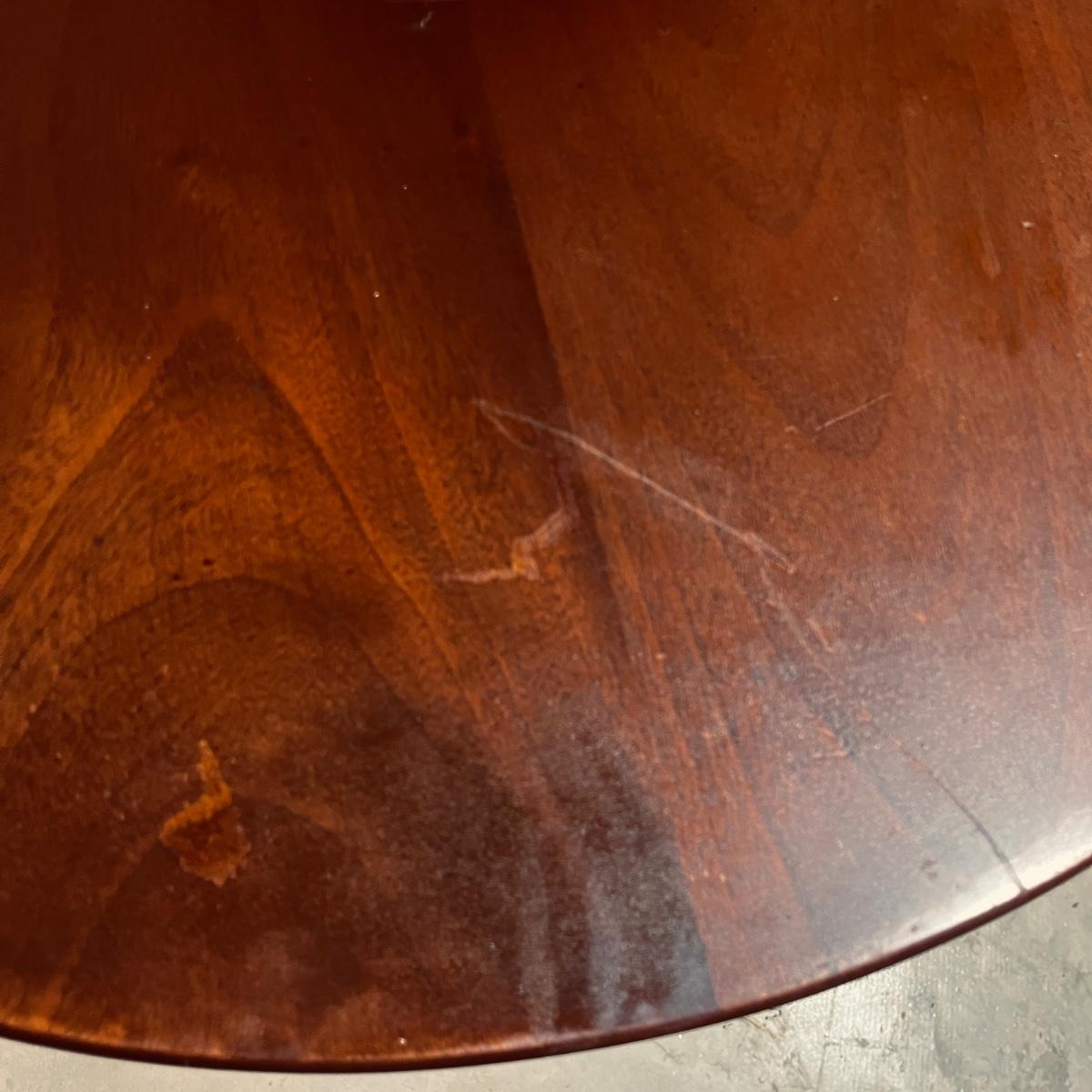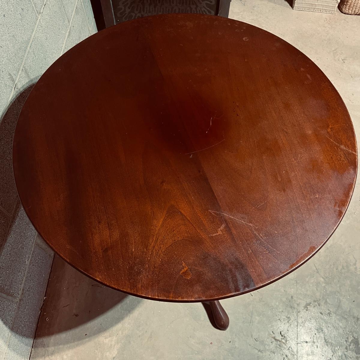 Lot includes a Queen Anne style wooden tilt top table that is made by Norris. Table measures 30”D x 29.5”H. Table has scratches, nicks and imperfections in the finish and the latch is loose, see pictures.