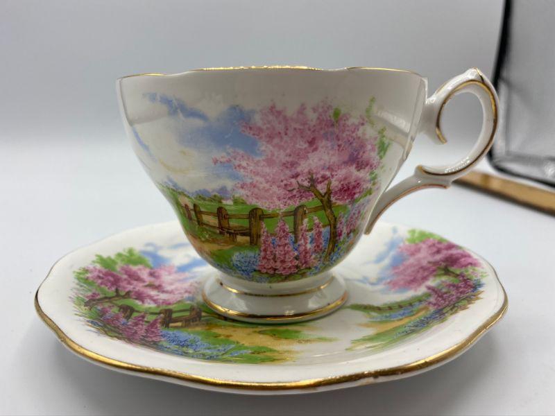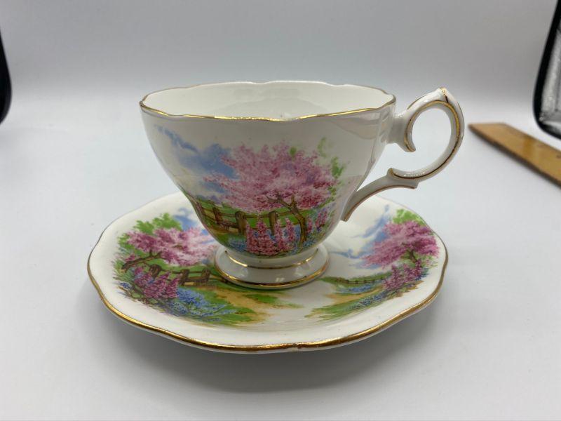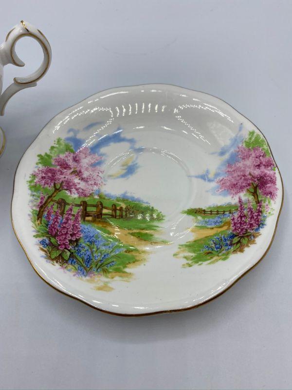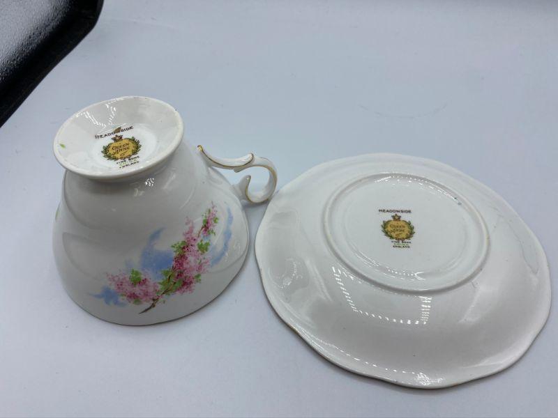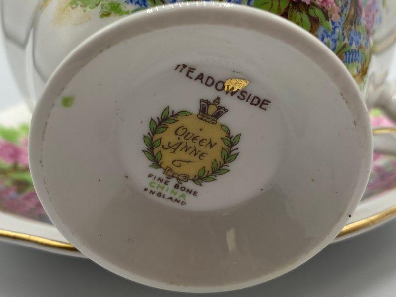 Beautiful Queen Anne China Tea Cup & Saucer. "Meadowside" pattern. Great condition. Both piece are stamped on the bottom.