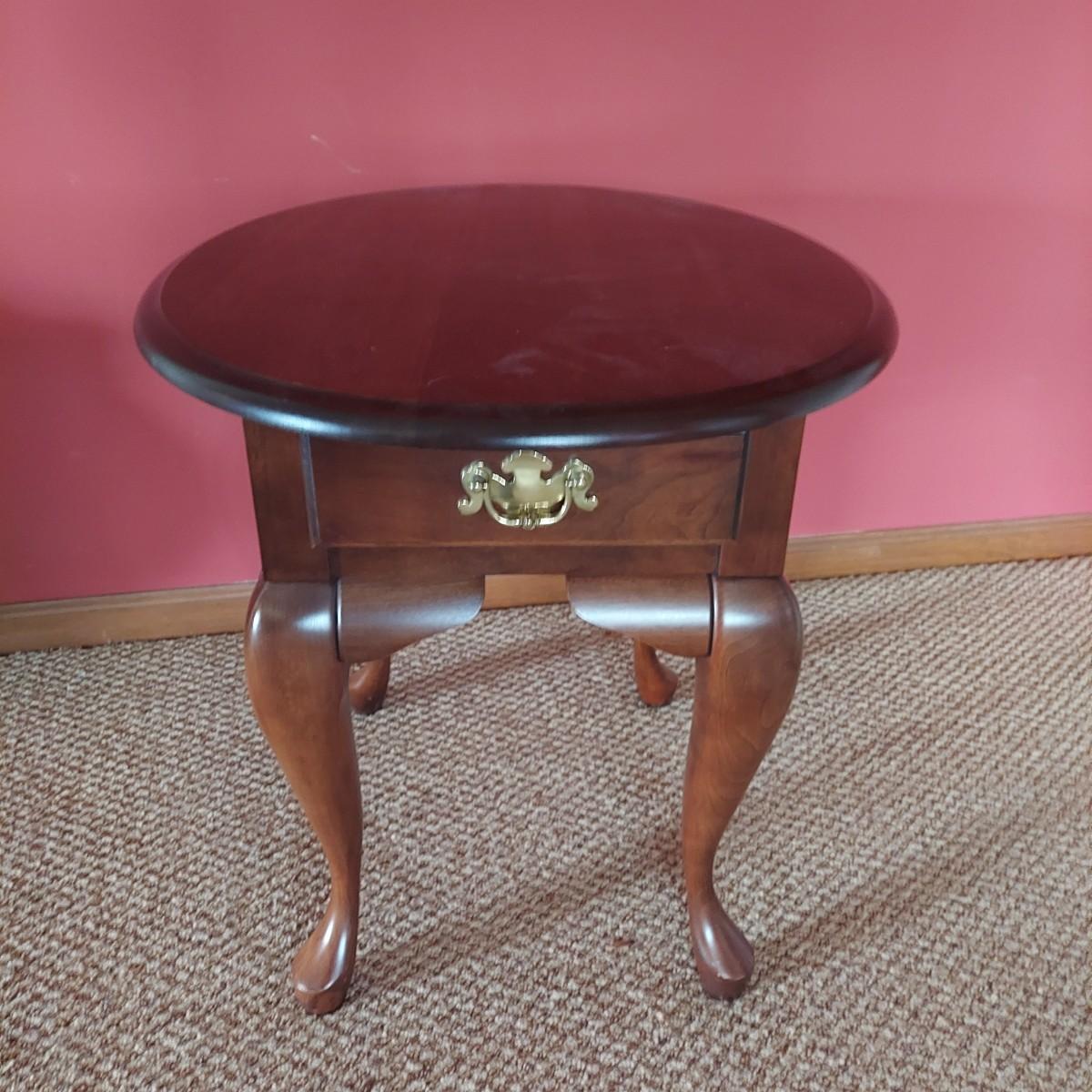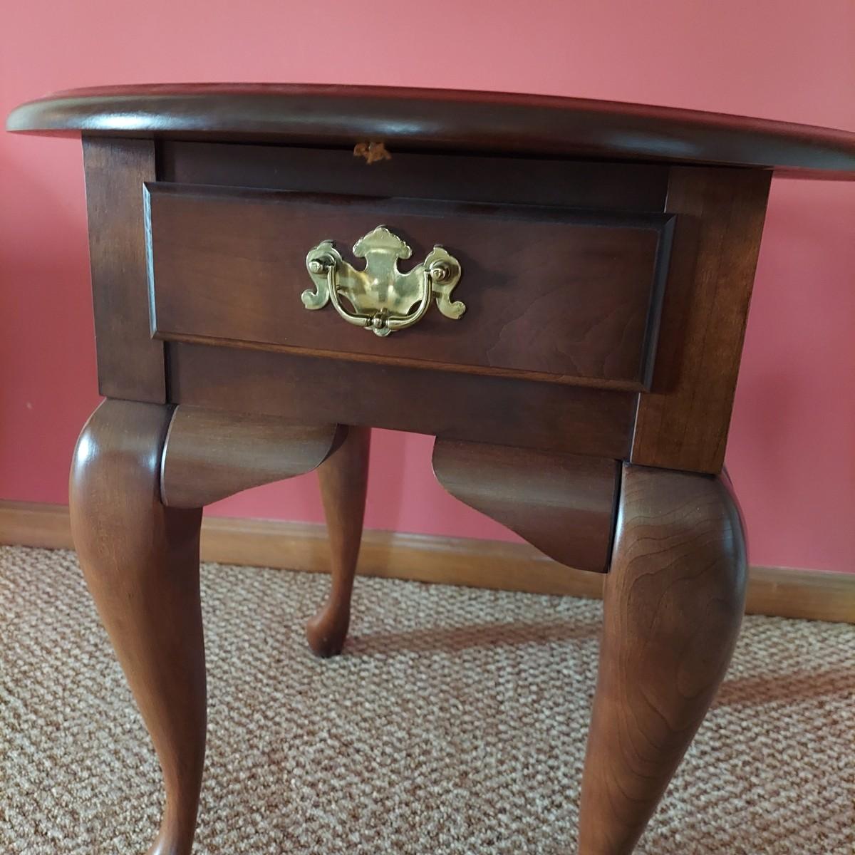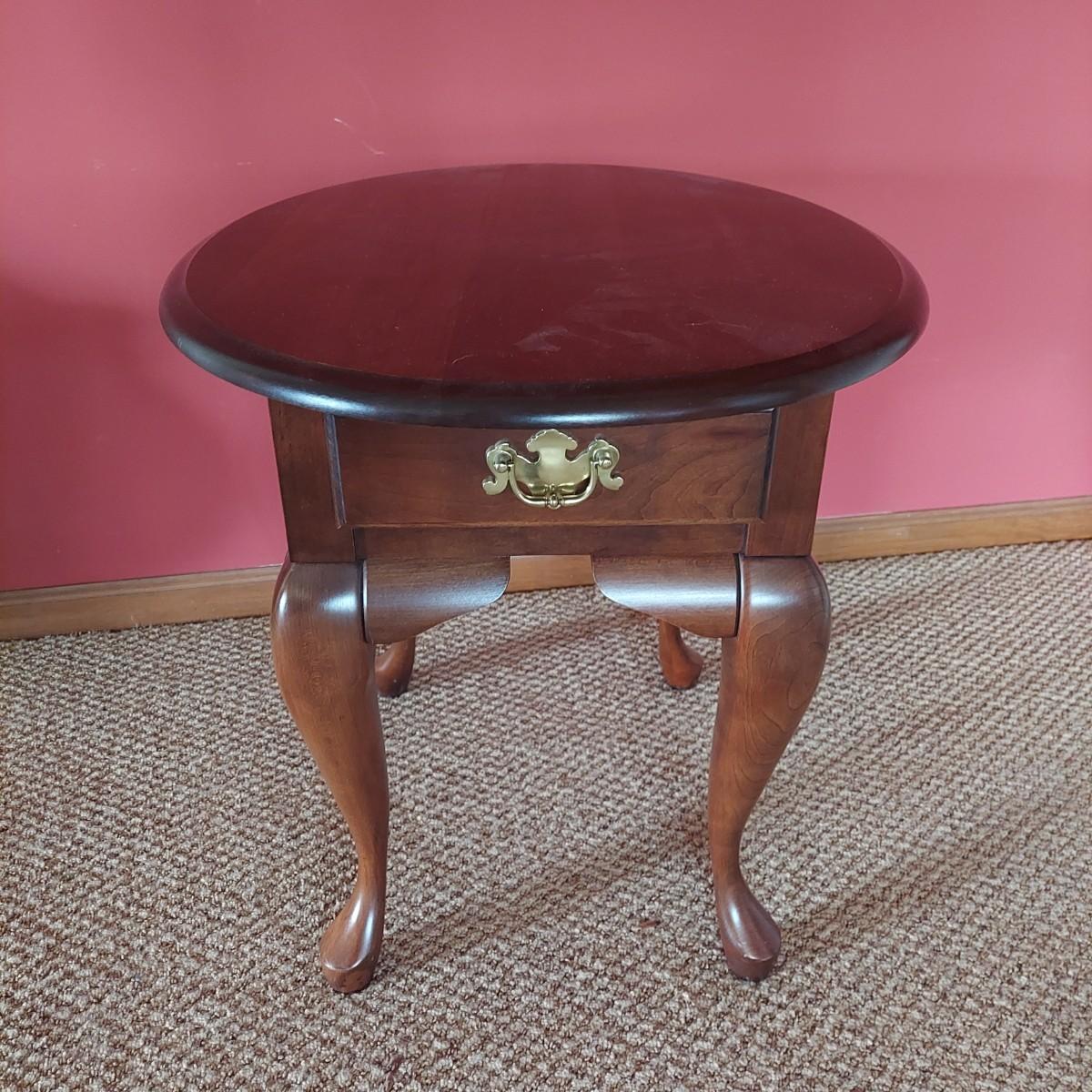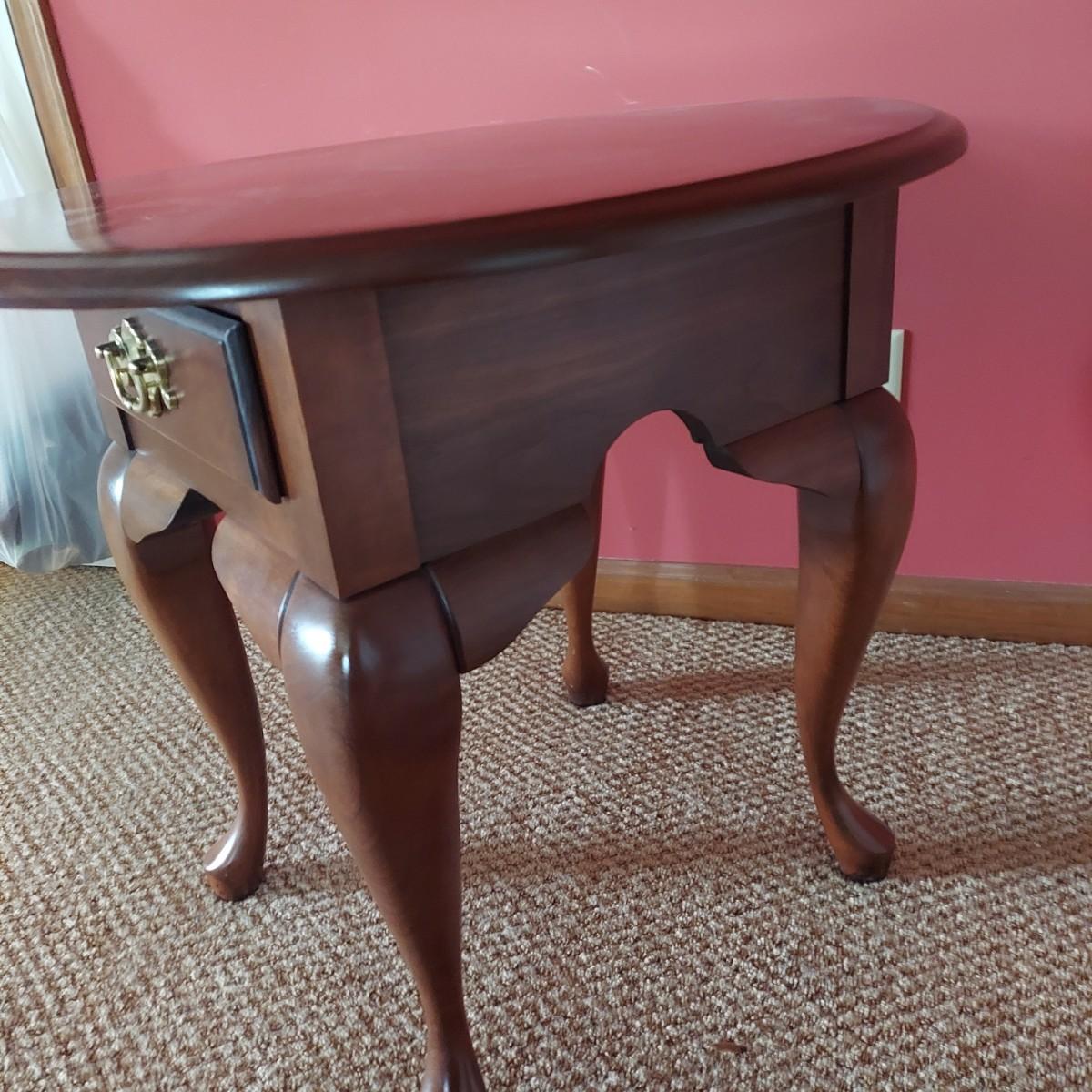 Wooden side table with drawer. Reproduction Queen Anne style. No markings. Has some cardboard and staples on bottom side. Measures 22” x 26” x 23"H. Local Pickup Only