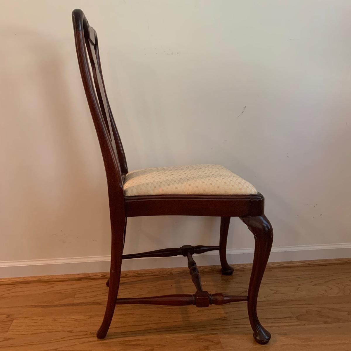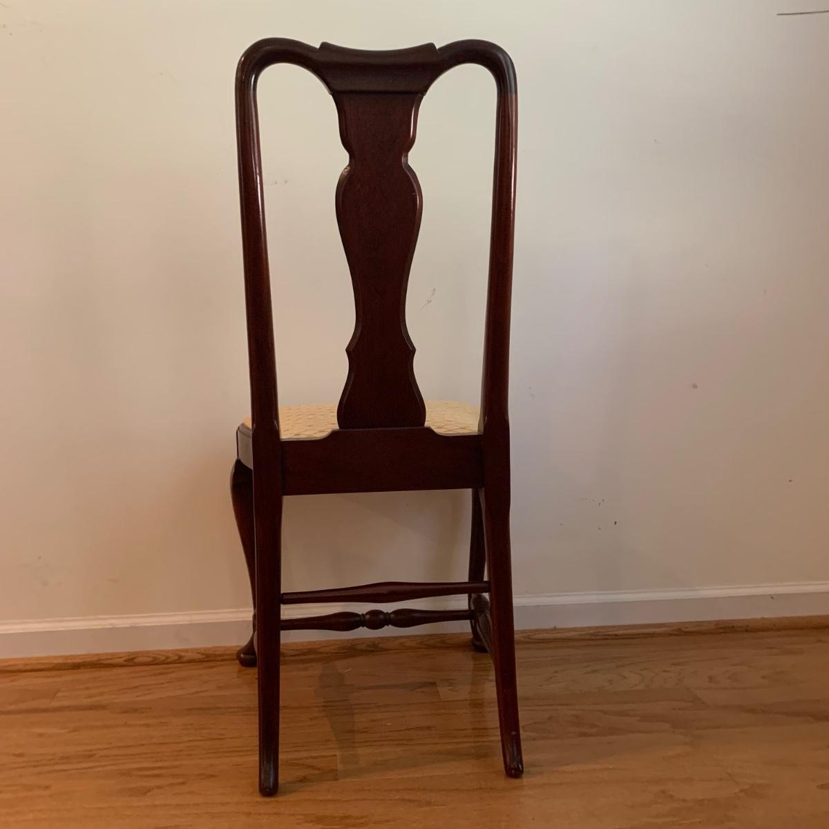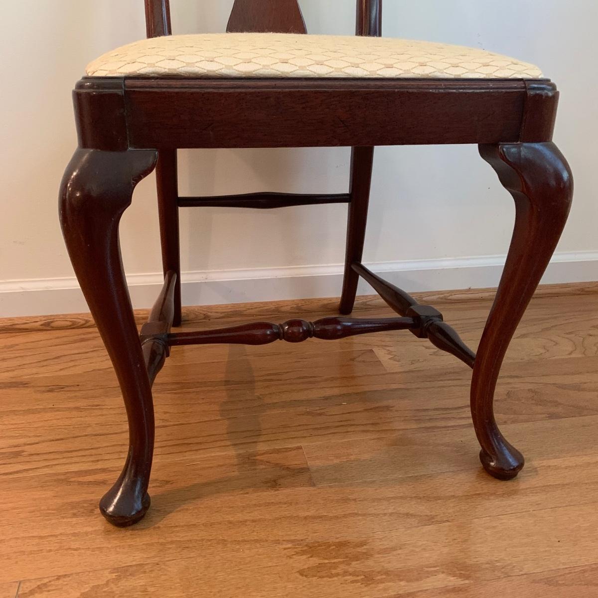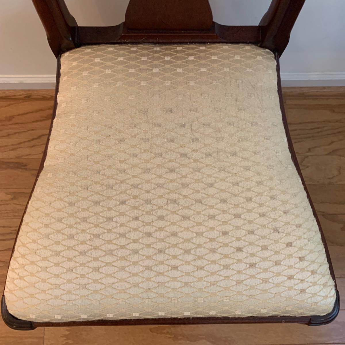 This lovely Queen Anne style splat back chair is made of a dark reddish-brown lustrous wood. It has a soft padded cushion that is a light creamy golden color. The seat height is 18”. The seat is 17” wide and 15” deep. The top of the back is 35” tall. It is in used but good condition. There is a tiny bit of hair on the cushion from the previous owner’s pet, as well as a few very small nicks in the wood. The framed print appears to feature the Biltmore Estate. It is double matted and has an ornate frame. The frame appears to be wood painted gold. The frame measures 13.75” x 12.5” and has a wire on the back for hanging. There is also a piece of decor made of natural reed-like material. It is 36” tall. Local pickup only.