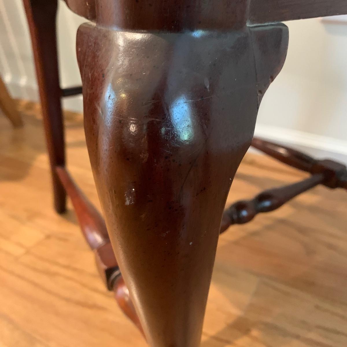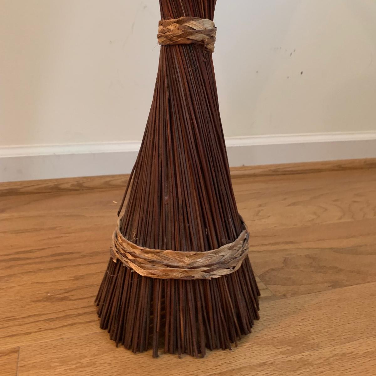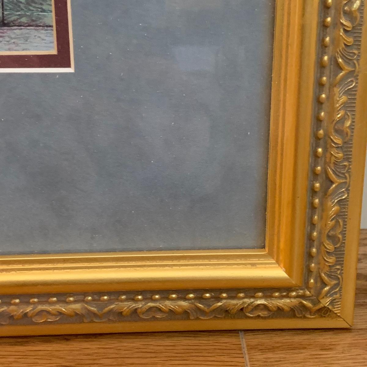 This lovely Queen Anne style splat back chair is made of a dark reddish-brown lustrous wood. It has a soft padded cushion that is a light creamy golden color. The seat height is 18”. The seat is 17” wide and 15” deep. The top of the back is 35” tall. It is in used but good condition. There is a tiny bit of hair on the cushion from the previous owner’s pet, as well as a few very small nicks in the wood. The framed print appears to feature the Biltmore Estate. It is double matted and has an ornate frame. The frame appears to be wood painted gold. The frame measures 13.75” x 12.5” and has a wire on the back for hanging. There is also a piece of decor made of natural reed-like material. It is 36” tall. Local pickup only.