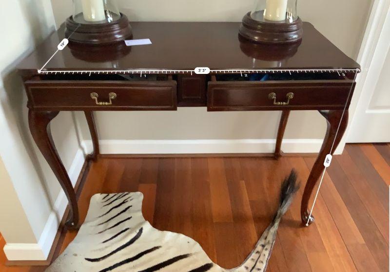 Solid wood queen anne side/console table with ornate brass and 2 x drawers.