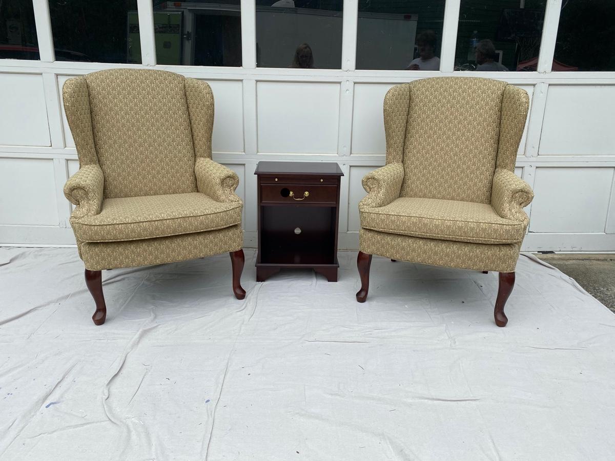 2 Beautiful, High-Quality Queen Anne Wing Chairs with wood feet. Outer covering 52% Polyester and 48% Cotton. 32”Wx31”Dx42”H; Originally purchased from Best Chairs, Inc. No damage or discoloration.