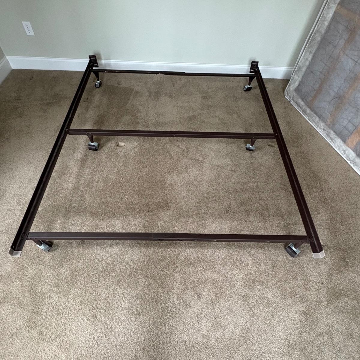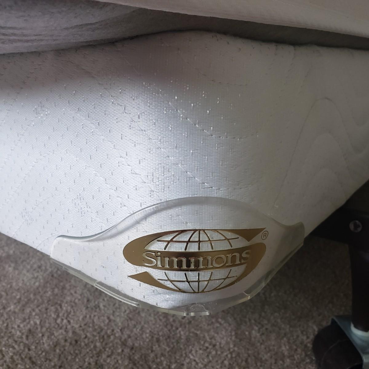 Basic metal queen bed frame appears to be adjustable. Is 60" x 71” as assembled in photos. The Simmons pillow top mattress and box spring are available to the winning bidder, but the winning bidder is not required to take them. Local pickup only.